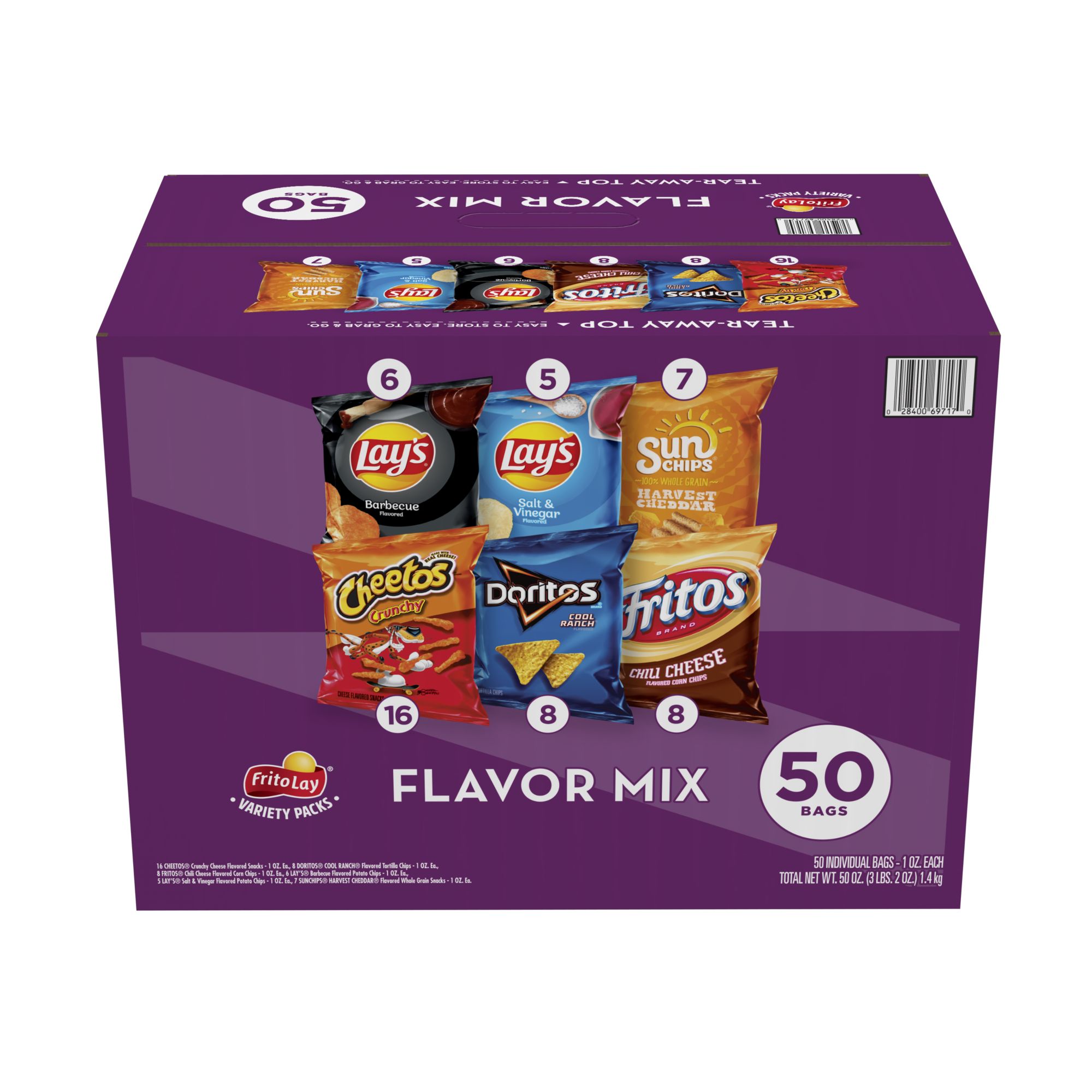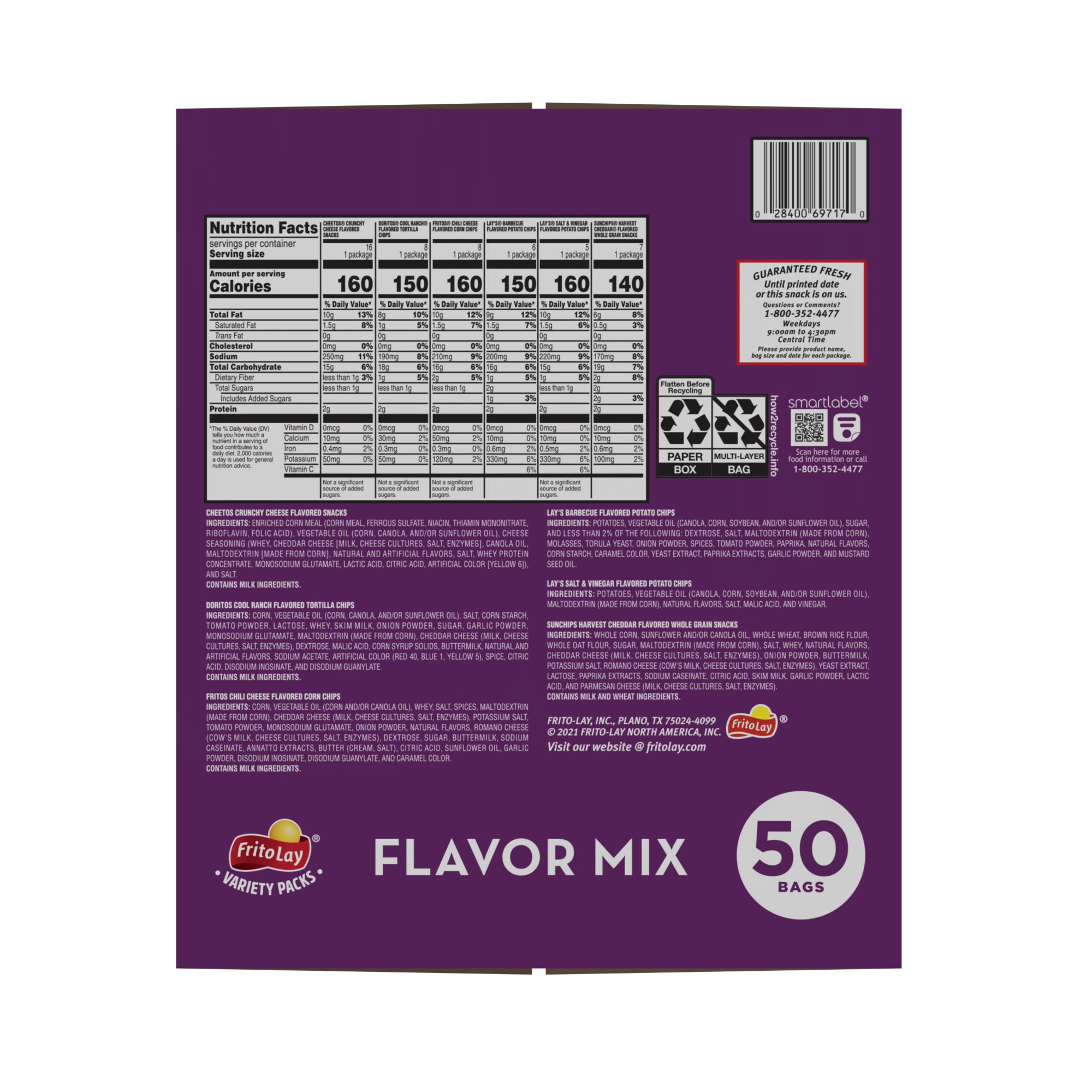 50 bags of snacks in one convenient pack Variety pack lets you choose your favorite - there's something for everyone Single-serve packs help with portion control Includes sixteen 1 oz. bags of Cheetos crunchy cheese flavored snacks, eight 1 oz. bags of Doritos cool ranch-flavored potato chips, eight 1 oz. bags of Fritos chili cheese flavored corn chips, six 1 oz. bags of lay's barbecue flavored potato chips, five 1 oz. bags of lay's salt and vinegar flavored potato chips, and seven 1 oz. bags of sun chips harvest cheddar flavored whole grain snacks