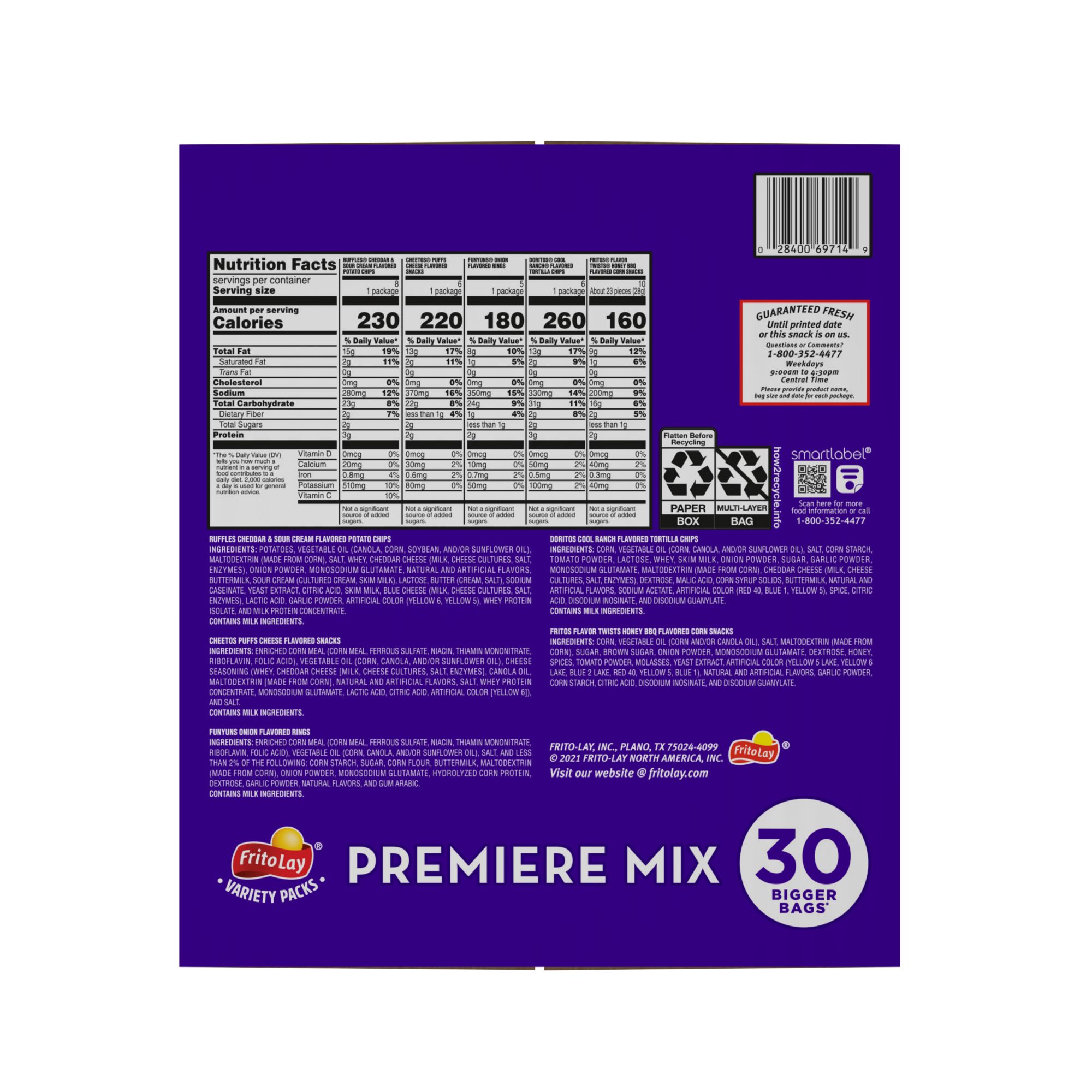 30 bags of snacks in one convenient pack Variety pack lets you choose your favorite - there's something for everyone Single-serve packs help with portion control Includes eight 1.5 oz. bags of ruffles cheddar & sour cream flavored potato chips, six 1.375 oz. bags of Cheetos puffs cheese flavored snacks, five 1.25 oz. bags of fungus onion flavored rings snacks, six 1.75 oz. bags of Doritos cool ranch-flavored tortilla chips, and five 2 oz. bags of Fritos flavor twists honey BBQ flavored corn snacks