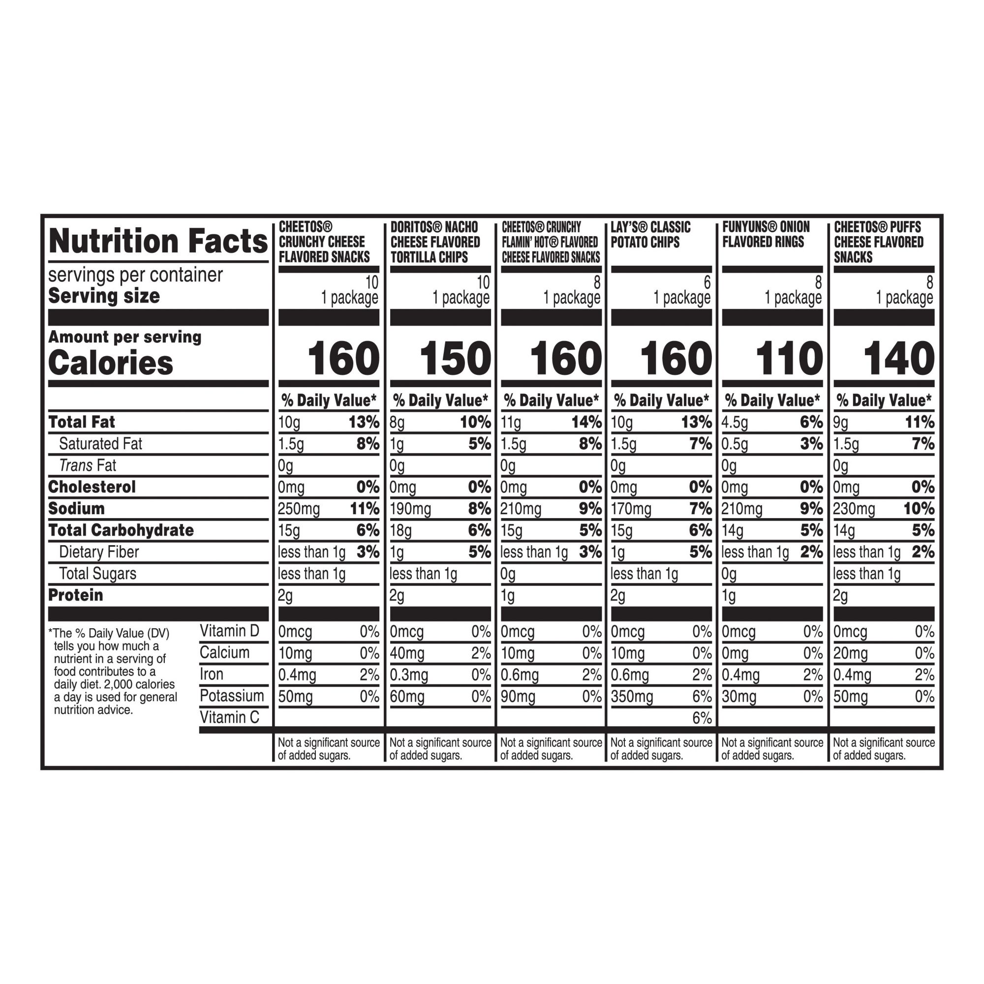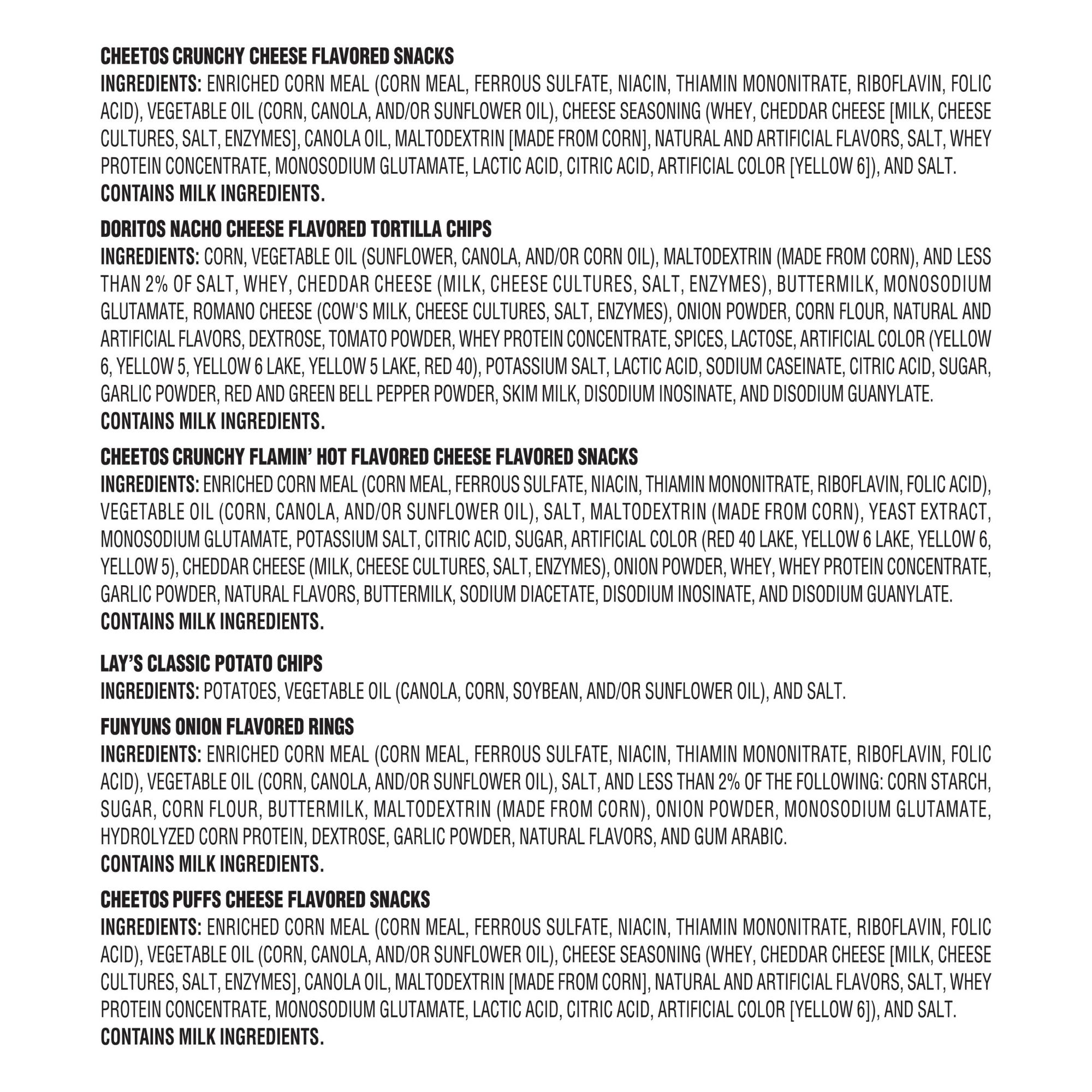 Six bags of Lay's Classic Potato Chips, eight bags of Funyuns onion flavored rings snacks, eight bags of Cheetos Puffs cheese snacks, ten bags of Cheetos Crunchy cheese snacks, ten bags of Doritos Nacho Cheese flavored tortilla chips, and eight bags of Cheetos Flamin' Hot Crunchy cheese snacks