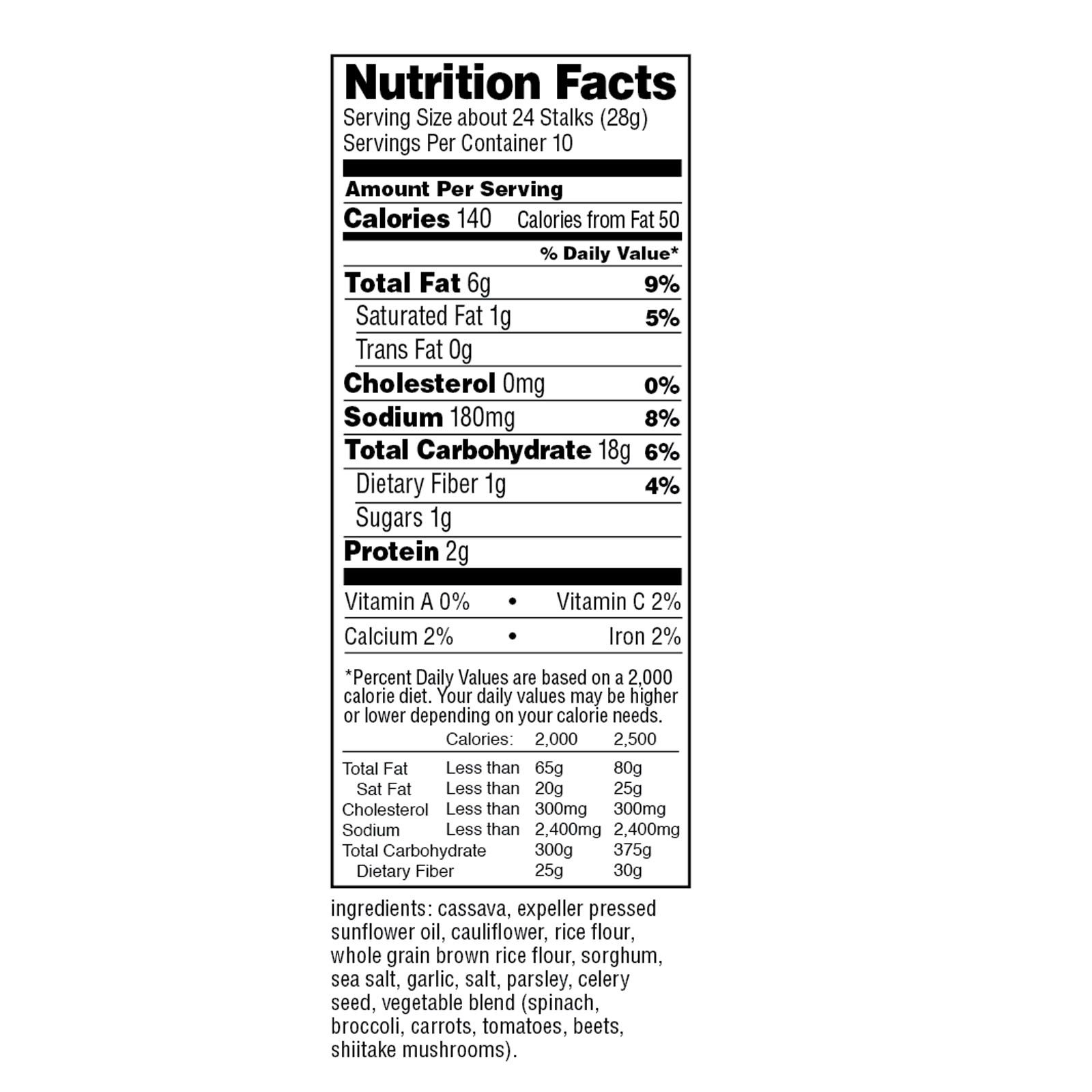 Ingredients: Cassava, expeller pressed sunflower oil, cauliflower, rice flour, whole grain brown rice flour, sorghum, sea salt, garlic, salt, parsley, celery seed, vegetable blend (spinach, broccoli, carrots, tomatoes, beets, shiitake mushrooms)