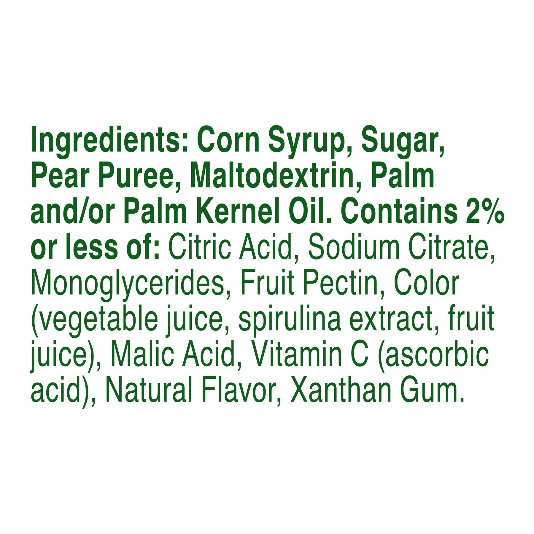 Ingredients: Corn Syrup, Sugar, Pear Puree, Maltodextrin, Pal And/or Palm Kernel Oil. Contains 2% Or Less Of: Citric Acid, Sodium Citrate, Monoglycerides, Fruit Pectin, Color (Vegetable Juice, Spirulina Extract, Fruit Juice), Malic Acid, Vitamin C (Ascorbic Acid), Natural Falcoe, Xanthan Gum.