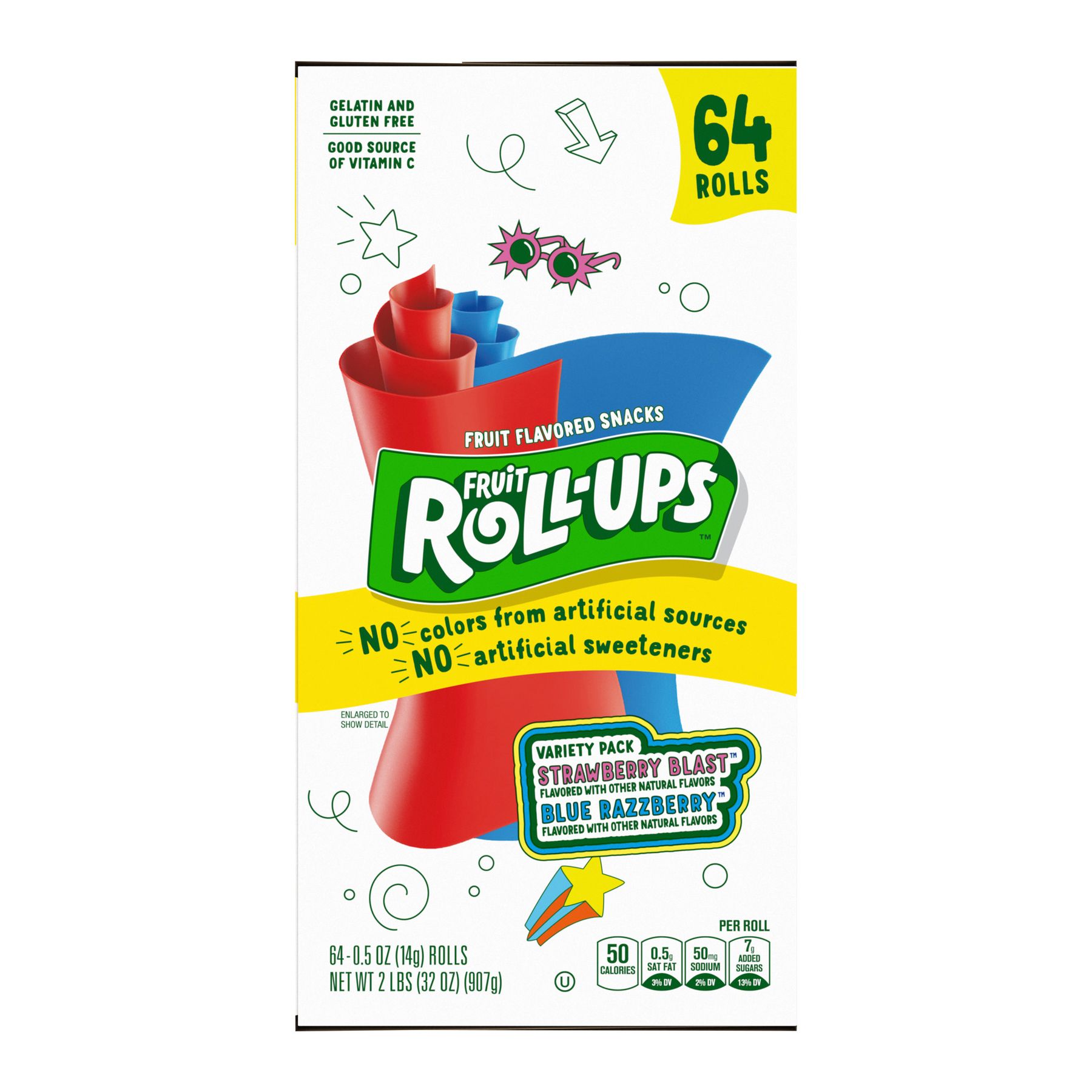 Roll your way with the snack that's as fun to play with as it is to devour. This variety pack of fruit flavored snacks in Blue Razzberry and Strawberry Blast is like an invitation to Unroll. Play. Eat. Each individual wrapped snack includes an assortment of silly, wacky tongue tattoos you can show off to friends. Every serving contains a good source of vitamin C and is made without gelatin. Reach for these gluten free gummy snacks on the go, after school, during car rides, or any time you crave playful, mouth-puckering fun. Peel it. Twist it. Rip it. Stretch it. However you enjoy your Fruit Roll-Ups, this snack pack keeps the good times rolling! Contains 64 snack pouches.