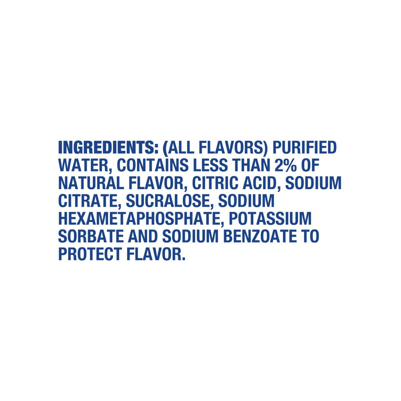 | Ingredients | ( All Flavors) Purified Water, Contains less than 2% of Natural Flavor, Citric Acid, Sodium Citrate, Sucralose, Sodium Hexametaphosphate, Potassium Sorbate and Sodium Benzoate to Protect Flavor |
