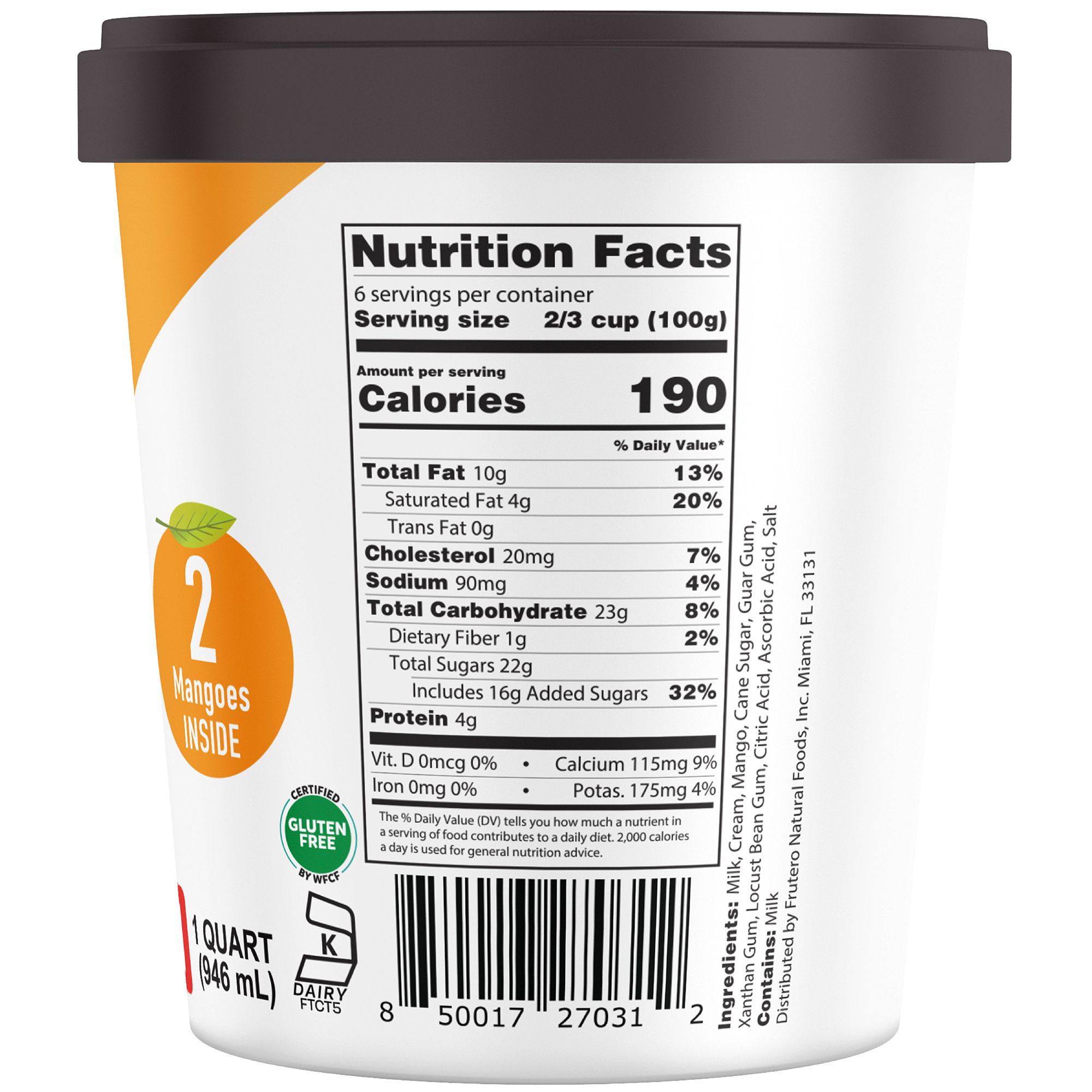 Ingredients: Milk, Cream, Mango, Cane Sugar, Guar Gum, Xanthum Gum, Locust Bean Gum, Citric Acid, Ascorbic Acid, Salt.