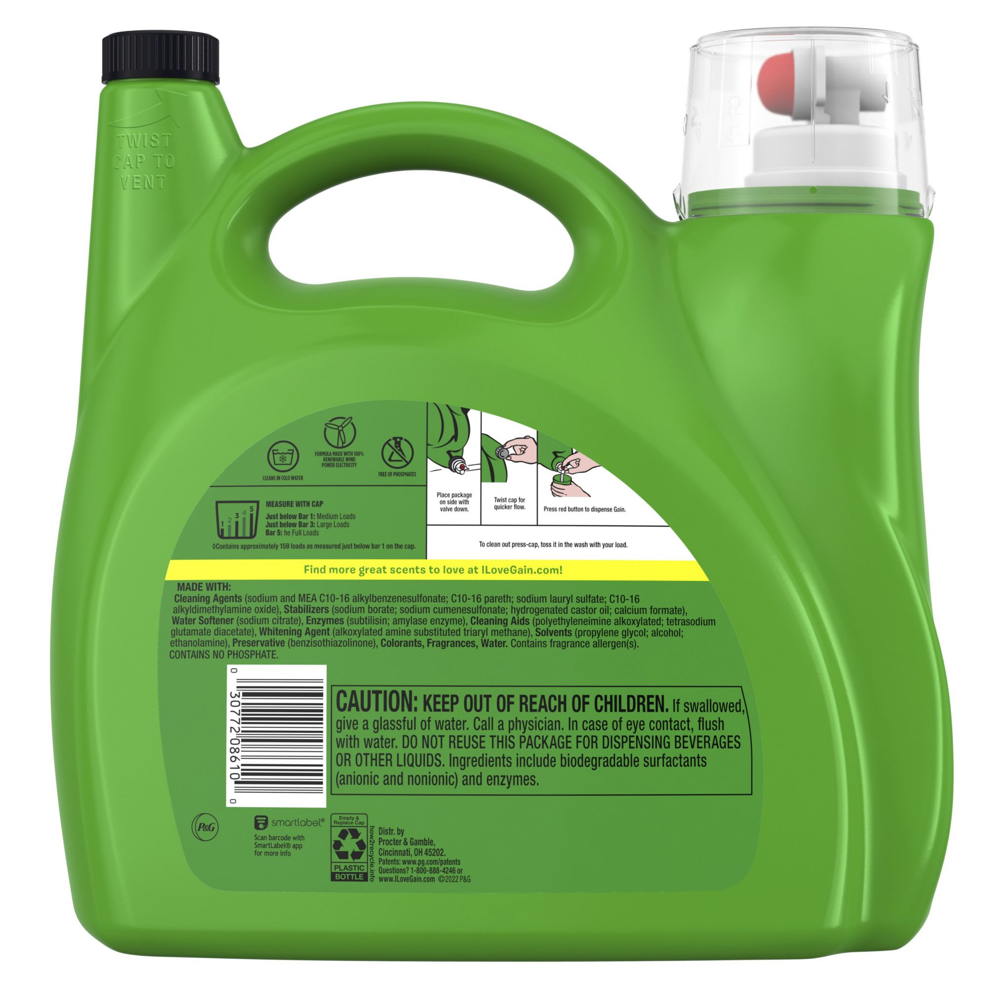 Ingredients: Cleaning Agents (Sodium And MEA C10-16 Alkylbenzenesulfonate, C10-16 Pareth, Sodium Lauryl Sulfate, C10-16 Alkyldimethylamine Oxide), Stabilizers (Sodium Borate, Sodium Cumenesulfonate, Hydrogenated Castor Oil, Calcium Formate), Water Softener (Sodium Citrate), Enzymes (Subtilisin, Amylase Enzyme), Cleaning Aids (Polyethyleneimine Alkoxylated, Tetrasodium Glutamate Diacetate), Whitening Agent (Alkoxylated Amine Substituted Triaryl Methane), Solvents (Propylene Glycol, Alcohol, Ethanolamine), Preservative (Benzisothiazolinone), Colorants, Fragrances, Water