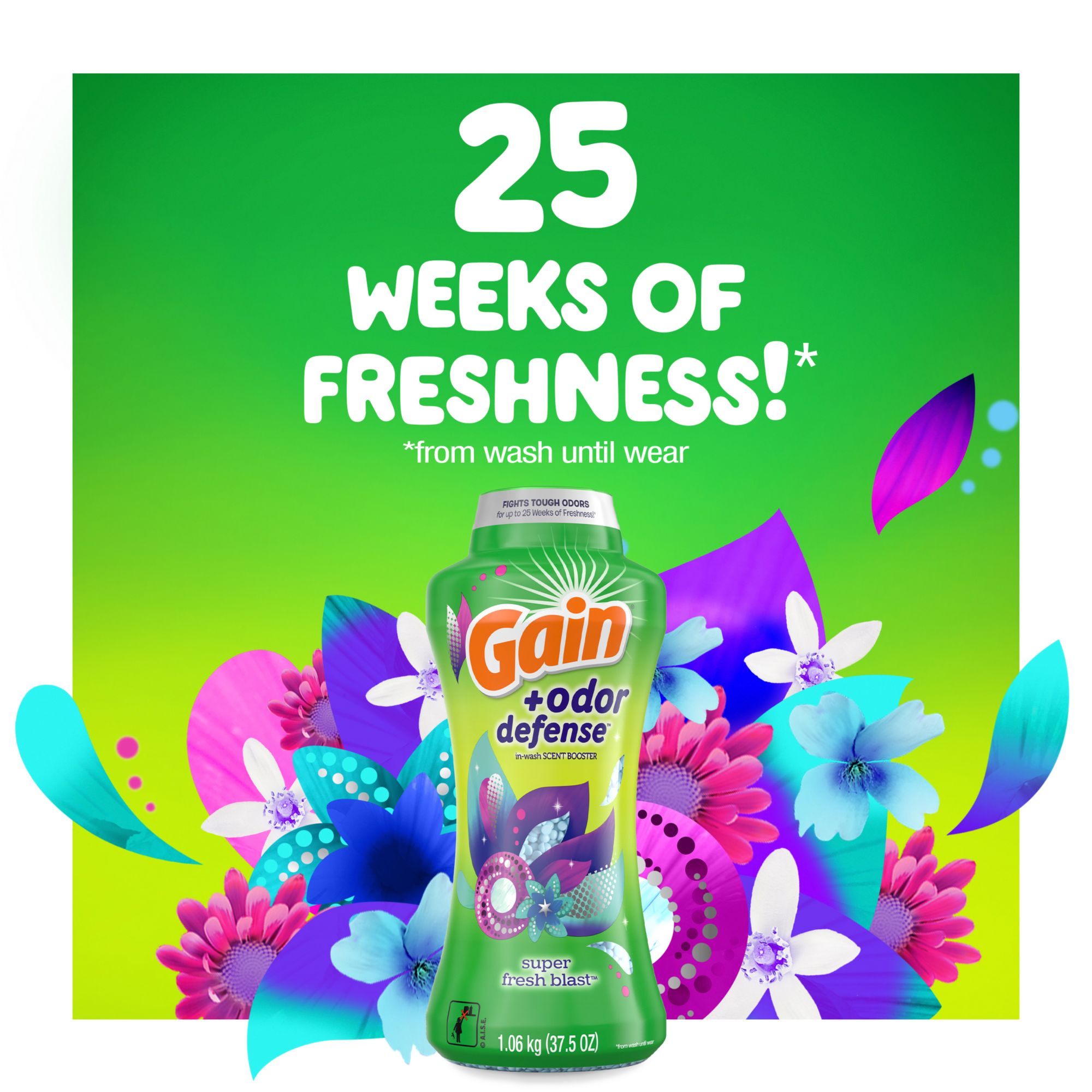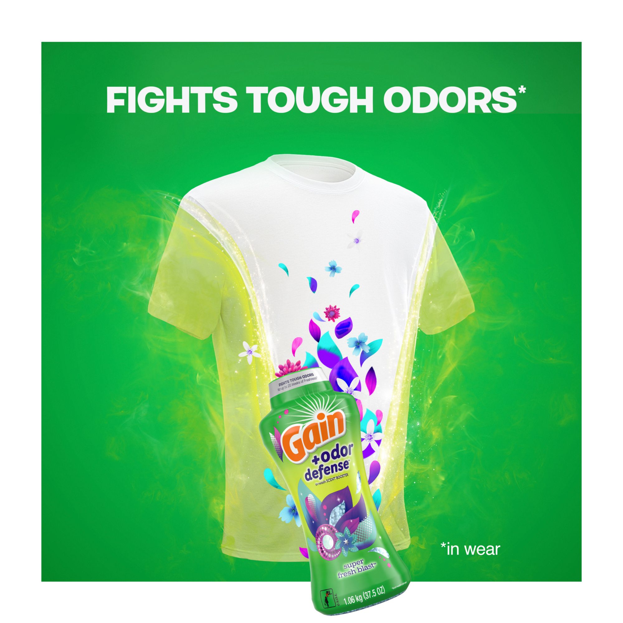 Want to smell as fresh as you look? Leave tough odor behind by fighting it at the source instead of masking it, and get ready for up to 12 weeks of lasting freshness* with this laundry scent booster. Pair with other Gain + Odor Defense products for the best experience.