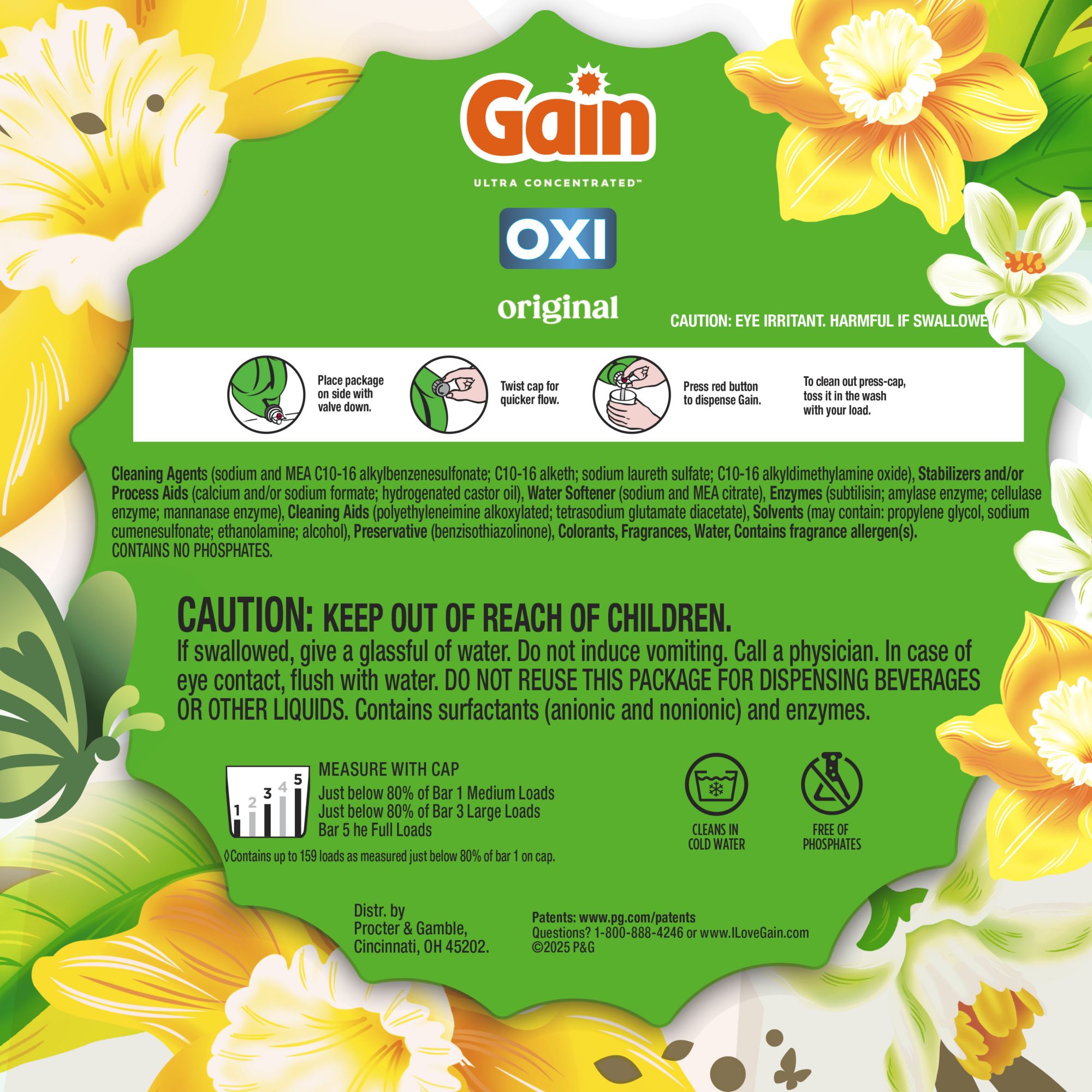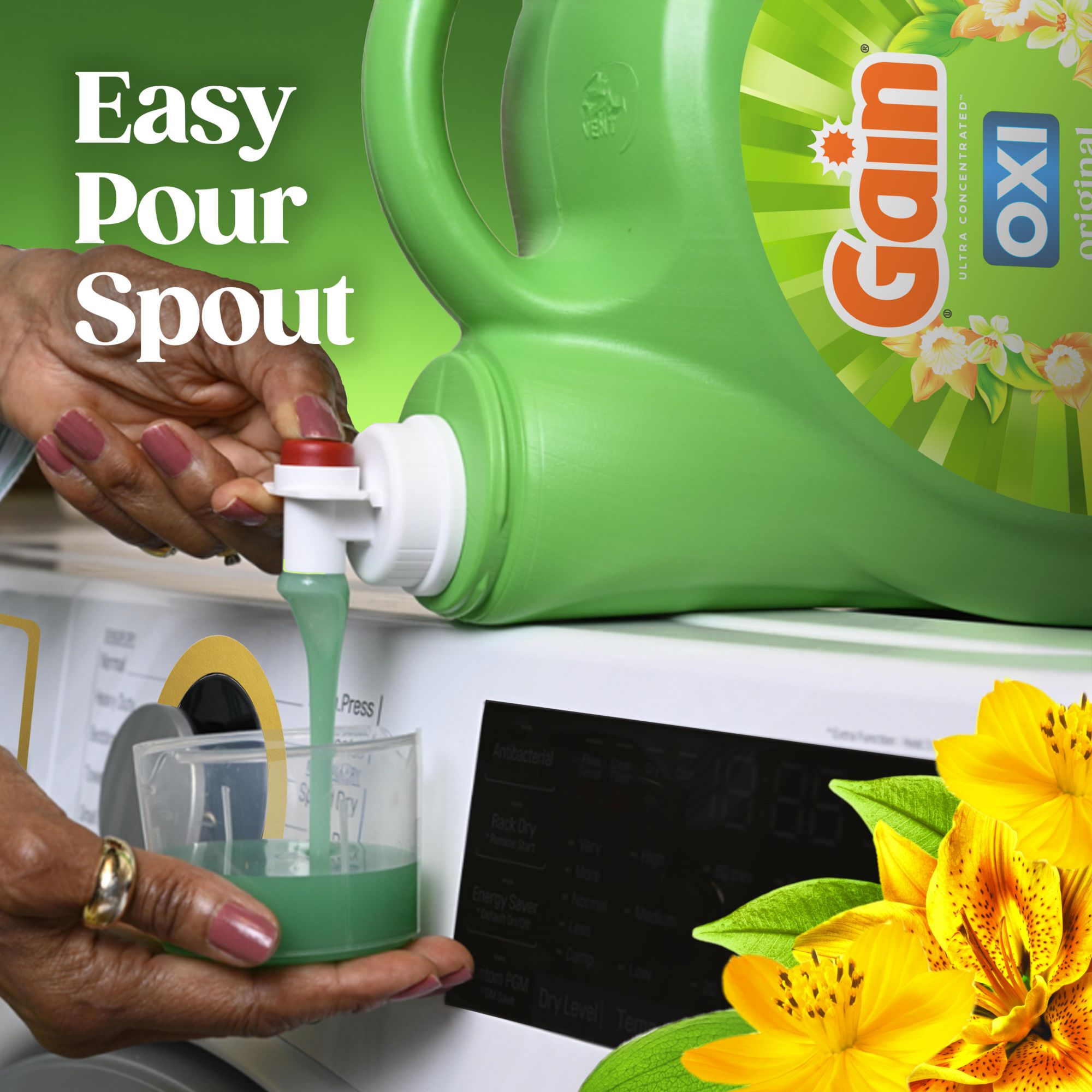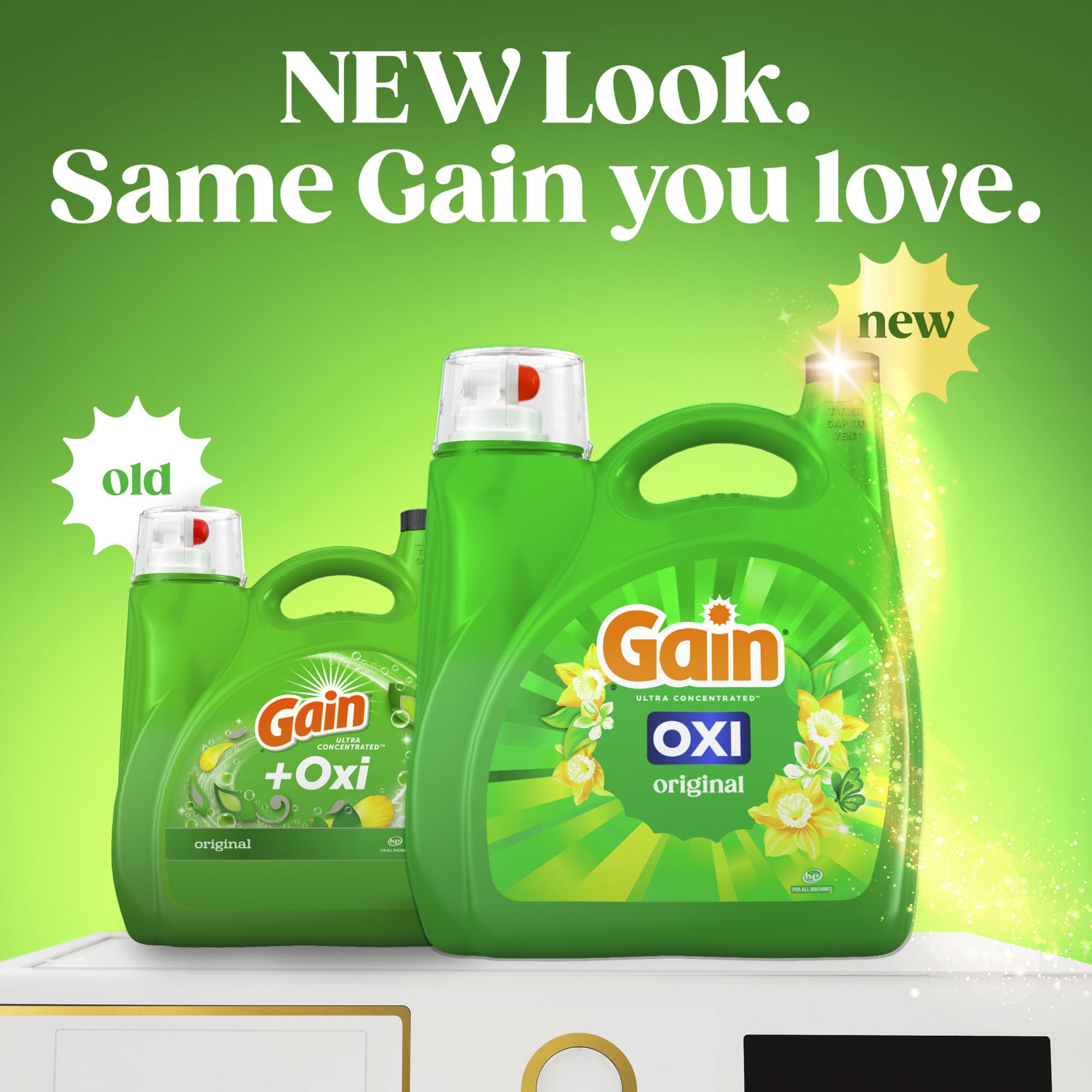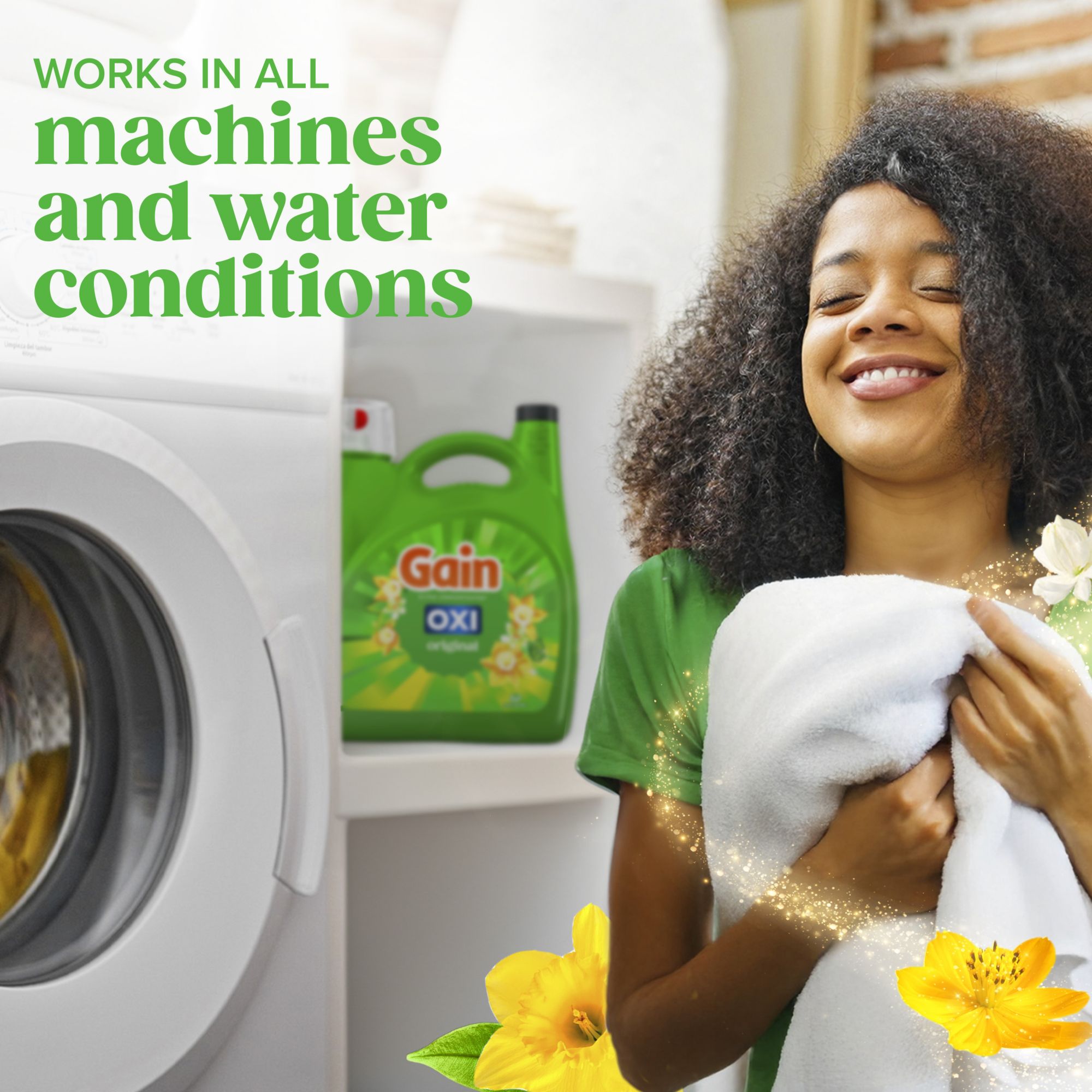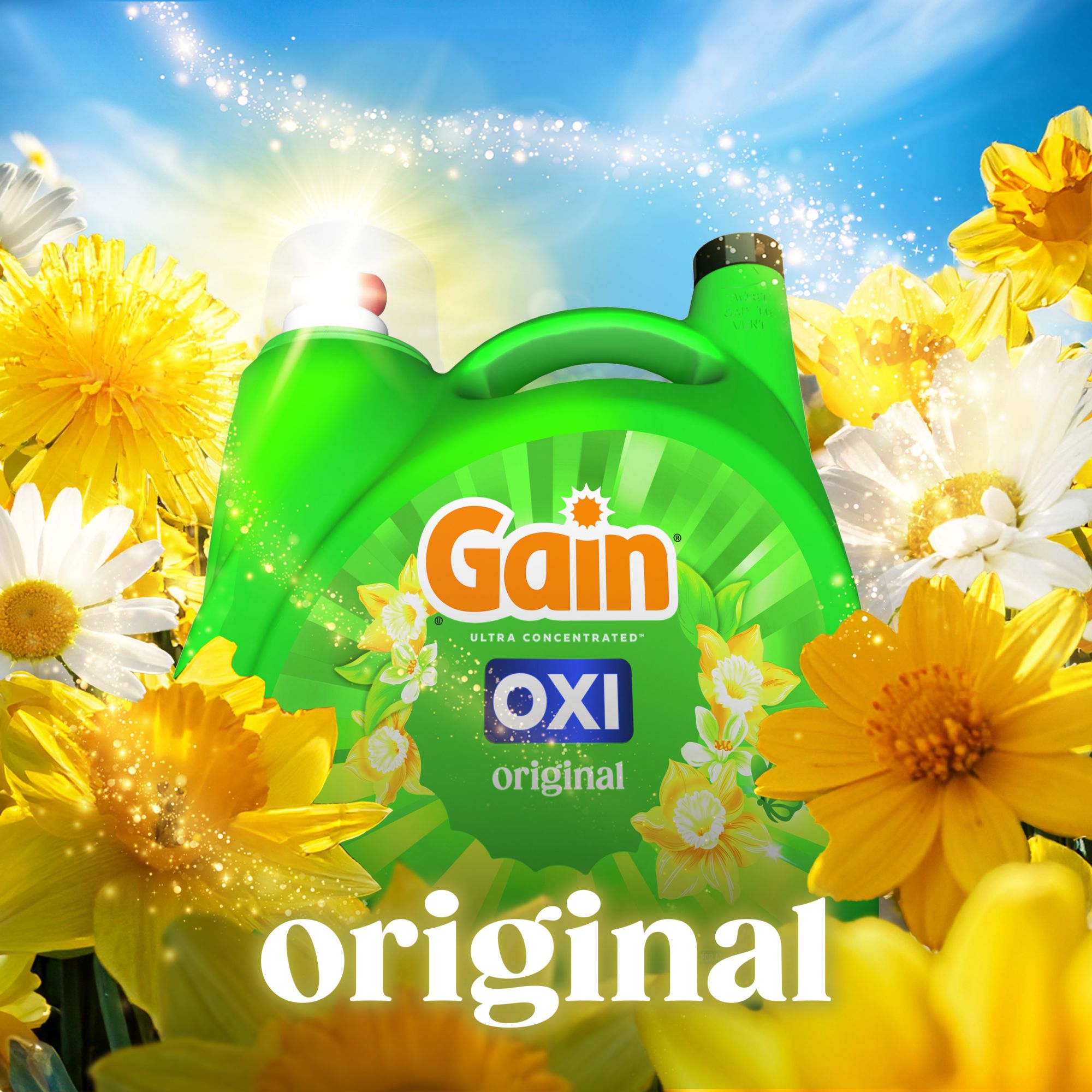 Experience the power of Gain with Oxi Liquid Laundry Detergent, your ultimate laundry solution. This liquid detergent is designed to lift away dirt while locking in an amazing scent that lasts up to six weeks from wash until wear. The Gain Original scent delivers the irresistible freshness of a crisp morning outdoors, with hints of citrus and mountain flowers drifting on a gentle breeze. Along with its captivating fragrance, Gain with Oxi provides exceptional cleaning strength and outstanding stain-fighting performance, giving you remarkable results wash after wash at an affordable price. Versatile for both regular and high-efficiency washers, it works effectively even in cold water. Simply measure the desired amount, pour it into the detergent compartment or directly into the drum, and let Gain do the rest. Elevate your laundry routine with a detergent that leaves clothes looking great and smelling even better. Includes 170 fl. oz. of Gain with Oxi Liquid Laundry Detergent, Original Scent, enough for 159 loads.