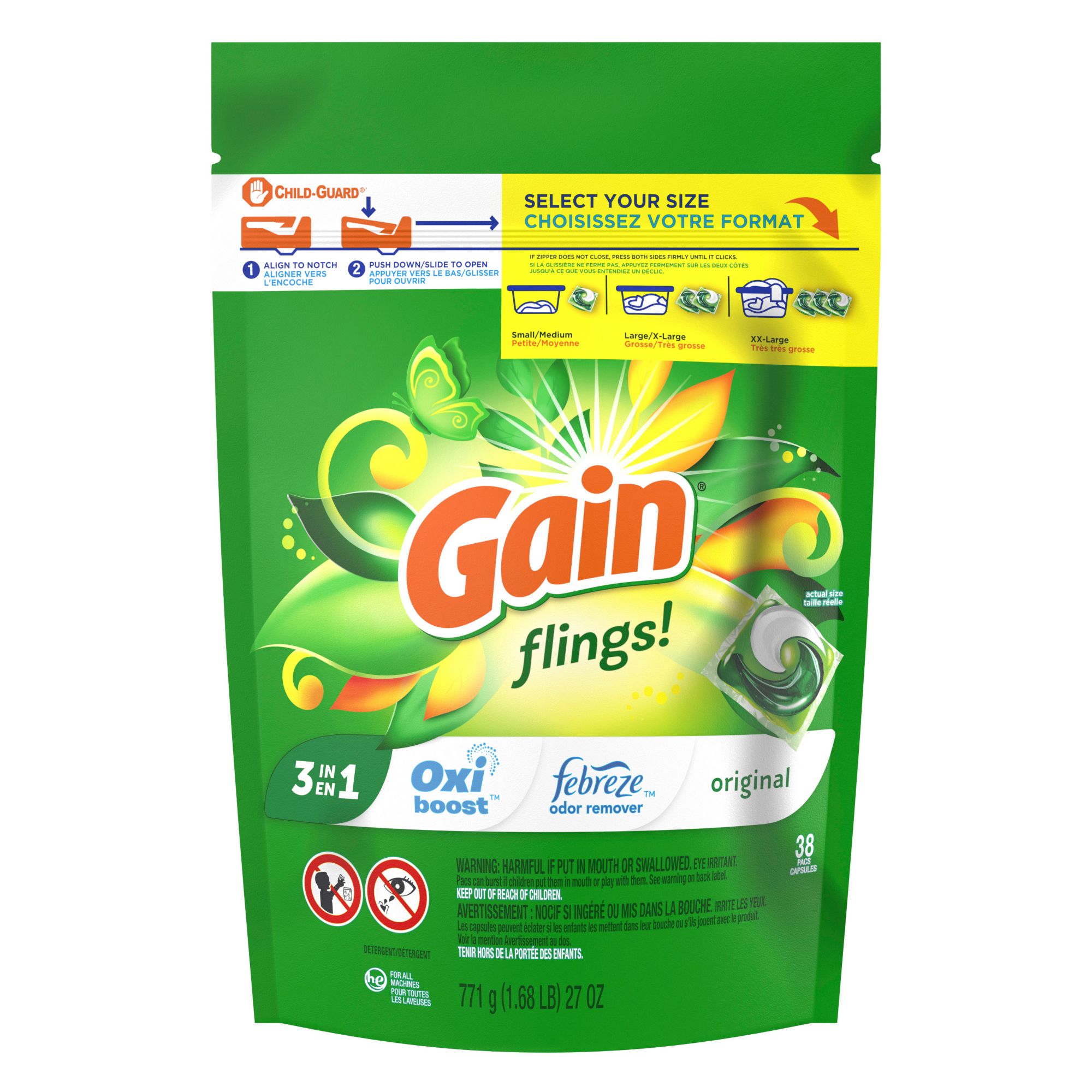 Gain Original Flings Laundry Detergent Pacs are just what you would expect from Gain: a detergent with amazing freshness and cleaning. These Gain laundry detergent pacs feature four benefits in one laundry pac: 2X* Oxi, all-day scent, Febreze Odor Defense, and Color Guard technology. This means you get a 2X* Oxi Clean, lasting freshness, and protection against fading colors-all in one convenient laundry pac. Each box contains 152 laundry pacs split into four resealable bags with 38 laundry pacs in each bag. Gain's Original Flings Laundry Detergent Pacs are packed with 50% more freshness ingredients versus Cheer detergent, infusing your clothes with tiny perfume capsules during the wash, that bloom during regular wear to give you long-lasting freshness throughout the day. To use Gain Flings, simply toss two laundry detergent pacs directly into the washing machine drum before adding your laundry. For larger or heavily soiled loads, you can use three laundry detergent pacs. These detergent pacs are designed to dissolve quickly in water, releasing powerful cleaning agents that tackle dirt and odors. Use with any laundry setup, because Gain flings detergent pacs dissolve in both hot and cold water and are HE compatible. (*Cleaning boosters vs Gain Original Liquid Laundry Detergent)