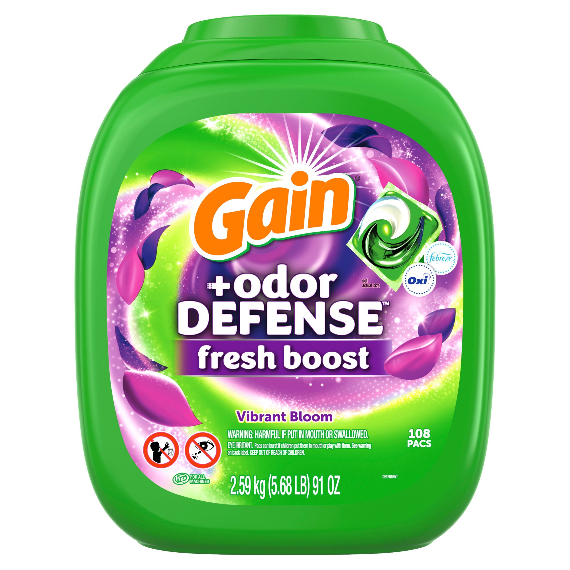 Fights Odors: Laundry detergent pacs enhanced with Oxi Boost and Febreze with Vibrant Bloom scent Long-Lasting Freshness: Keeps laundry smelling fresh for days Oxi Power + Odor Defense Fresh Boost: Take odor-fighting and freshness to the next level for laundry that looks good and smells even better Works in all Machines: Laundry detergent that's compatible with standard and HE washing machines and water conditions, even cold water Includes 1 tub of 108 ct. of Gain Flings Laundry Detergent Pacs