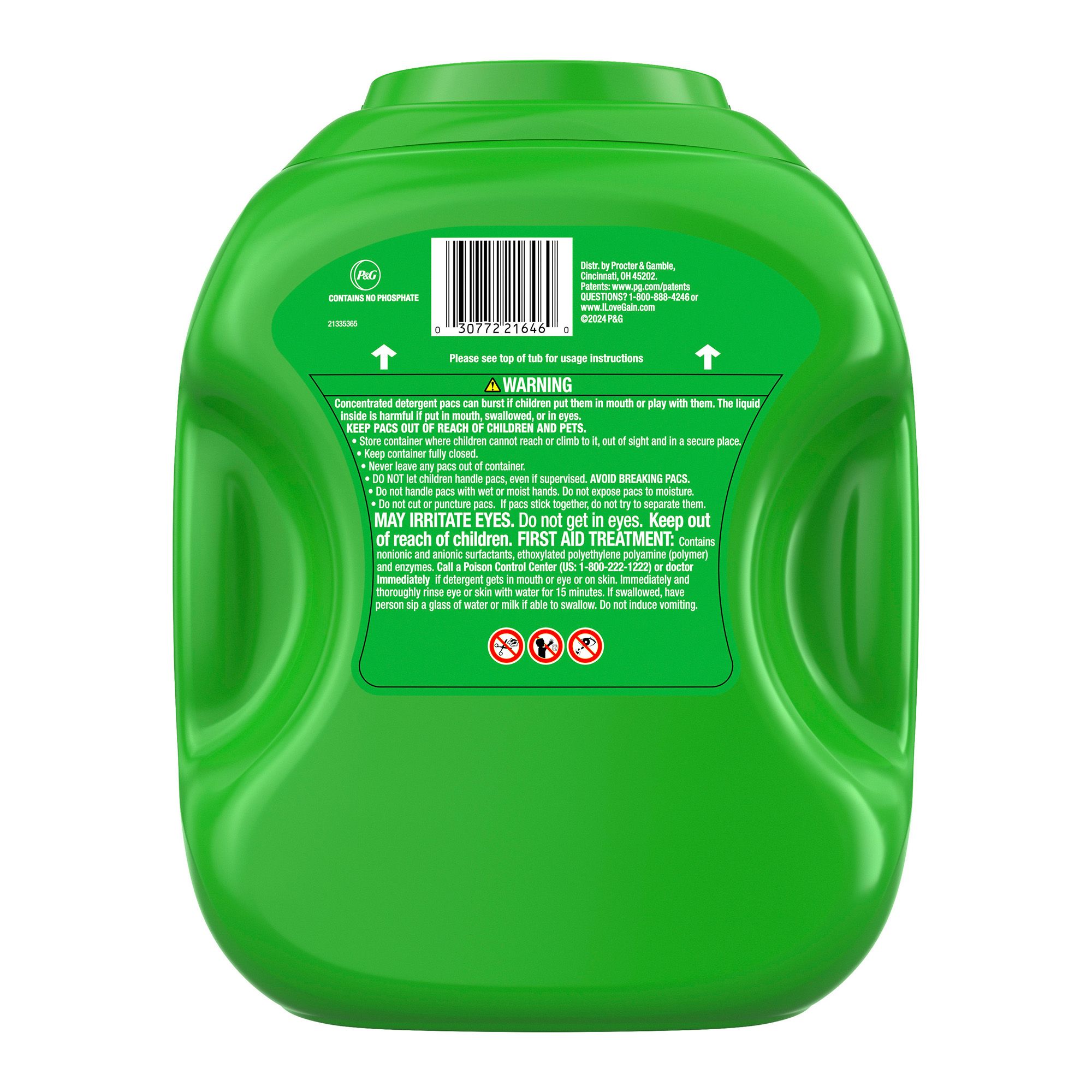 Concentrated detergent pacs can burst if children put them in mouth or play with them. The liquid inside is harmful if put in mouth, swallowed, or in eyes. KEEP PACS OUT OF REACH OF CHILDREN AND PETS. Store container where children cannot reach or climb to it, out of sight and in a secure place. Keep container fully closed. Never leave any pacs out of container. DO NOT let children handle pacs, even if supervised. AVOID BREAKING PACS. Do not handle pacs with wet or moist hands. Do not expose pacs to moisture. Do not cut or puncture pacs. If pacs stick together, do not try to separate them. MAY IRRITATE EYES. Do not get in eyes. Keep out of reach of children. FIRST AID TREATMENT: Contains nonionic and anionic surfactants, ethoxylated polyethylene polyamine (polymer) and enzymes. Call a Poison Control Center (US: 1-800-222-1222) or doctor immediately if detergent gets in mouth or eye or on skin. Immediately and thoroughly rinse eye or skin with water for 15 minutes. If swallowed, have person sip a glass of water or milk if able to swallow. Do not induce vomiting.