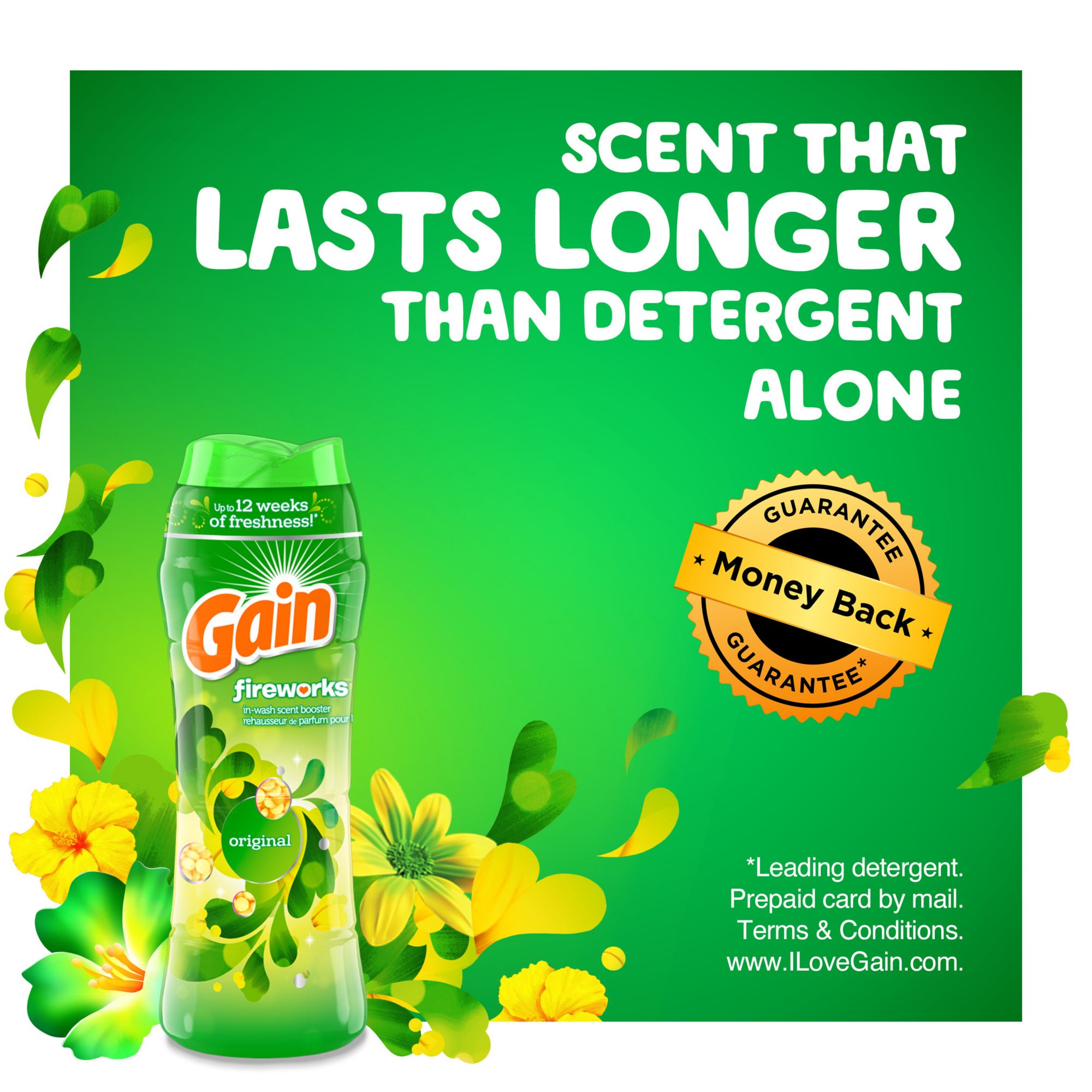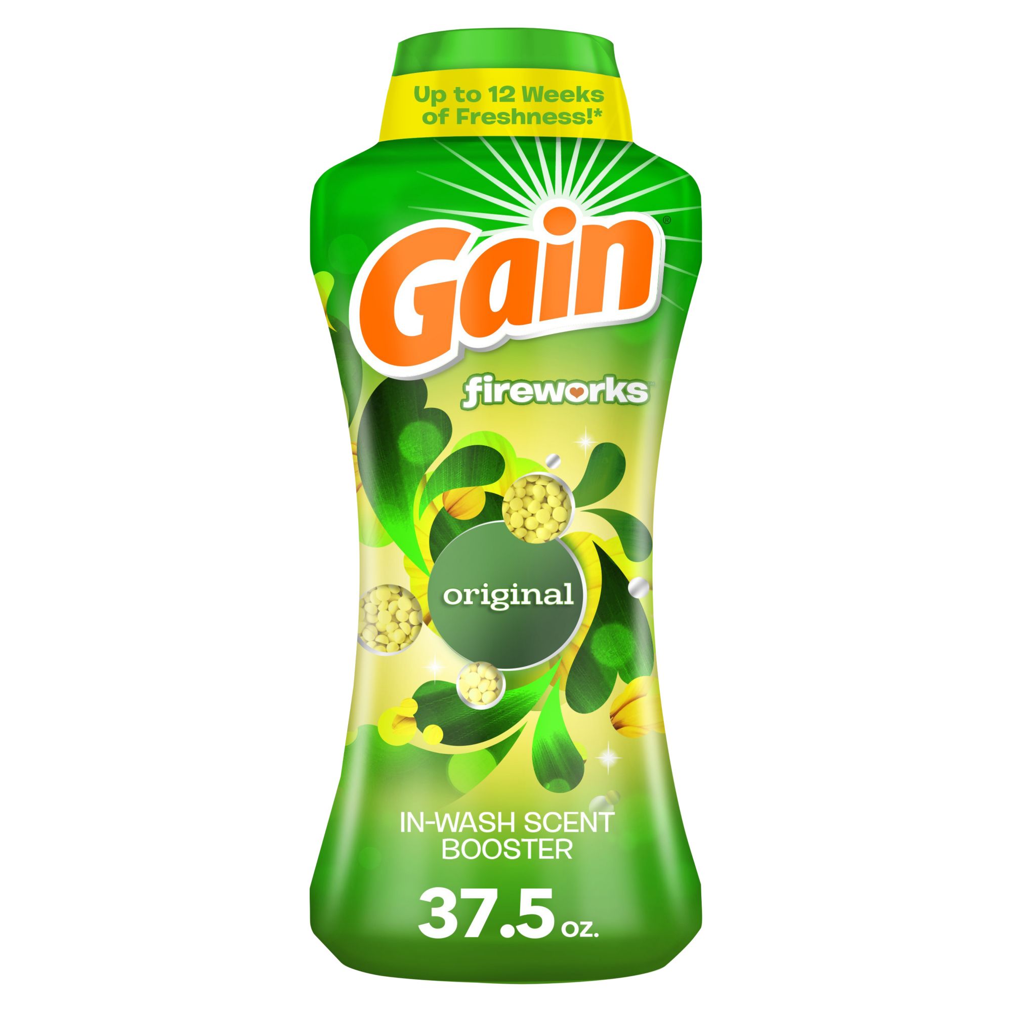 Gain Fireworks In-Wash Scent Booster gives your laundry up to 12 weeks of freshness, from wash until wear Works with your favorite detergent Add Gain to every step of your laundry for more of the great Gain scent Can be used on all colors and fabrics, and is safe to use in all washing machines Regular and HE Washer compatible Dissolves in hot and cold water Like any household detergent, keep away from children