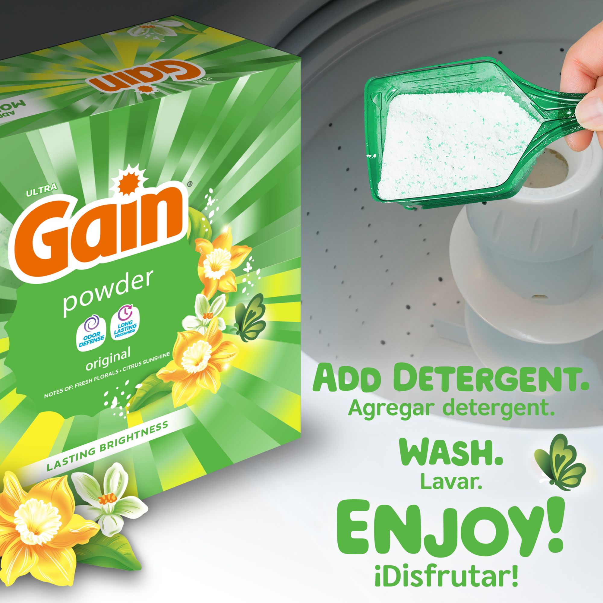 Whether you have a regular or high-efficiency washing machine, Gain Original Powder Detergent is safe and effective to use. Gain Laundry Detergent Powder cleans in cold water! Simply add the recommended amount of Gain Powder Laundry Detergent to the drum, toss in your laundry, and start your wash cycle. Experience the sheer delight of wearing clothes that are not only fresh and clean but also carry the signature Gain scent that you adore. For an even more intense and long-lasting fragrance, consider complementing your laundry routine with Gain Scent Beads and Gain Fabric Softener. With Gain, your laundry will not only look clean but also exude a fantastic and captivating scent that will make you feel truly refreshed.