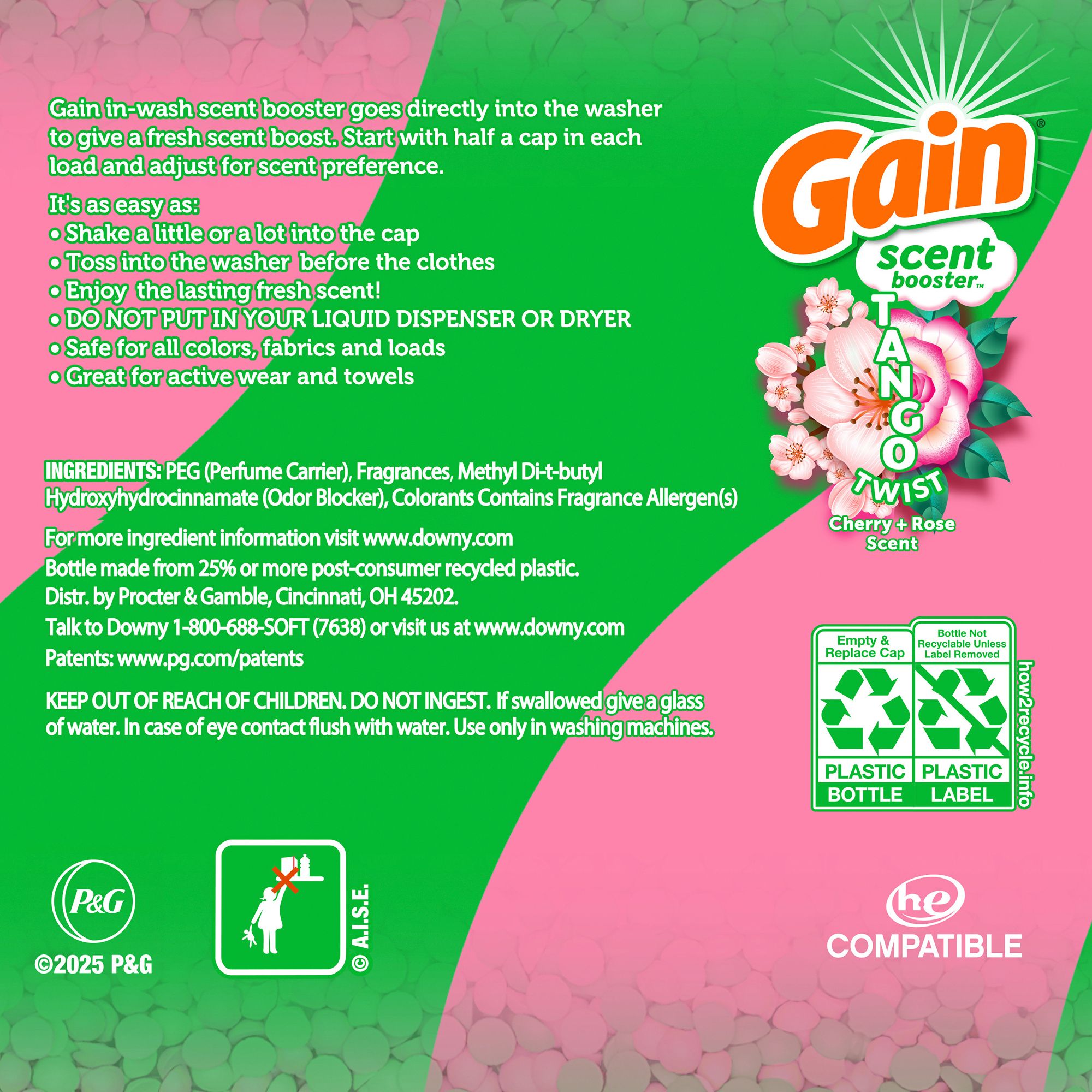 Get two scents in one irresistible smell with Gain Tango Twist! Try Laundry Bead scent combos, which deliver 2x the freshness and scent vs. leading detergent alone. Experience Gain Tango Twist your favorite way, and if you're into sweet and floral scents, try Cherry + Rose scent beads - made with a romantic blend of blooming roses and cherry sweetness that will take you for a stroll in Parisian streets. Gain Tango Twist Laundry Scent Booster Beads are safe for all washable fabrics, colors, and loads. Plus, they're incredibly easy to use - you can tango in just two steps: 1. Toss your Gain Scent Beads into the washer 2. Add your laundry... and you're all set for an experience full of delight!