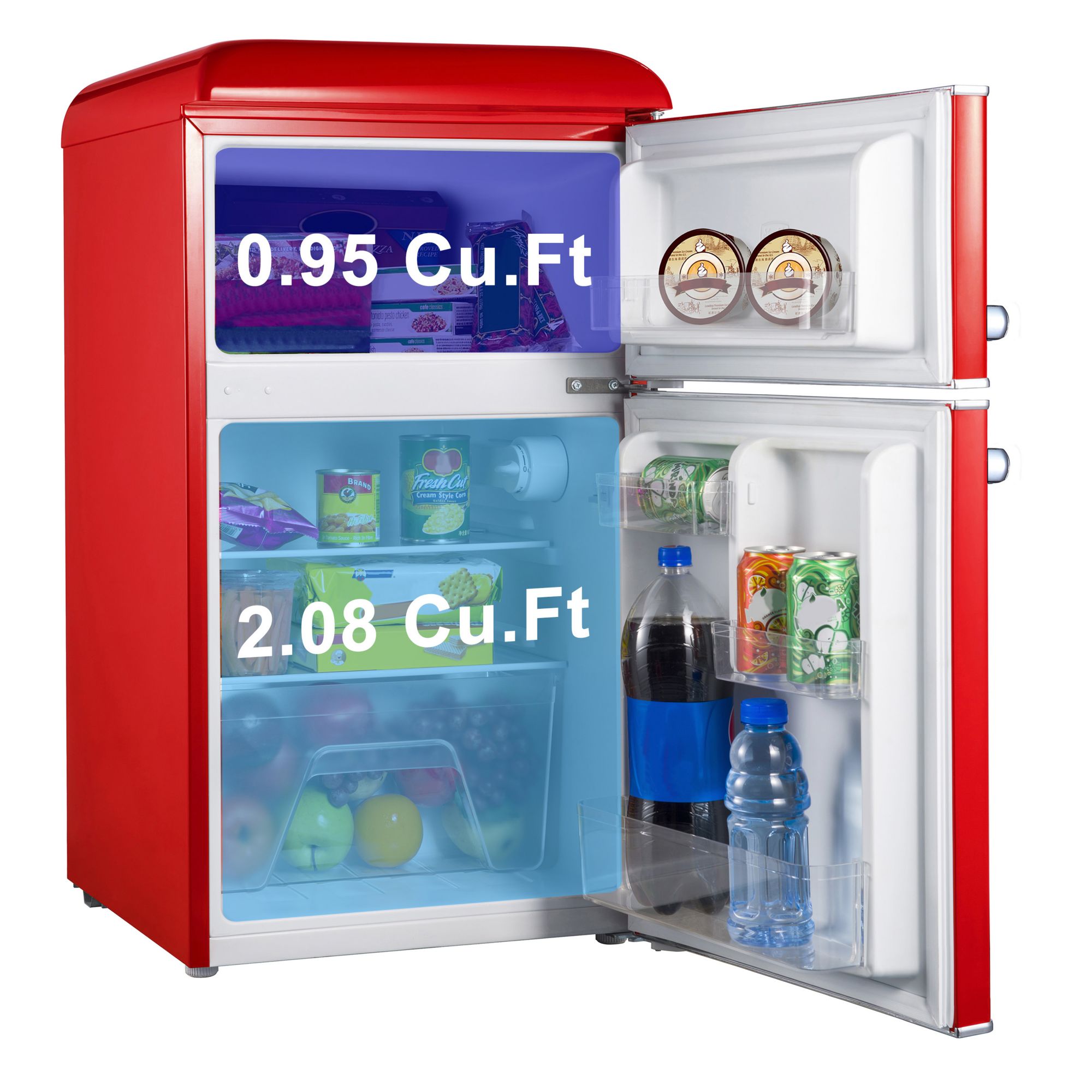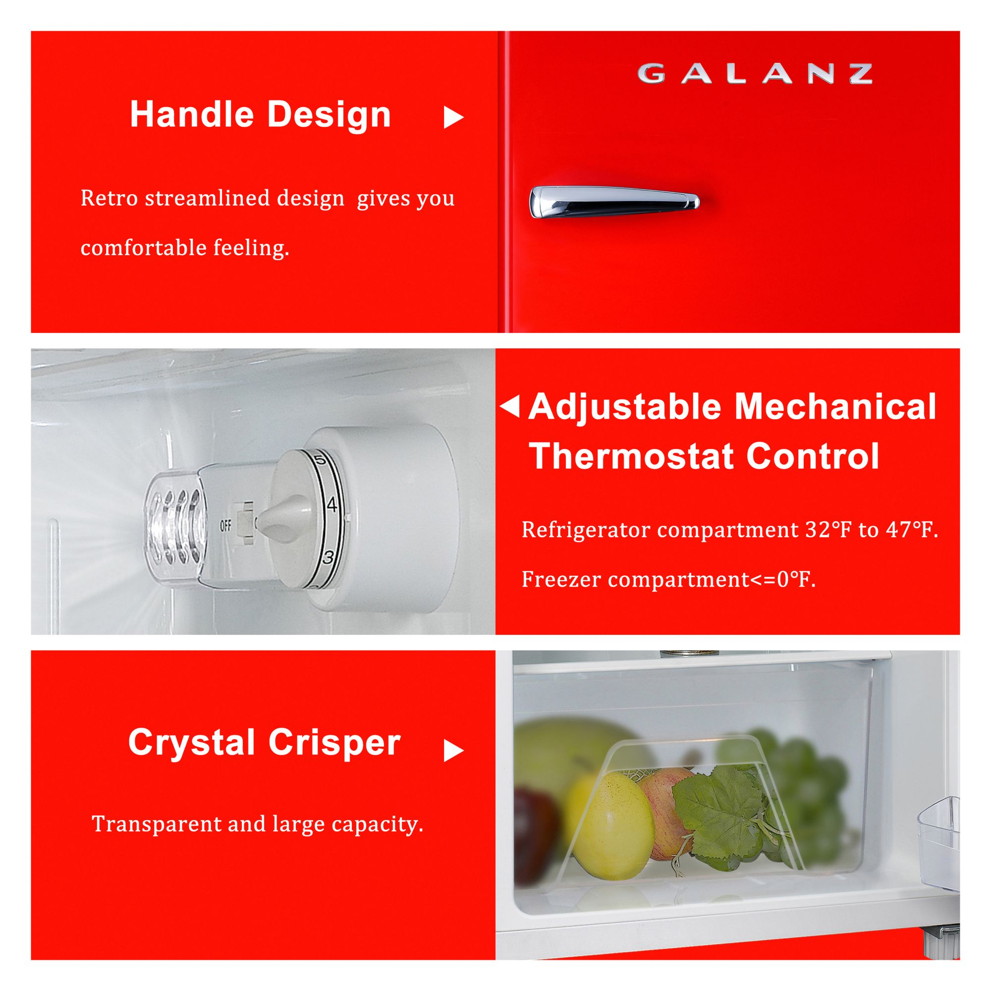 Keep food fresh with this Galanz 3.1 cu. ft. Mini Fridge. With the separate freezer compartment, clear fruit and vegetable crisper, removable shelf and door shelves, you have plenty of space for your favorite food and drinks. The adjustable thermostat allows you to control the temperature, and the retro style gives it a charming look.