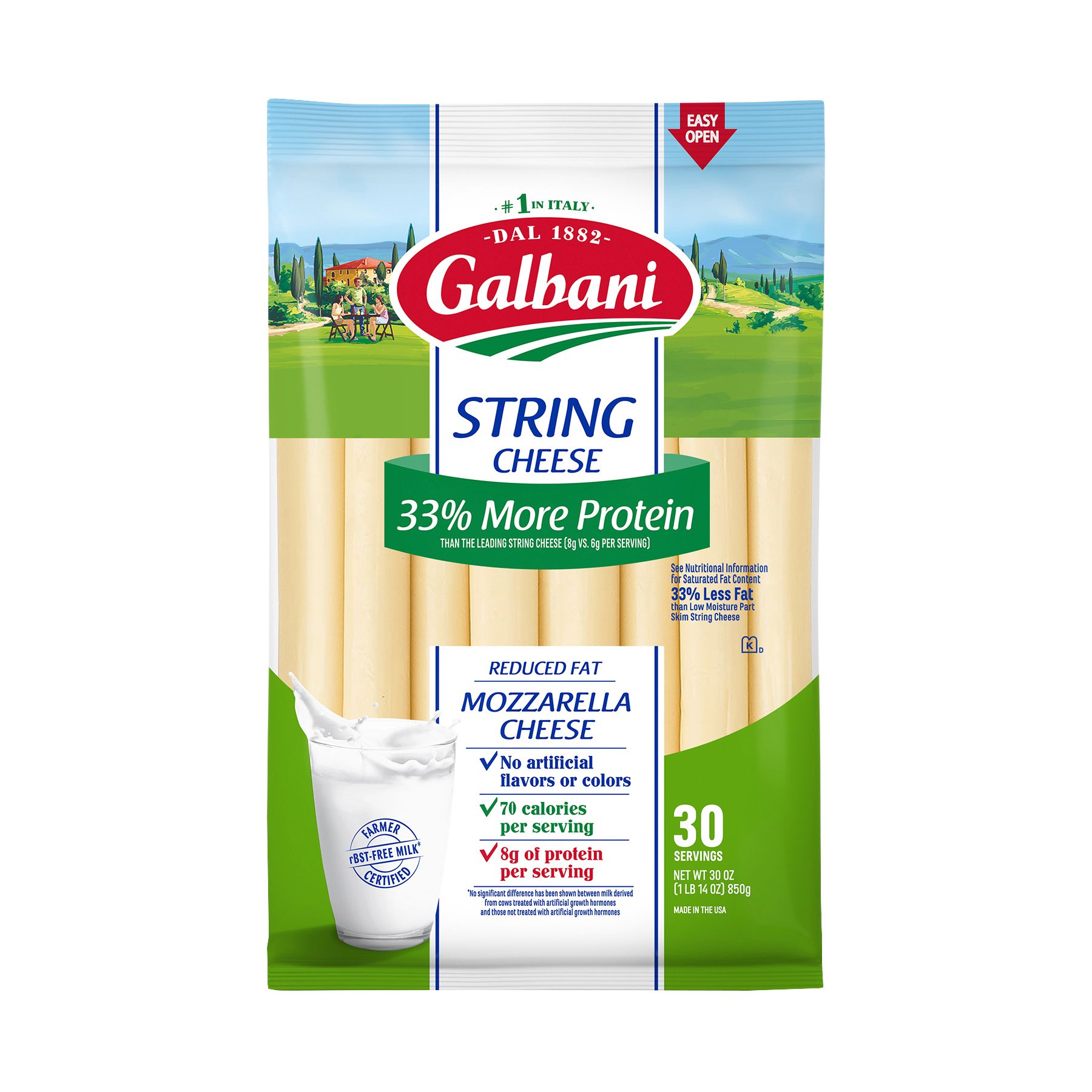 Galbani reduced fat mozzarella string cheese is perfect for a quick, satisfying snack. Made with rBST-free milk and no artificial flavors or colors, these individually wrapped portable cheese snacks can be enjoyed anywhere, anytime. In sync with your healthy lifestyle, this reduced fat mozzarella string cheese contains 33% more protein than the leading string cheese (8g vs 6g per serving). For a tasty and simple snack at work, school or on the go, enjoy this string cheese on its own or paired with apple slices, almonds, olives or whole-grain crackers. Each package contains 30 individually wrapped cheese sticks that are ideal for mindful snacking on the go. Keep this package of string cheese refrigerated until ready to enjoy. Explore the full lineup of delicious Galbani cheeses, including mozzarella, ricotta, snack cheese and more.