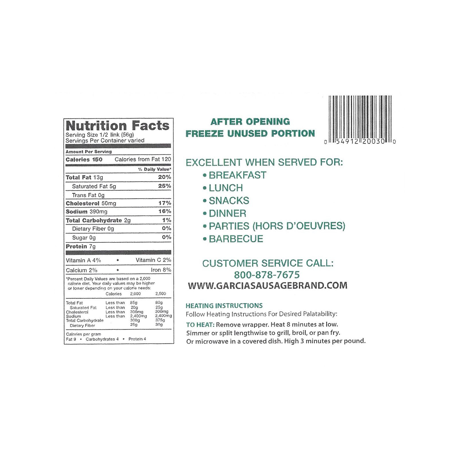 Garcia beef smoked hot sausages are the perfect choice for any cookout or tailgate. Make delicious sausage sandwhichs or cut up piceses into your favorite pasta dish. This pack comes with 1.75 lbs. of Garcia beef smoked hot sausages.