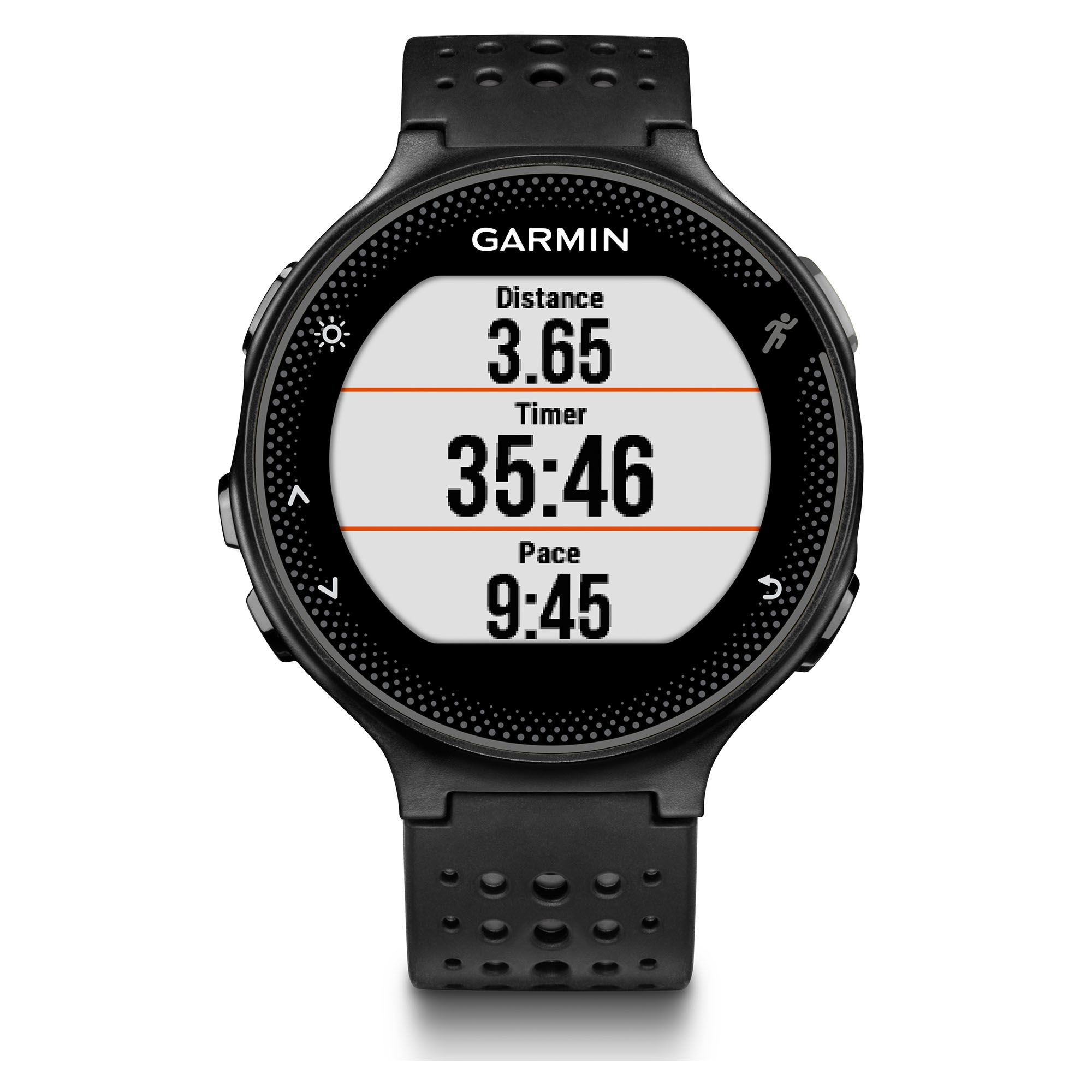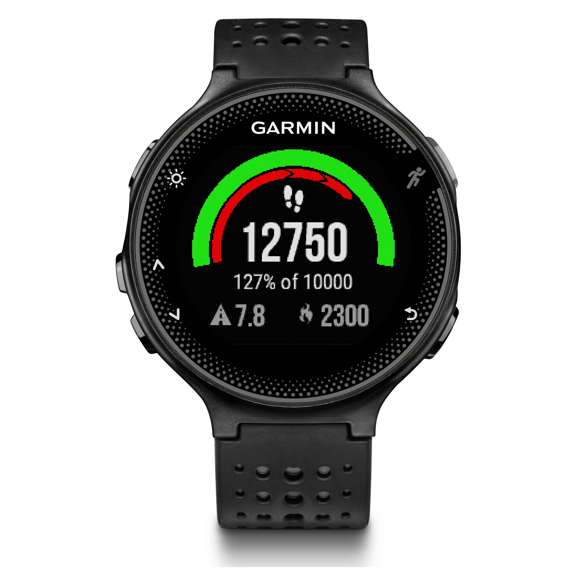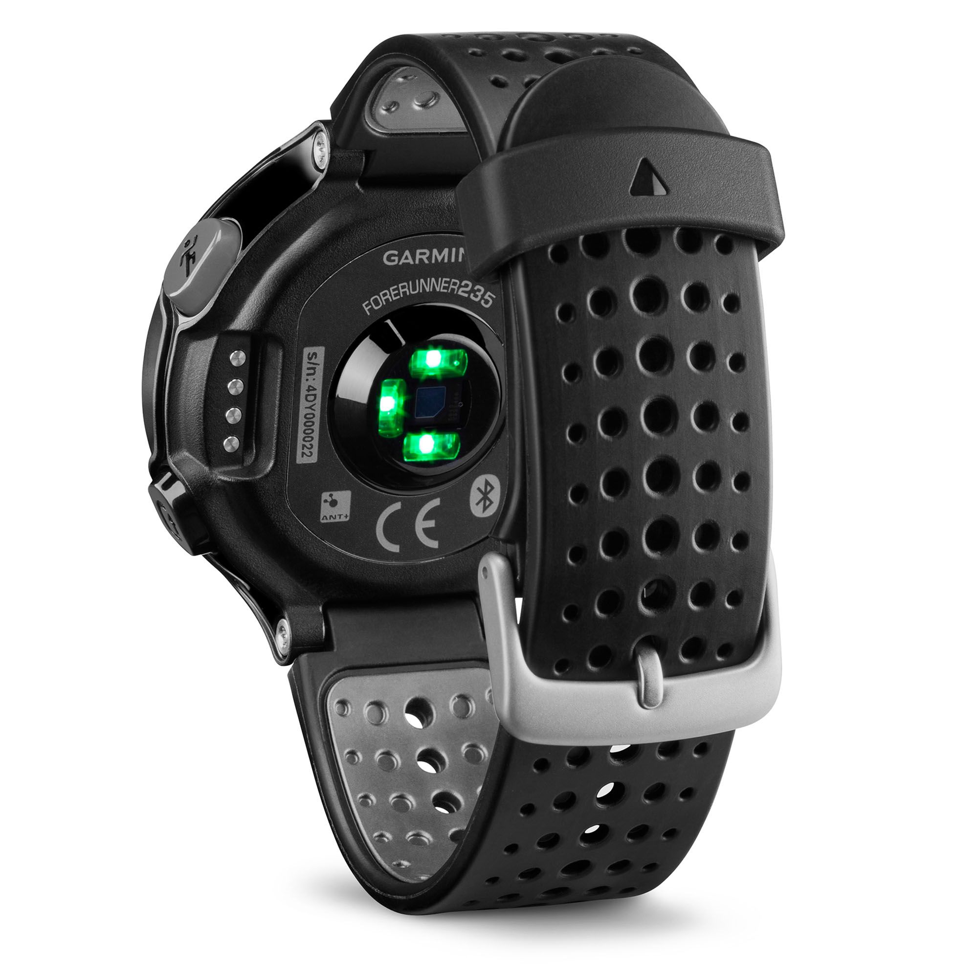 Tracks distance, pace, time, heart rate and more Connected features: automatic uploads to Garmin Connect, live tracking, audio prompts, smart notifications and social media sharing Activity tracking counts daily steps, distance, calories and sleep Download data fields, watch faces, widgets and applications from Connect IQ Includes Forerunner 235 watch, charging/data cable, and manual