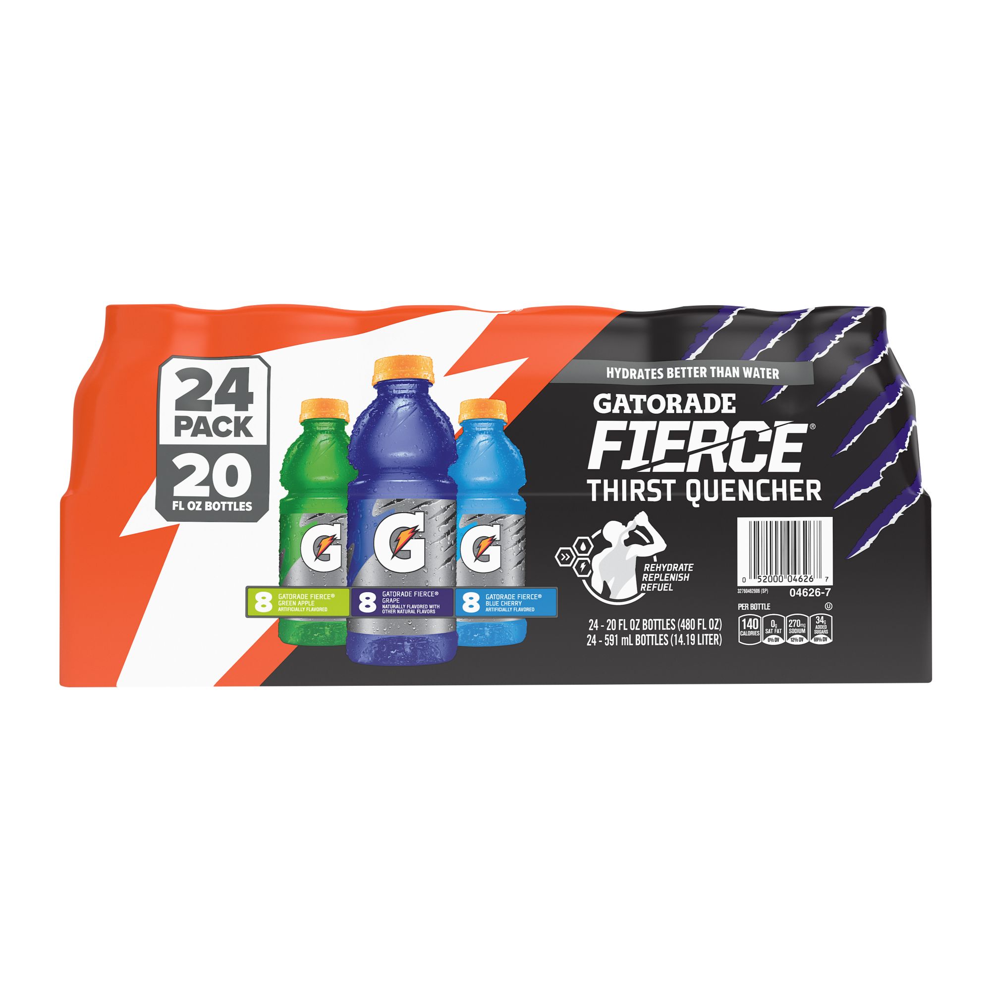 With a legacy over 50 years in the making, it's the most scientifically researched and game-tested way to replace electrolytes lost in sweat. Gatorade Thirst Quencher is specifically made to help keep you hydrated, which is why it's trusted by some of the world's best athletes. During training, you burn off vital energy needed to continue performing at your best. Refuel with carbs to support the demands you put on your body. To compete with the best, you need the fuel made to perform. Calories that are converted from carbs help maintain your energy level to reach your prime. This Variety pack includes Fierce Green Apple, Fierce Grape and Fierce Blue Cherry flavors.