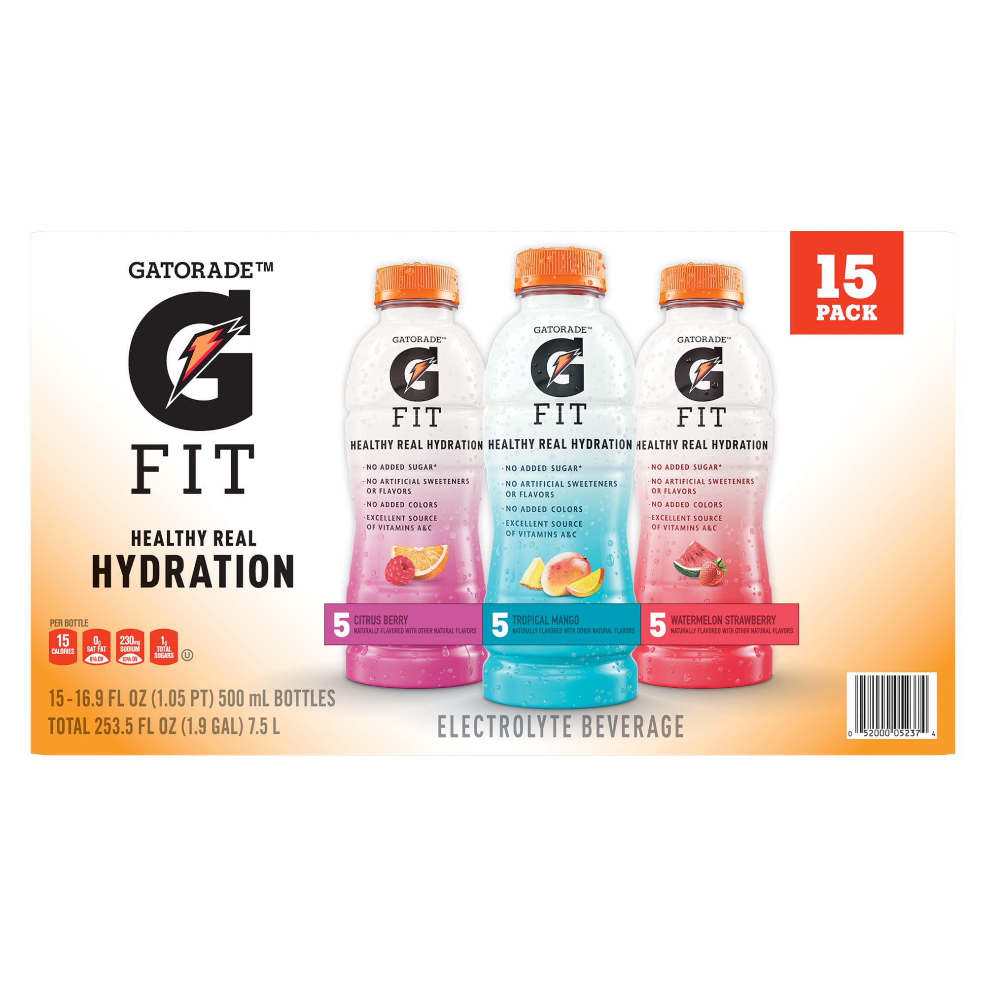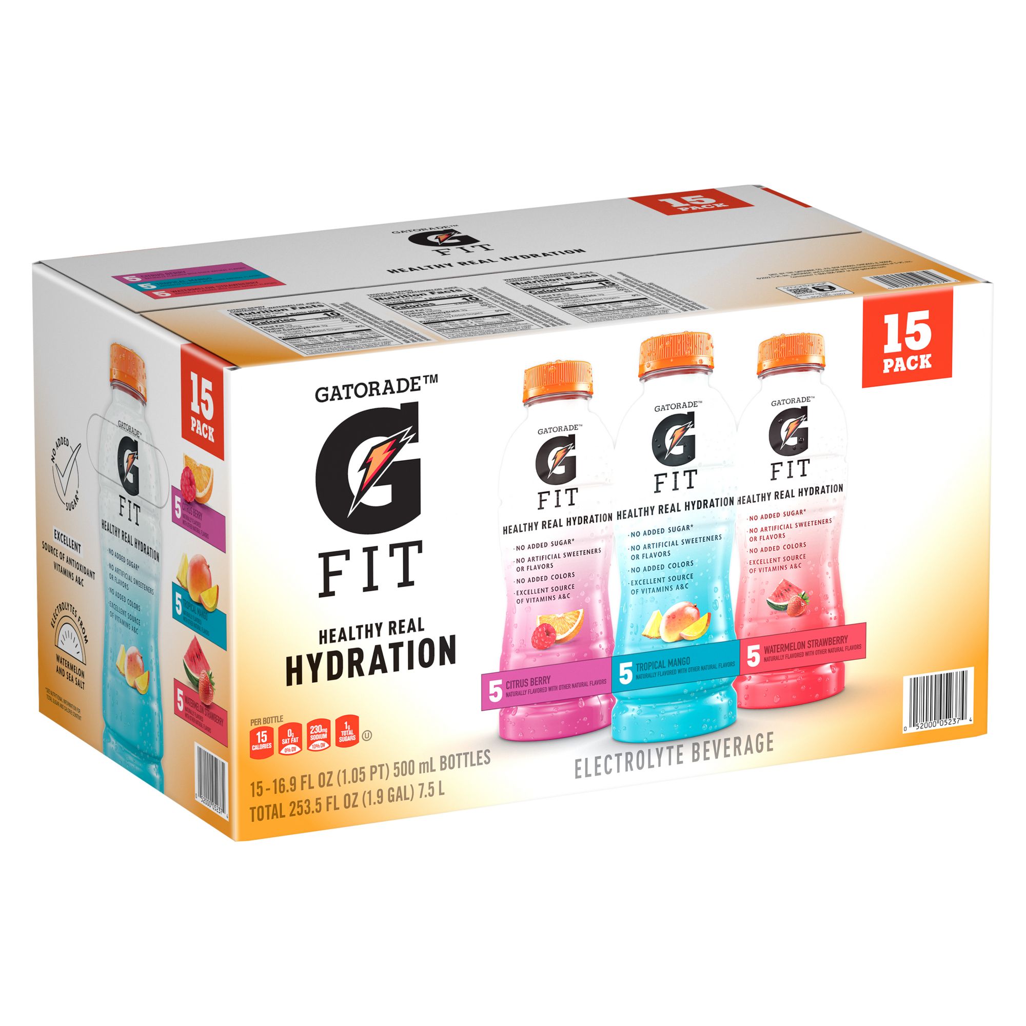 Gatorade fit electrolyte beverage 4 flavor variety pack, 15 pk./16.9 fl. oz. Healthy real hydration from Gatorade Includes fifteen 16.9 fl. oz. bottles Variety pack features three flavors - Tropical mango, citrus berry, and watermelon strawberry (five bottles each) No added sugar No artificial flavors or sweeteners No added colors Excellent source of vitamins A & C