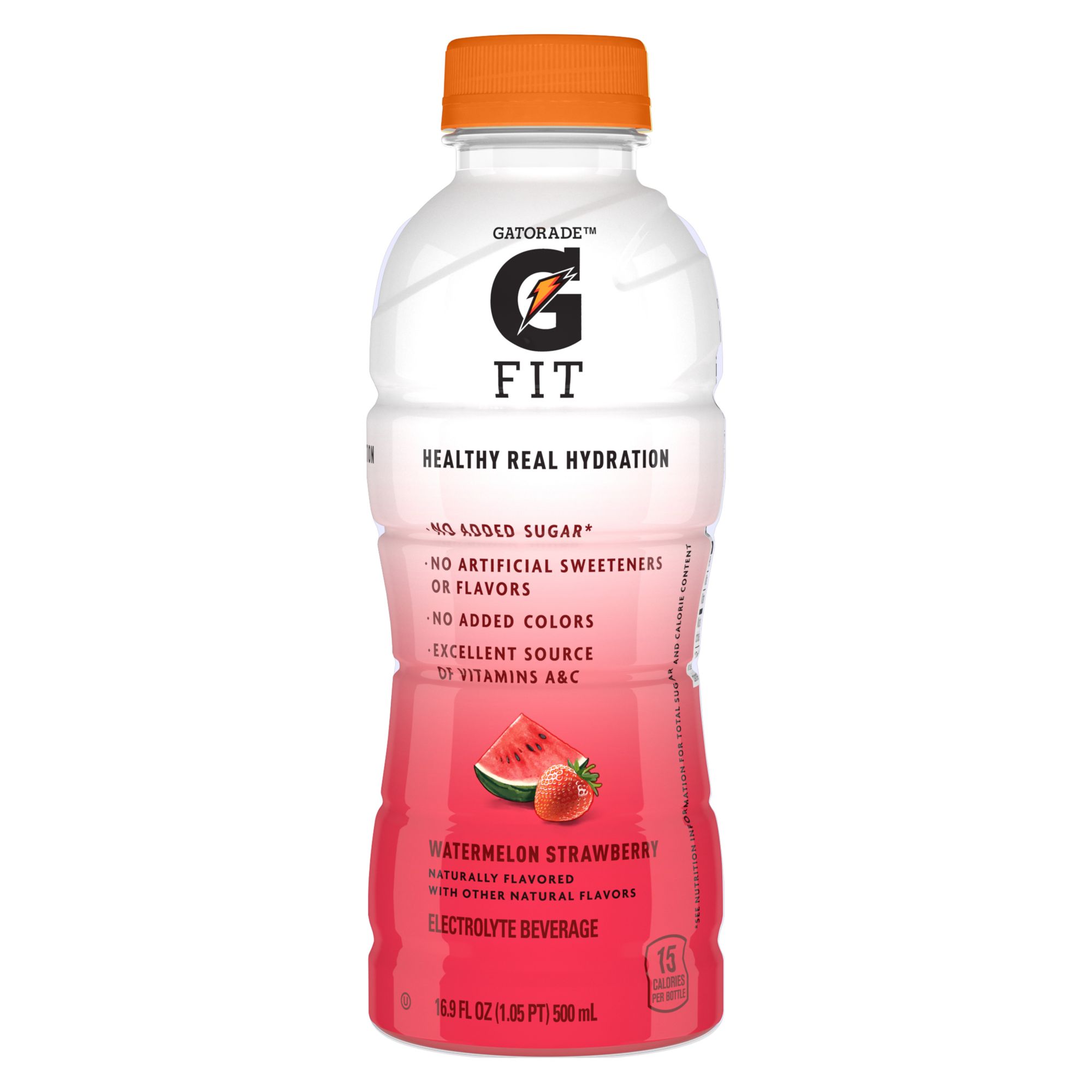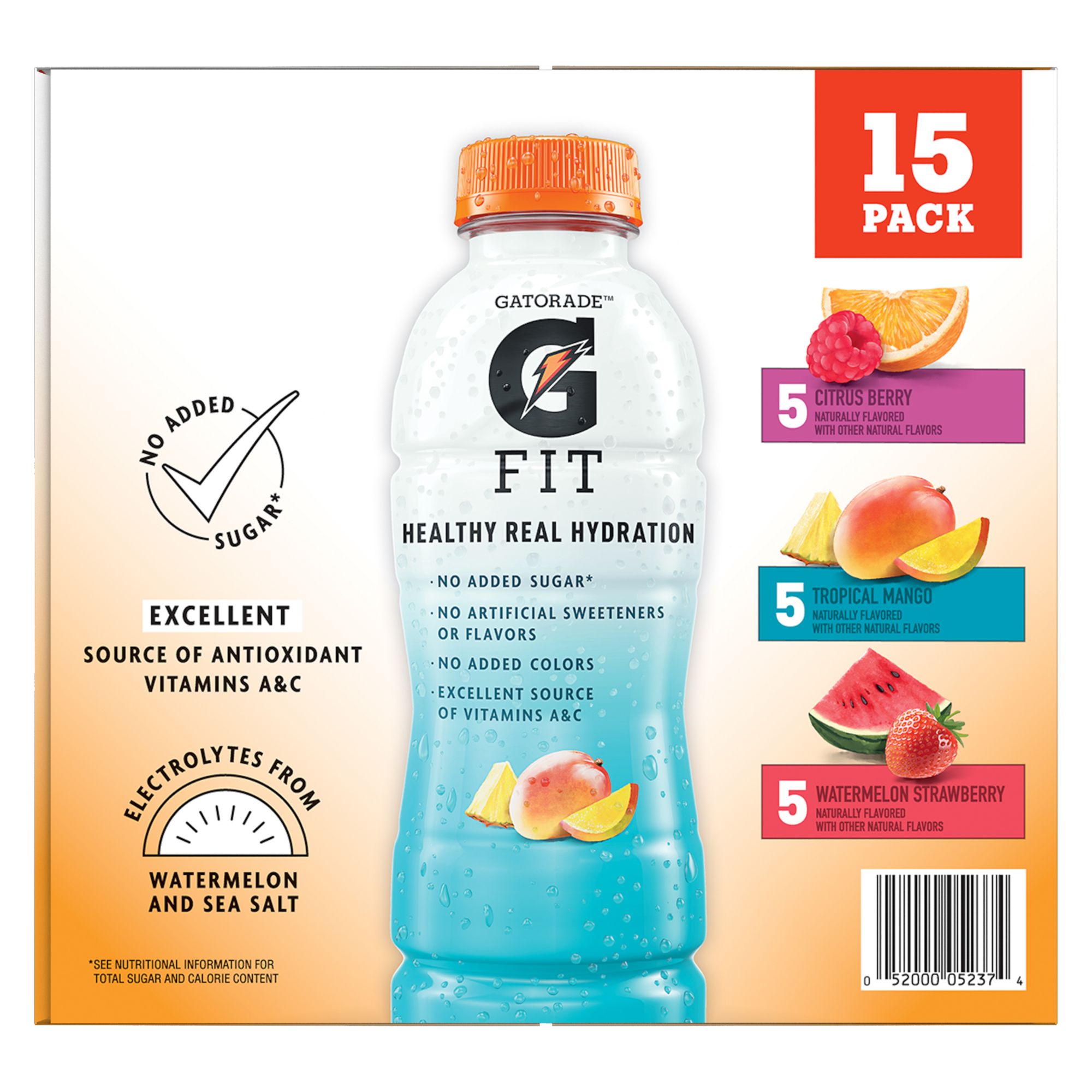 Gatorade fit electrolyte beverage 4 flavor variety pack, 15 pk./16.9 fl. oz. Healthy real hydration from Gatorade Includes fifteen 16.9 fl. oz. bottles Variety pack features three flavors - Tropical mango, citrus berry, and watermelon strawberry (five bottles each) No added sugar No artificial flavors or sweeteners No added colors Excellent source of vitamins A & C
