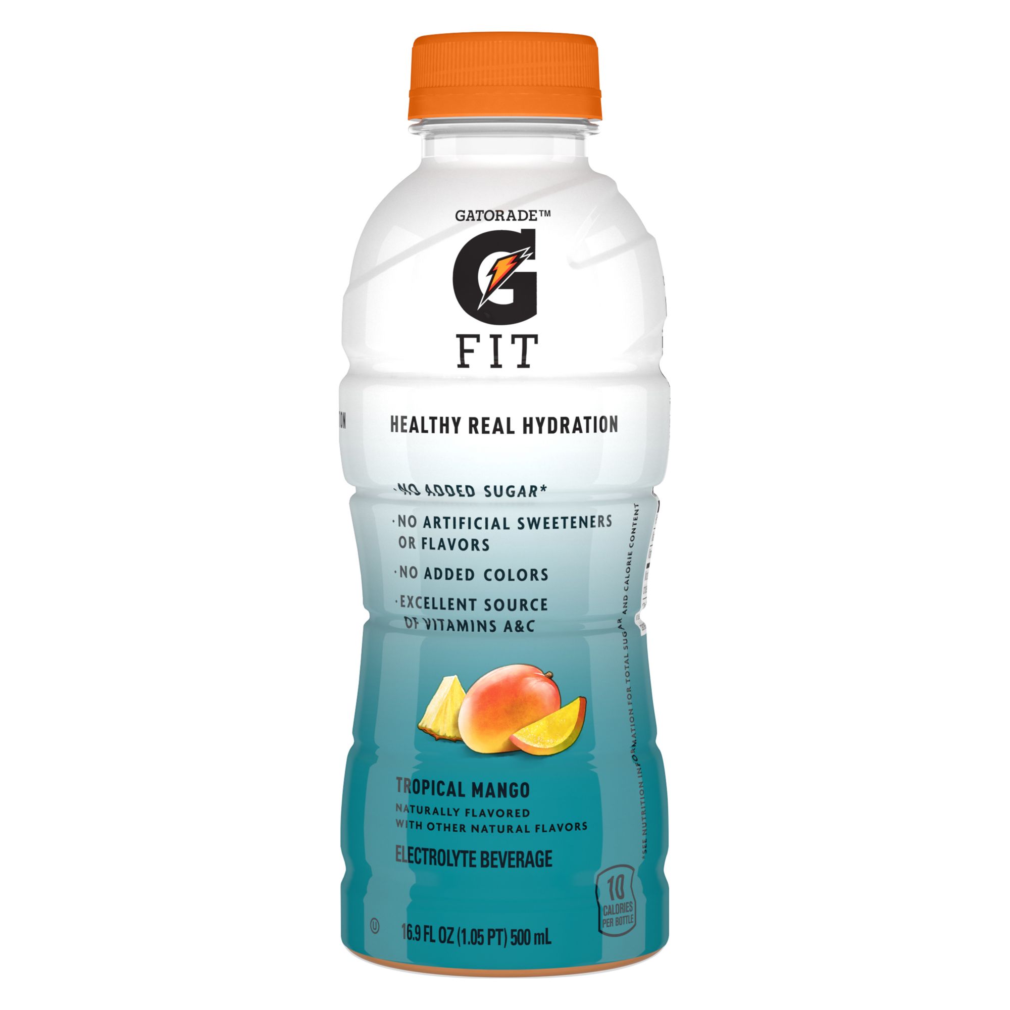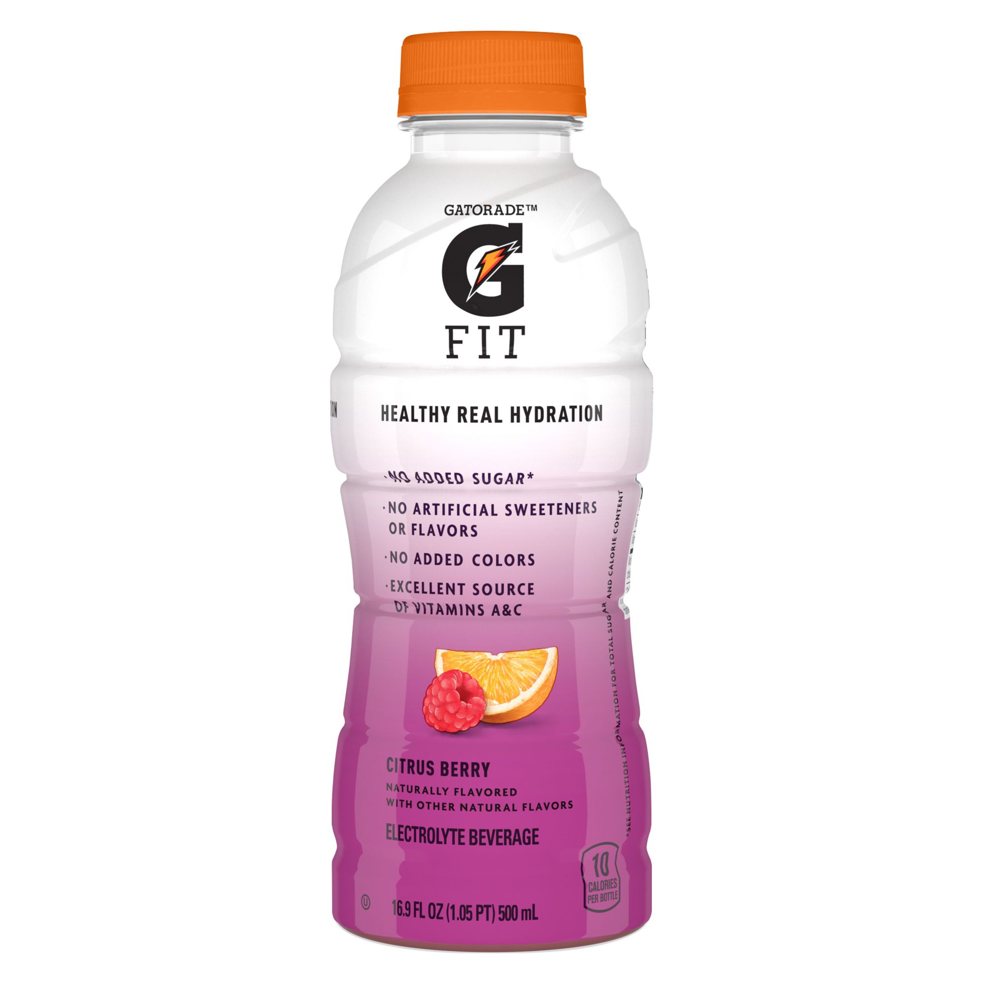 Healthy Real Hydration: Gatorade Fit is the newest electrolyte beverage from Gatorade and is formulated for active people looking for healthy, real hydration. Gatorade Fit Healthy Real Hydration Electrolyte Beverages contain no added sugar, no artificial sweeteners or flavors, and no added colors. Gatorade Fit has 10 calories per bottle and is an excellent source of Vitamins A & C.
