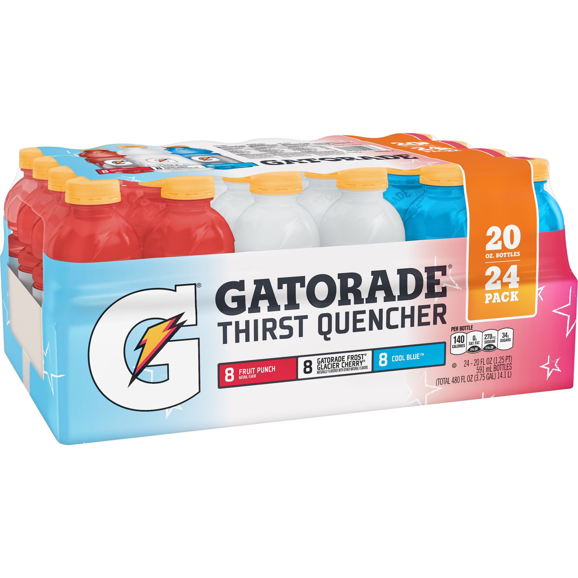 Gatorade Thirst Quencher is the most scientifically researched and game-tested way to replace electrolytes lost in sweat. It hydrates better than water and is trusted by some of the world's best athletes, but non-athletes will enjoy its flavorful benefits, too. It hydrates better than water and is trusted by some of the world's best athletes, but non-athletes will enjoy its flavorful benefits, too. This pack features Cool Blue, Fruit Punch, and Glacier Cherry flavor Gatorade bottles.