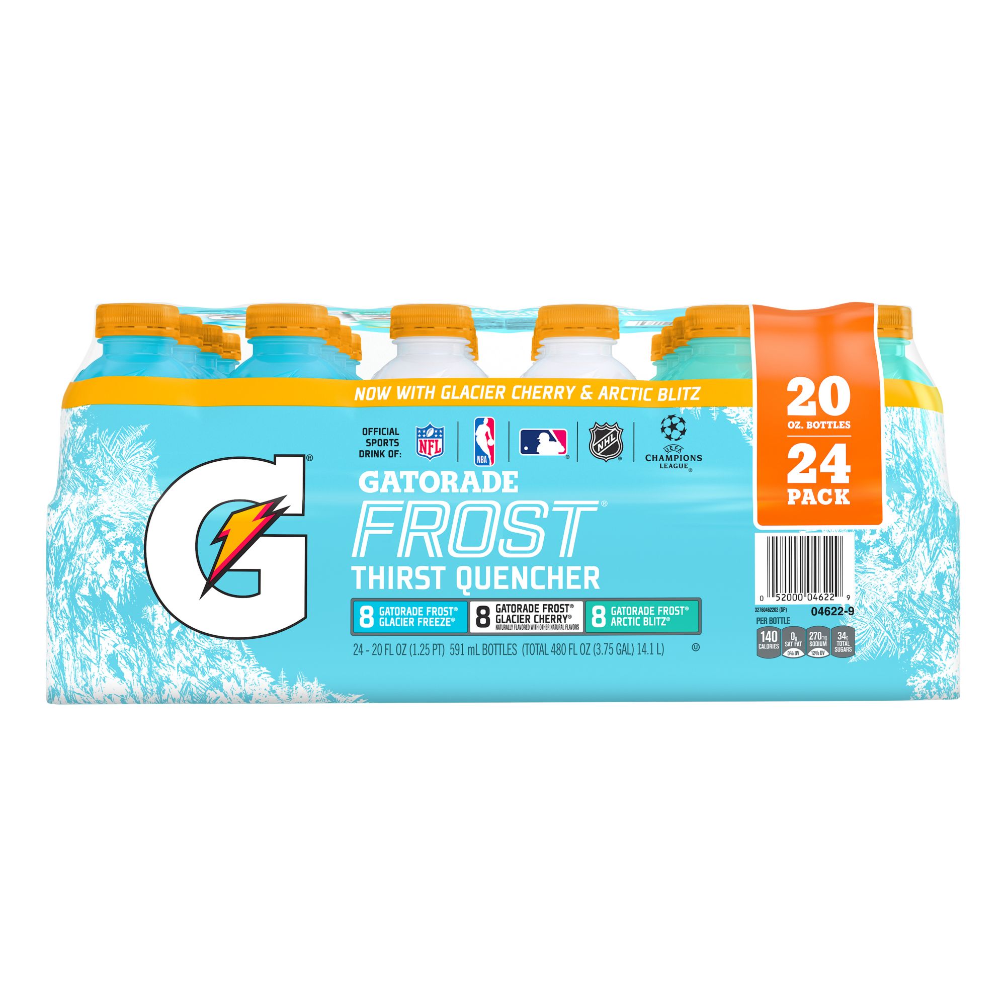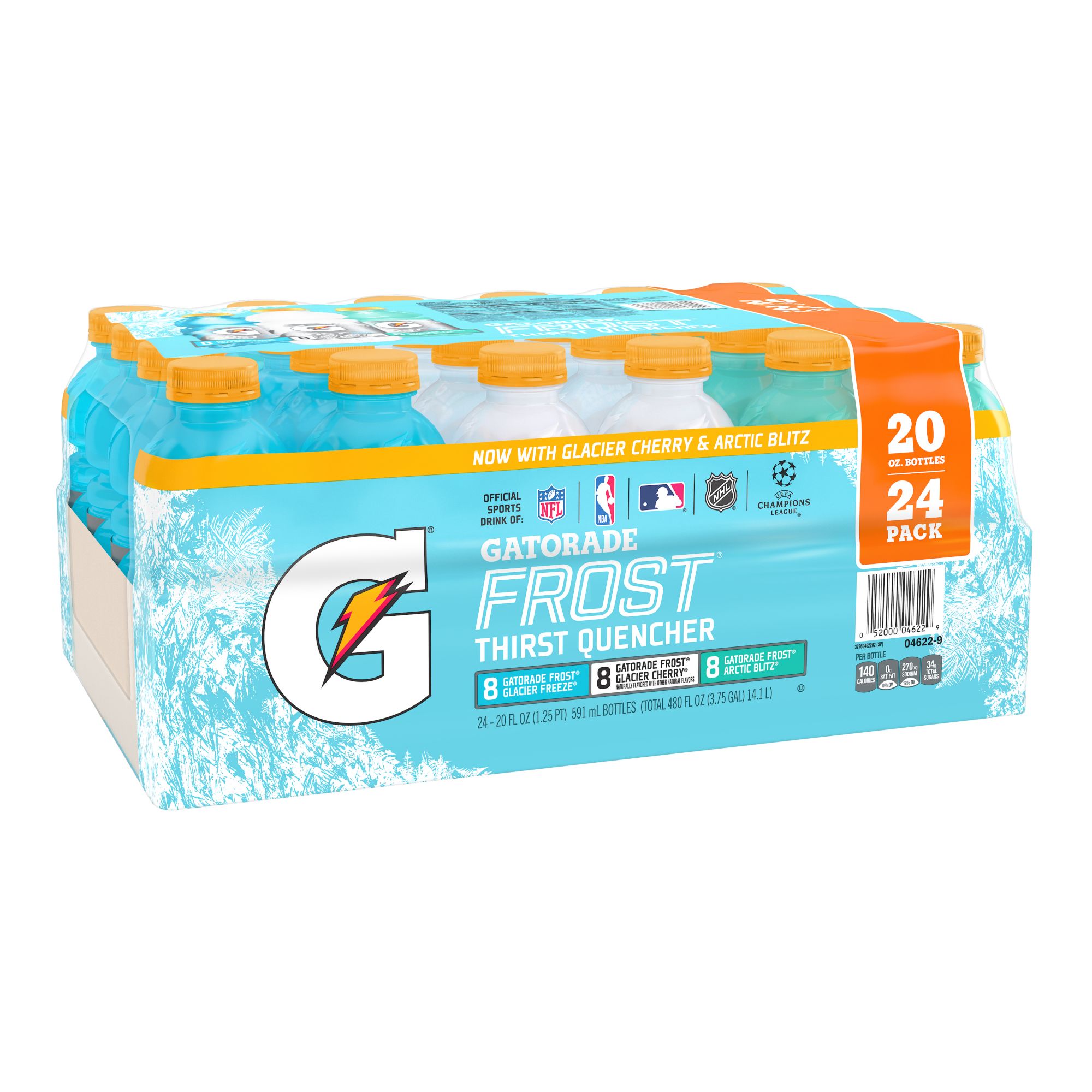 Includes eight 20-oz. Glacier Ice, eight 20-oz. Riptide Rush and eight 20-oz. Cascade Crash bottles