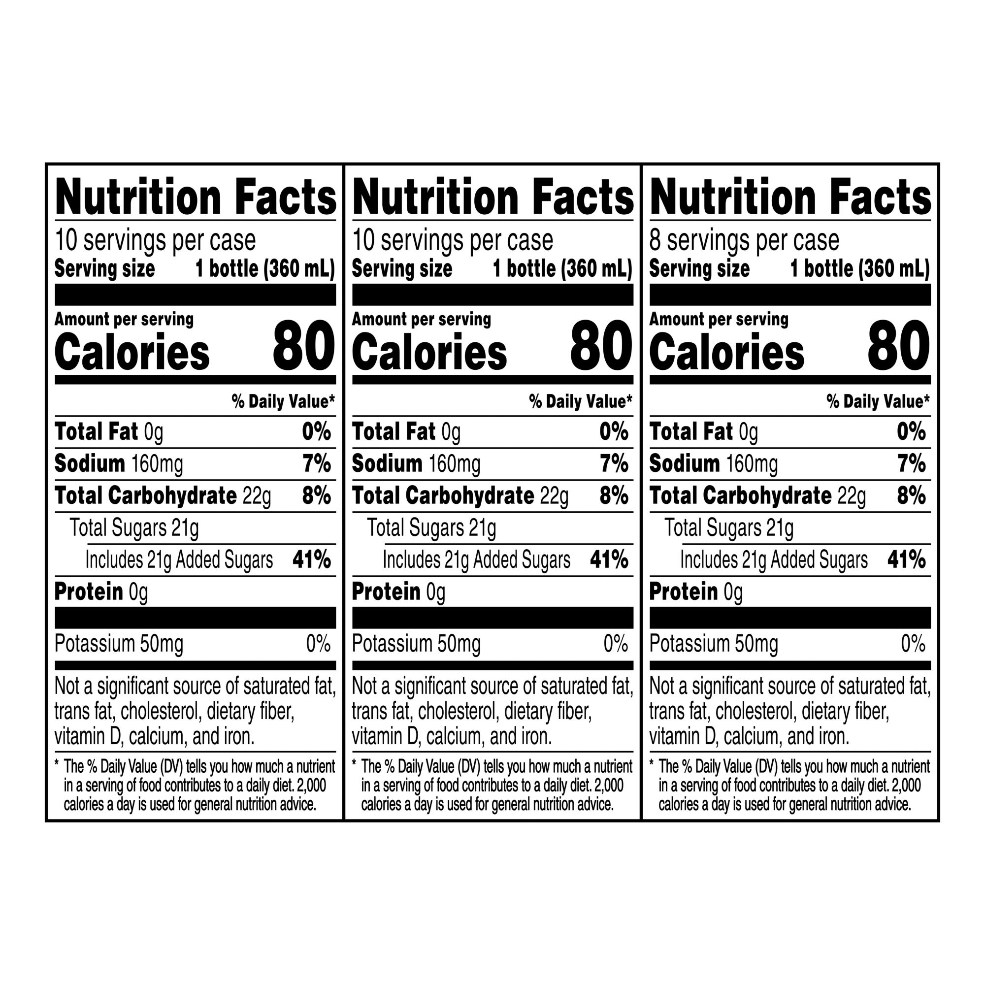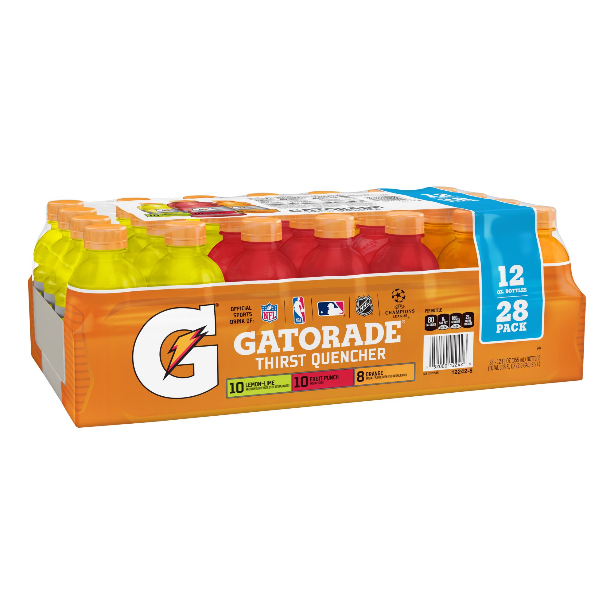 - Includes ten 12-oz. Fruit Punch, ten 12-oz. Lemon Lime and eight 12-oz. Orange bottles