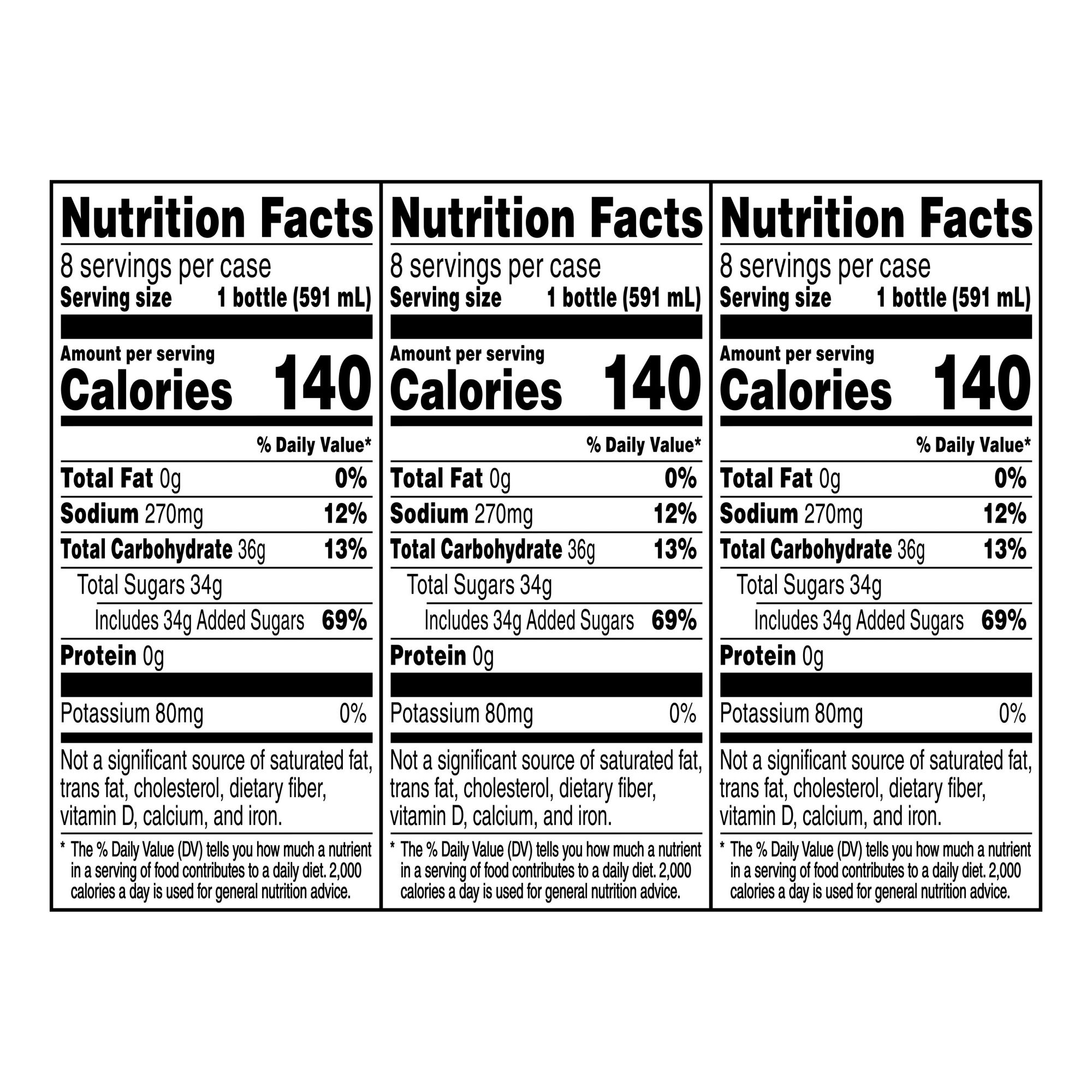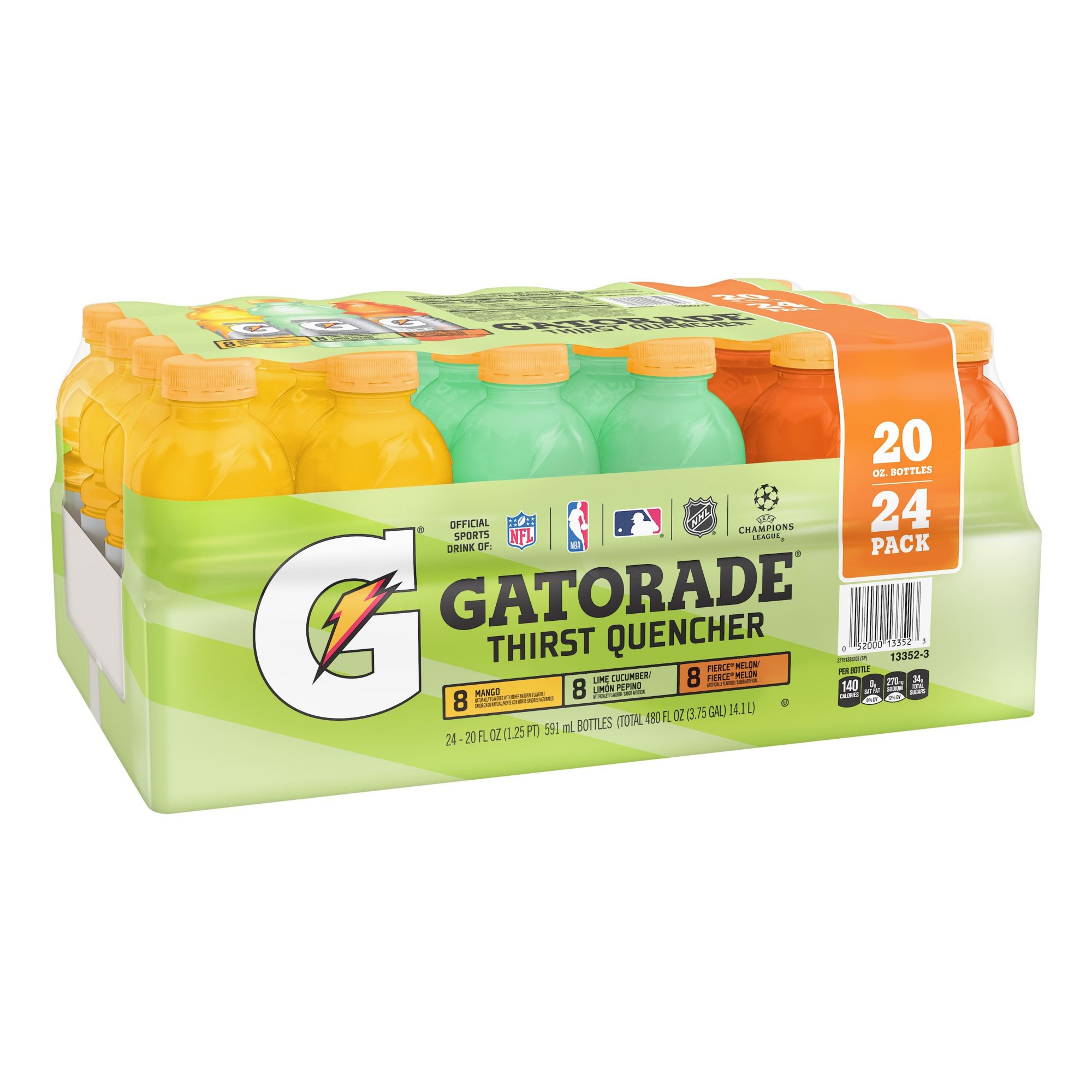 Includes eight mango, eight lime cucumber, and eight fierce melon 20 oz Gatorade bottles.