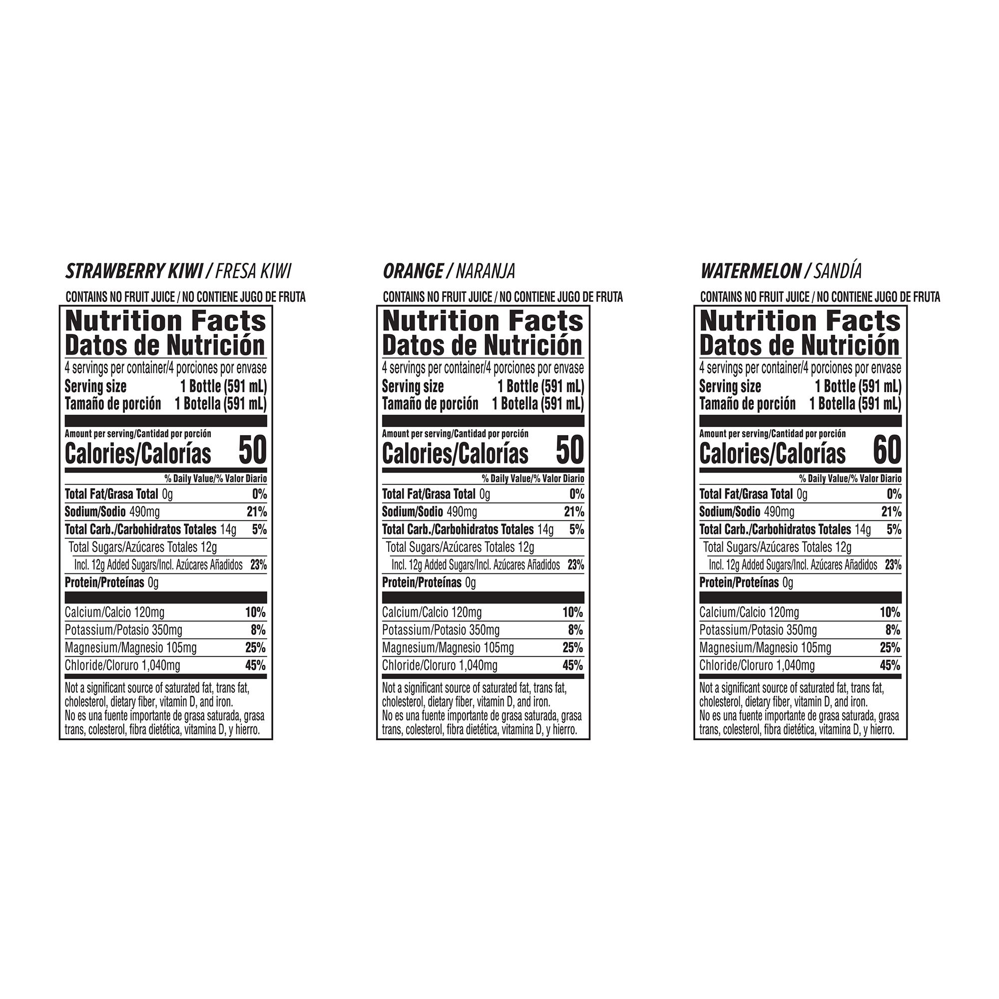 Includes electrolyte beverage variety pack, 12 pk./20 oz. ea.