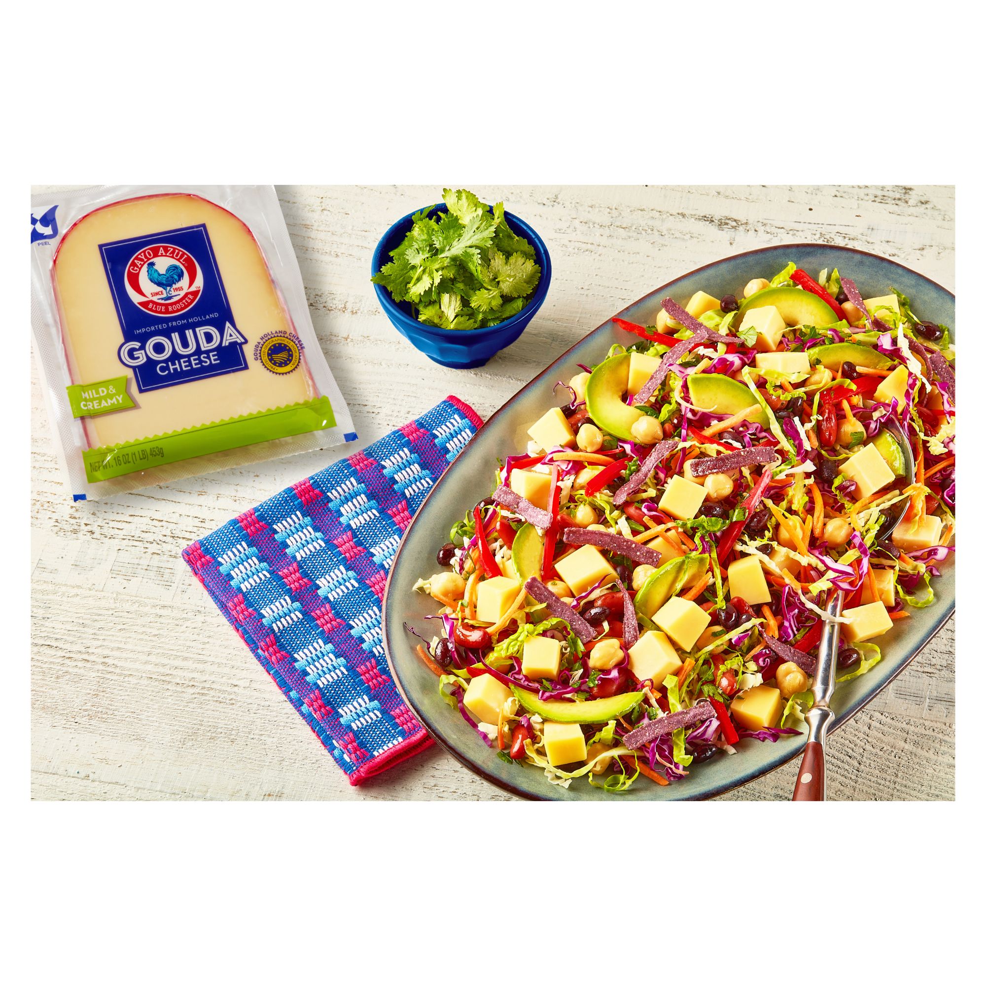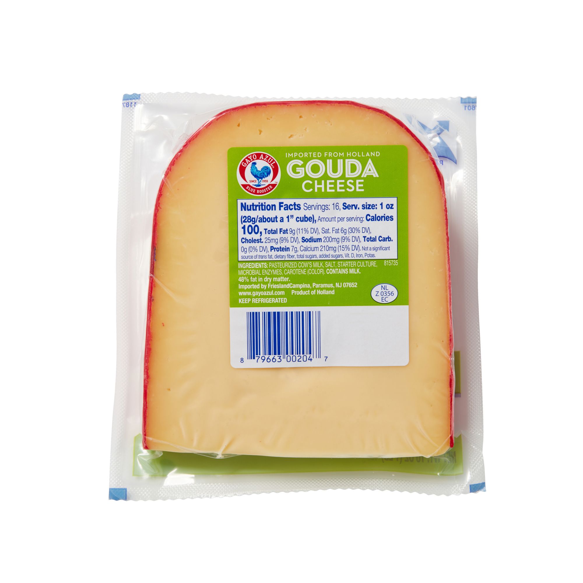 Gayo Azul Gouda Cheese is an award winning and beloved cheese. Imported from the Netherlands this young cheese carries over the rooted traditions of Dutch cheesemaking. Made with whole milk, it has a rich, buttery and slightly sweet flavor. It slices, shreds, and melts very well. It is excellent on a cheeseboard, in a casserole, as a topping or used in sauces and soups.