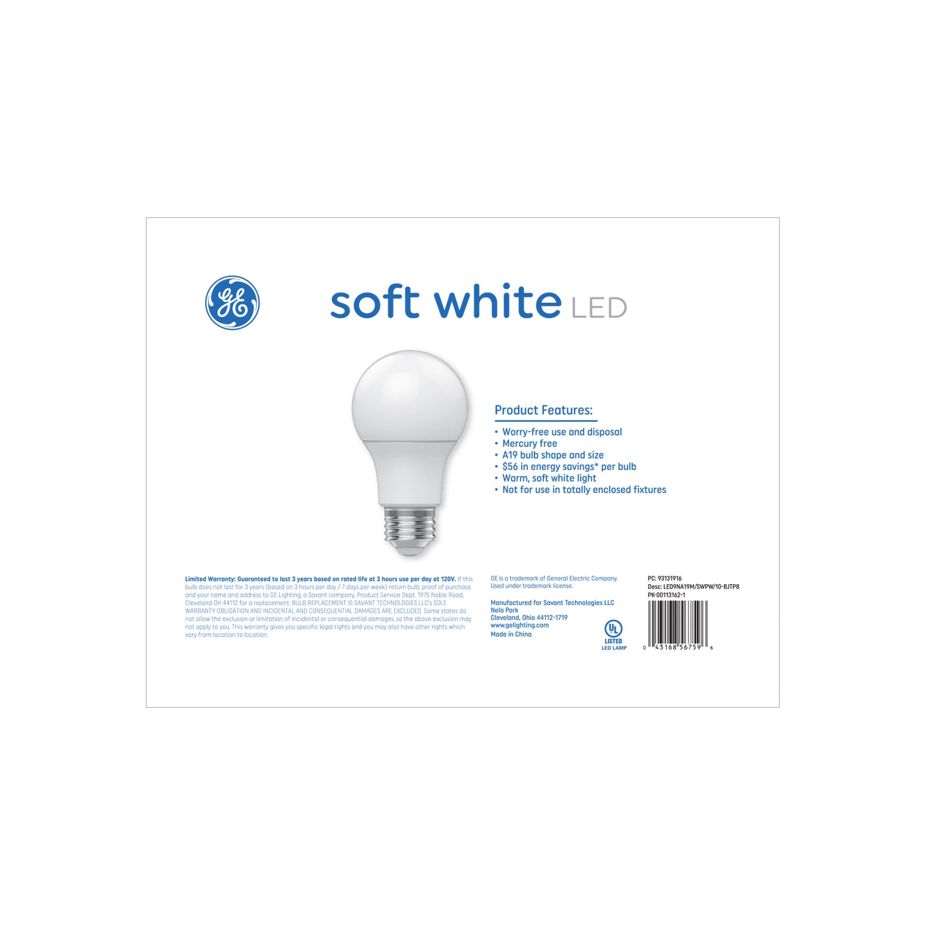 GE LED light bulbs offer outstanding energy efficiency, long-lasting performance and just-right brightness, all in one package. They illuminate your home with warm, soft white light. Unlike CFL bulbs, these LED bulbs feature instant full brightness and are free of Mercury. It’s great for frequently used fixtures — LED's long life and low energy use will help you save money on energy.