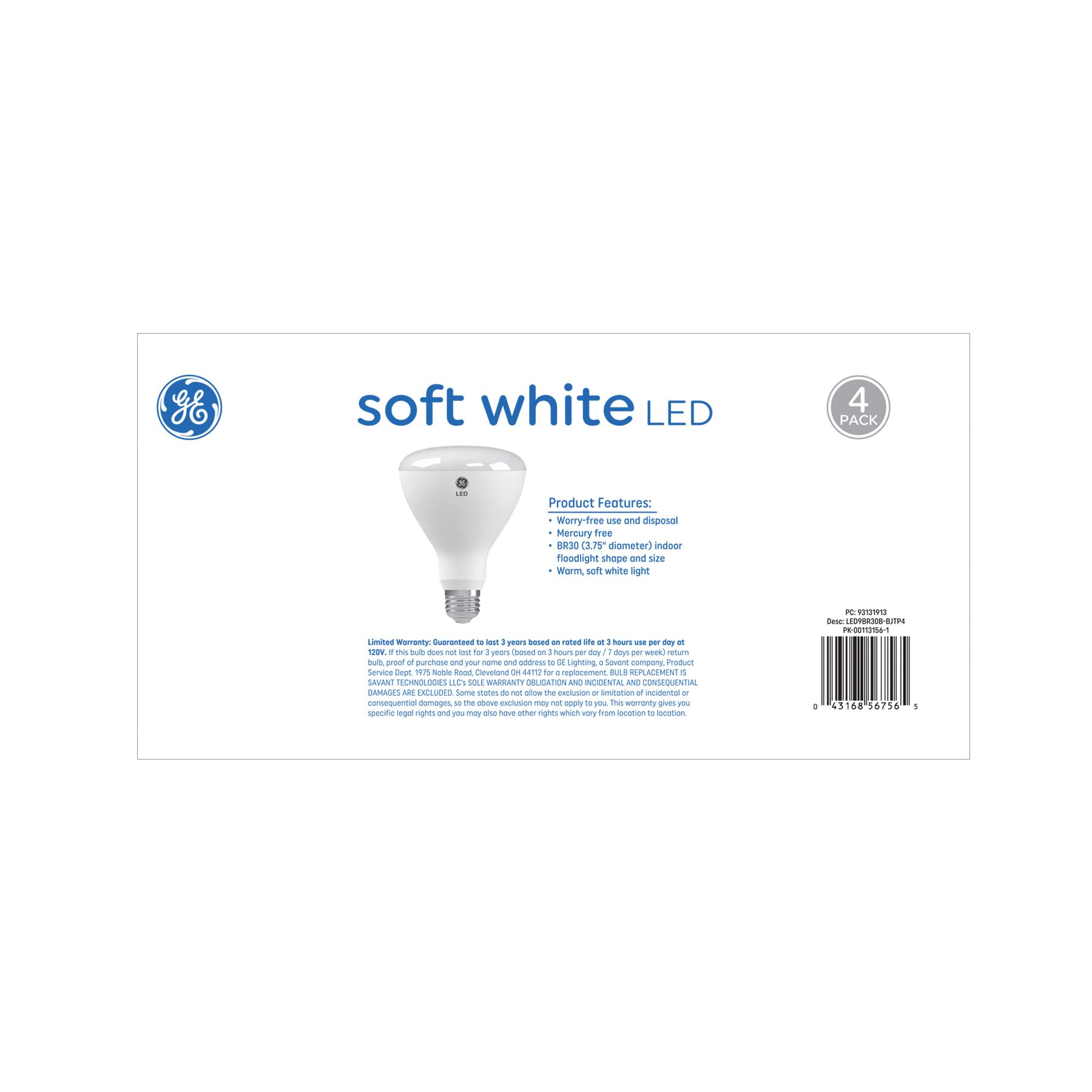 65-watt replacement using only 9 Watts (650 lumens) Rated to last 9.1 years with an annual operation cost of 1.08 dollars based on 3 hours per day use at 11 cents per KwH Non-Dimmable Warm, soft white light with 2700 Kelvin color temperature Includes (4) BR30 (3 and 3/4" diameter) shape and size bulbs