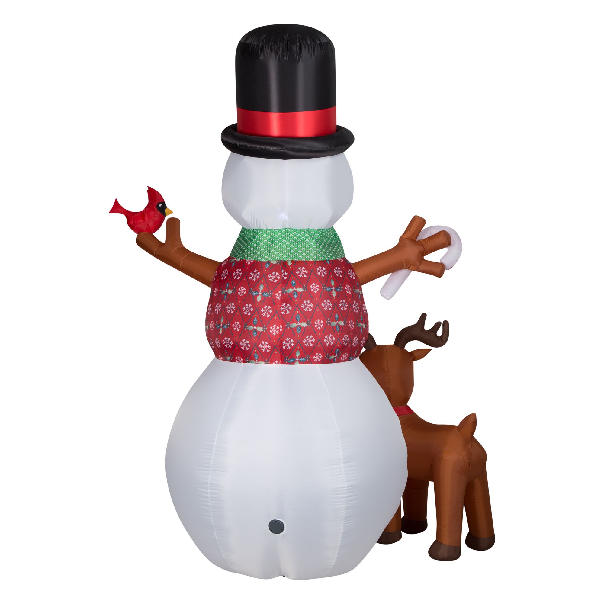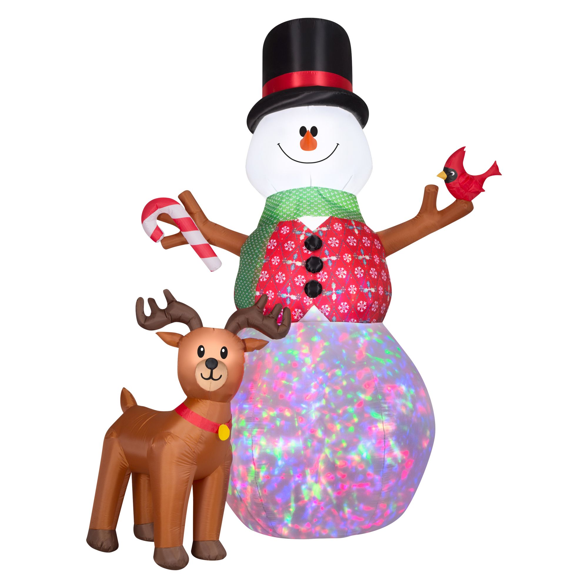 Celebrate the season with a Gemmy 10' Airblown Inflatable Animated Snowman and Friends. The dapper snowman wears a patterned vest and holds a red bird in one hand and a candy cane in the other. The snowman's belly lights up with glittery Kaleidoscope lights and his head turns left to right. Includes a charming reindeer pal. The setup is super simple: Just plug it in, stake it down and watch the magic unfold. Display this giant snowman inflatable as a standalone or combine it with other Airblown Inflatables to create a custom scene.