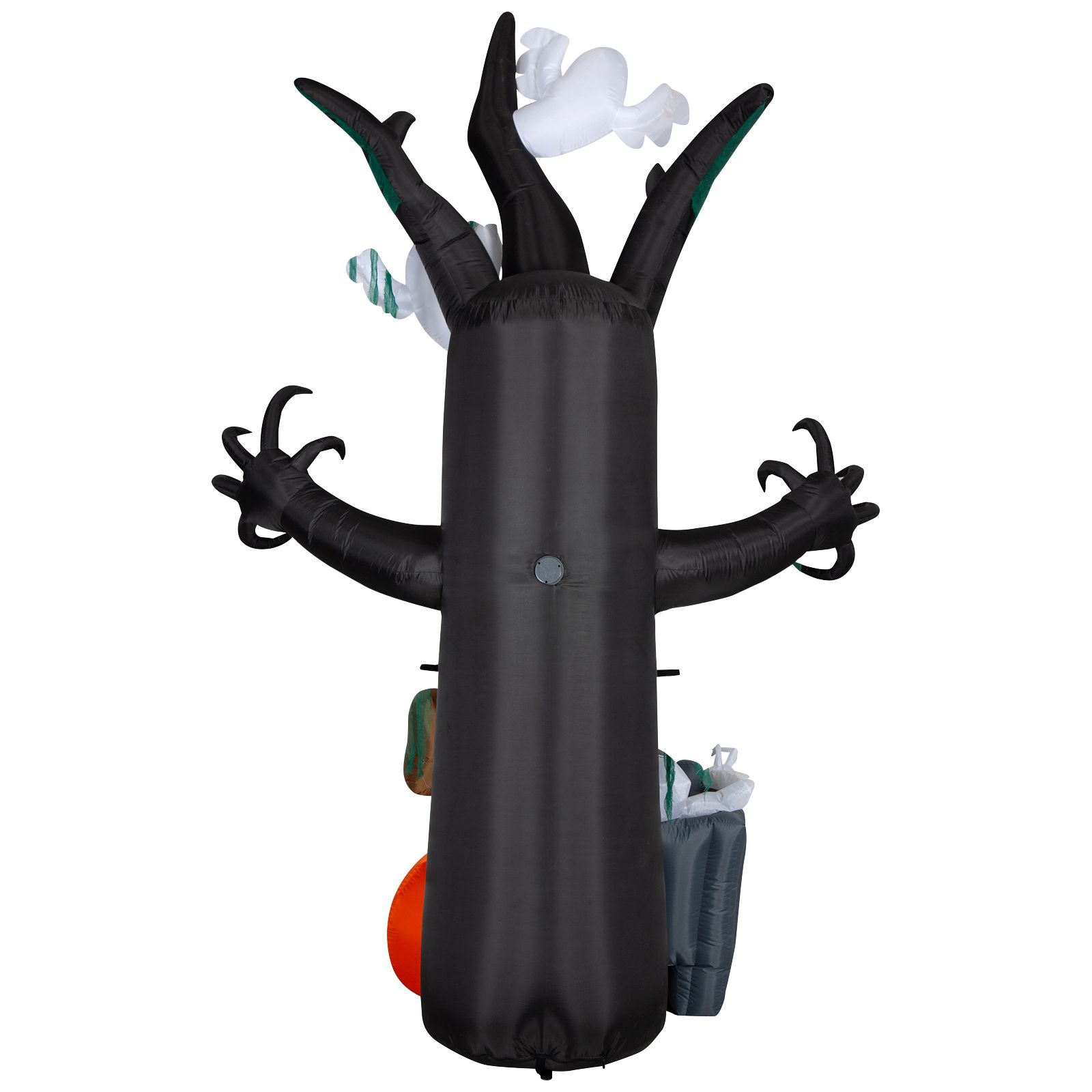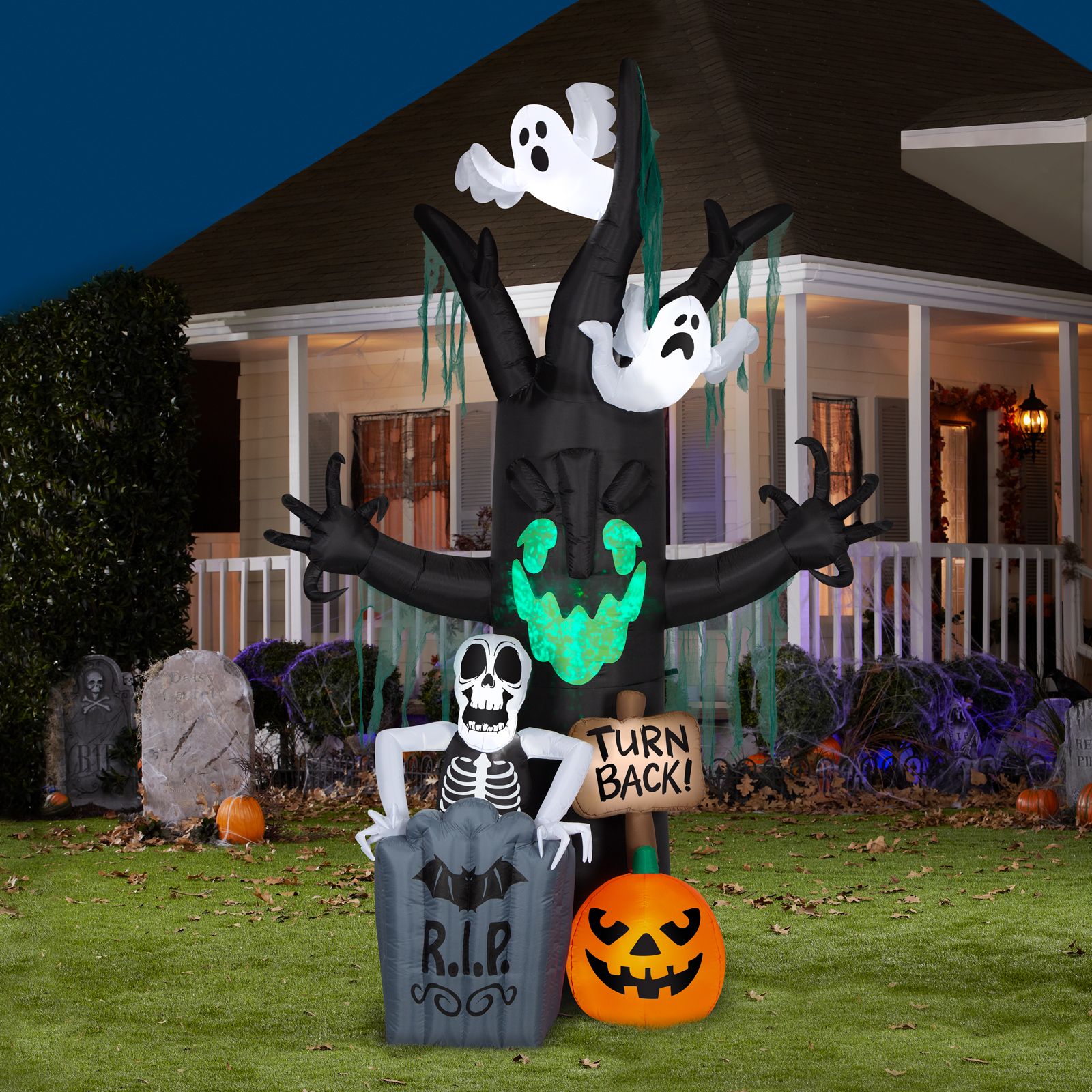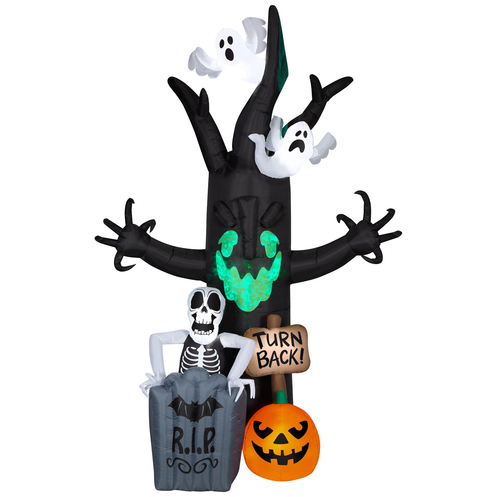 Create a spooky Halloween vibe with this airblown inflatable haunted tree. This spooky black tree has green, swirling kaleidoscope technology and holds a duo of ghosts in its branches. It includes flashing lights, a jack-o'-lantern at the base of the trunk with a "Turn Back!" sign and a skeleton that pops up behind a tombstone. Setup is a snap for the easiest Halloween decorating ever. Just plug it in, stake it down and watch the magic unfold. Includes everything needed for easy outdoor setup.