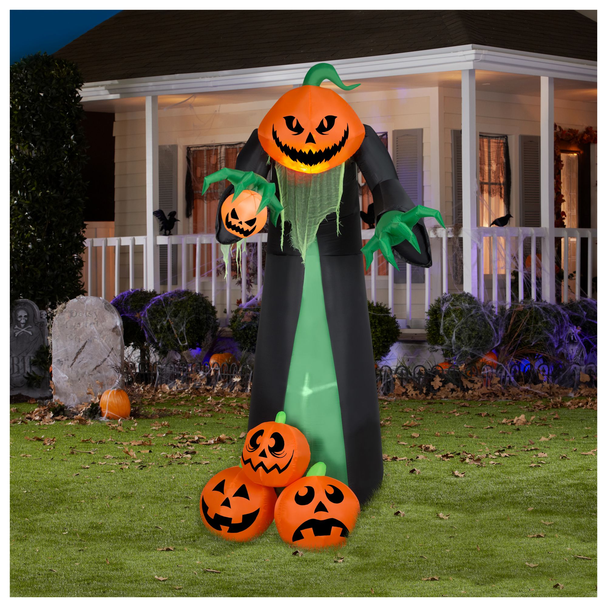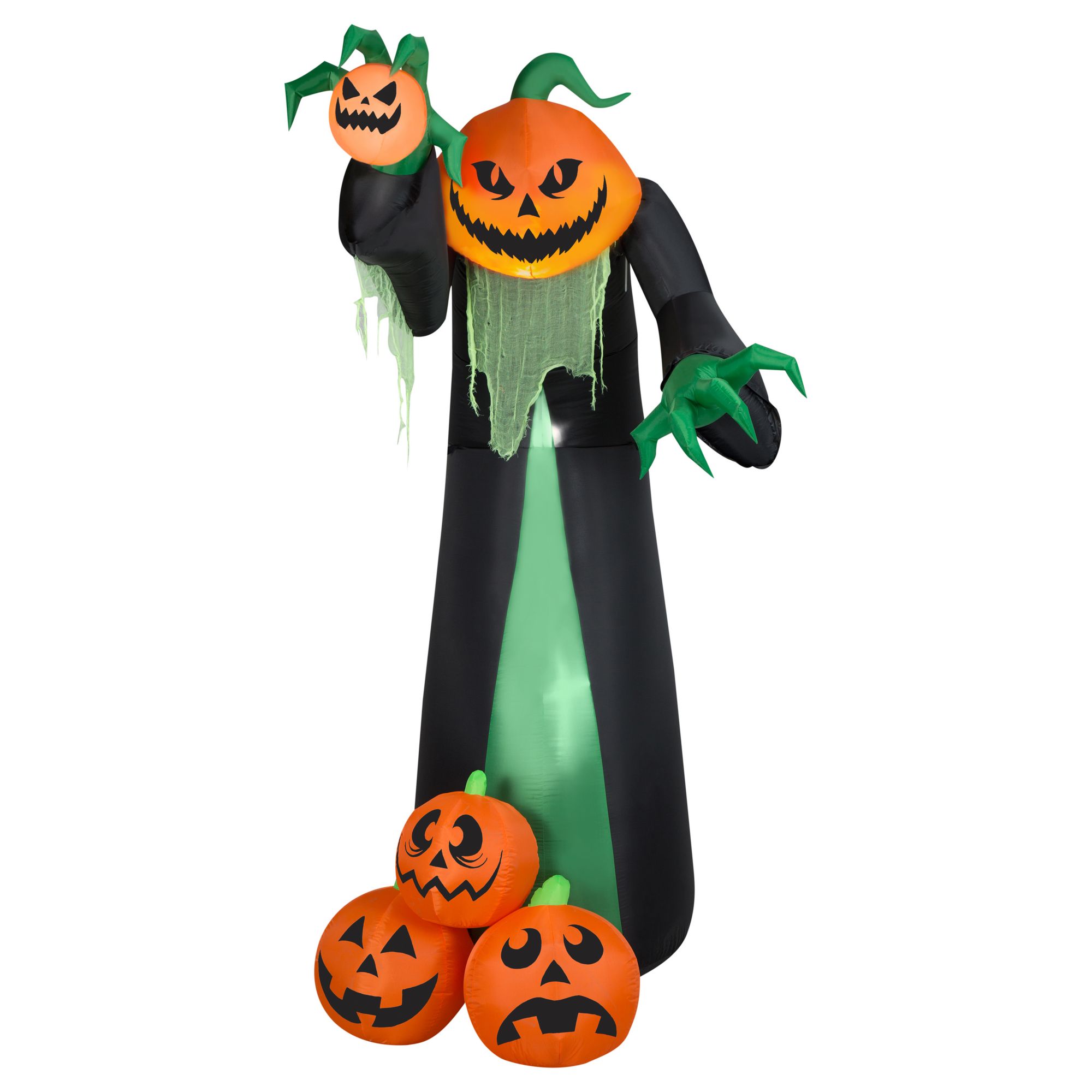 Kick up the fright factor with a giant animated Airblown Inflatable Reaper with Lightshow Fire and Ice technology. Standing 10' tall, this frightful reaper makes an eye-popping addition to your Halloween decorations. This animated reaper lights up with realistic, flickering flames and reaches forward for a spooktacular effect. Includes three jack-o'-lanterns at the reaper's feet and one in his hand. The setup is super simple. Just plug it in, stake it down and watch the magic unfold. Display this giant Halloween inflatable as a standalone or combine it with other Airblown Inflatables to create a custom scene. Perfect for Halloween parties and haunted houses.