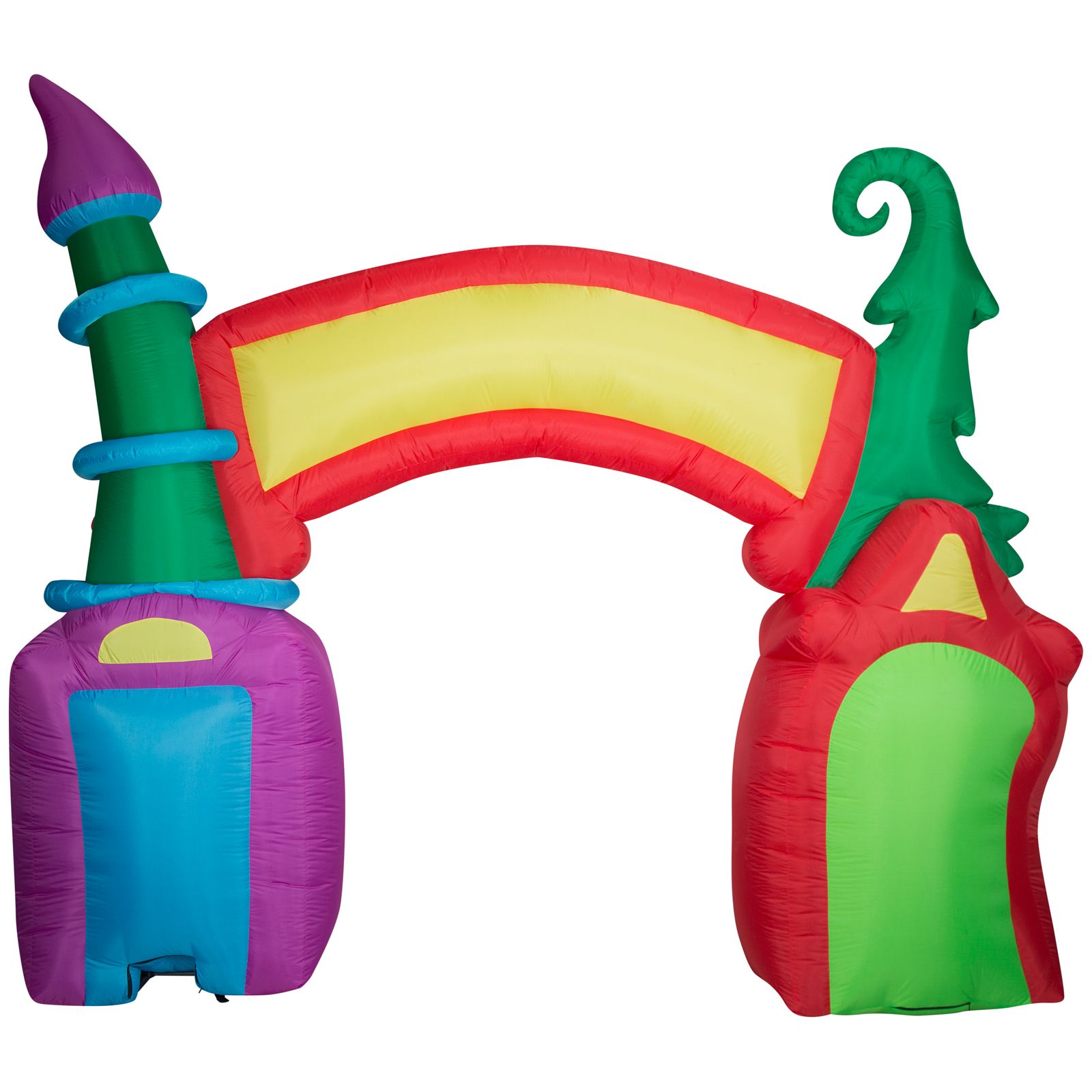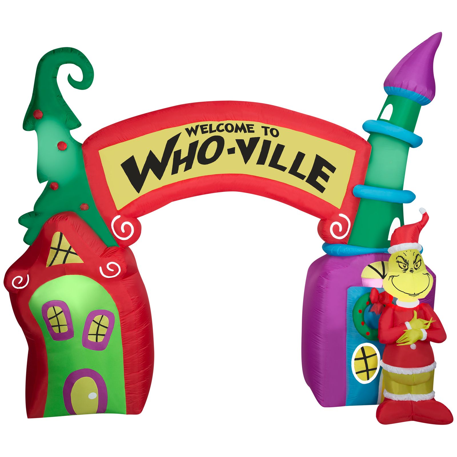 Fans of "How the Grinch Stole Christmas" will love this airblown inflatable Who-ville archway! Styled with bright colors and whimsical shapes, the Who-Ville Christmas archway creates an eye-catching focal point, party entrance or photo op. The archway includes a "Welcome to Who-ville" sentiment and the Grinch himself with his signature smirky smile. This charming Christmas inflatable makes a one-of-a-kind addition to your indoor or outdoor decorations. Set up is in a snap for the easiest decorating ever. Just plug it in, stake it down and watch the magic unfold. Includes everything needed for easy outdoor setup.