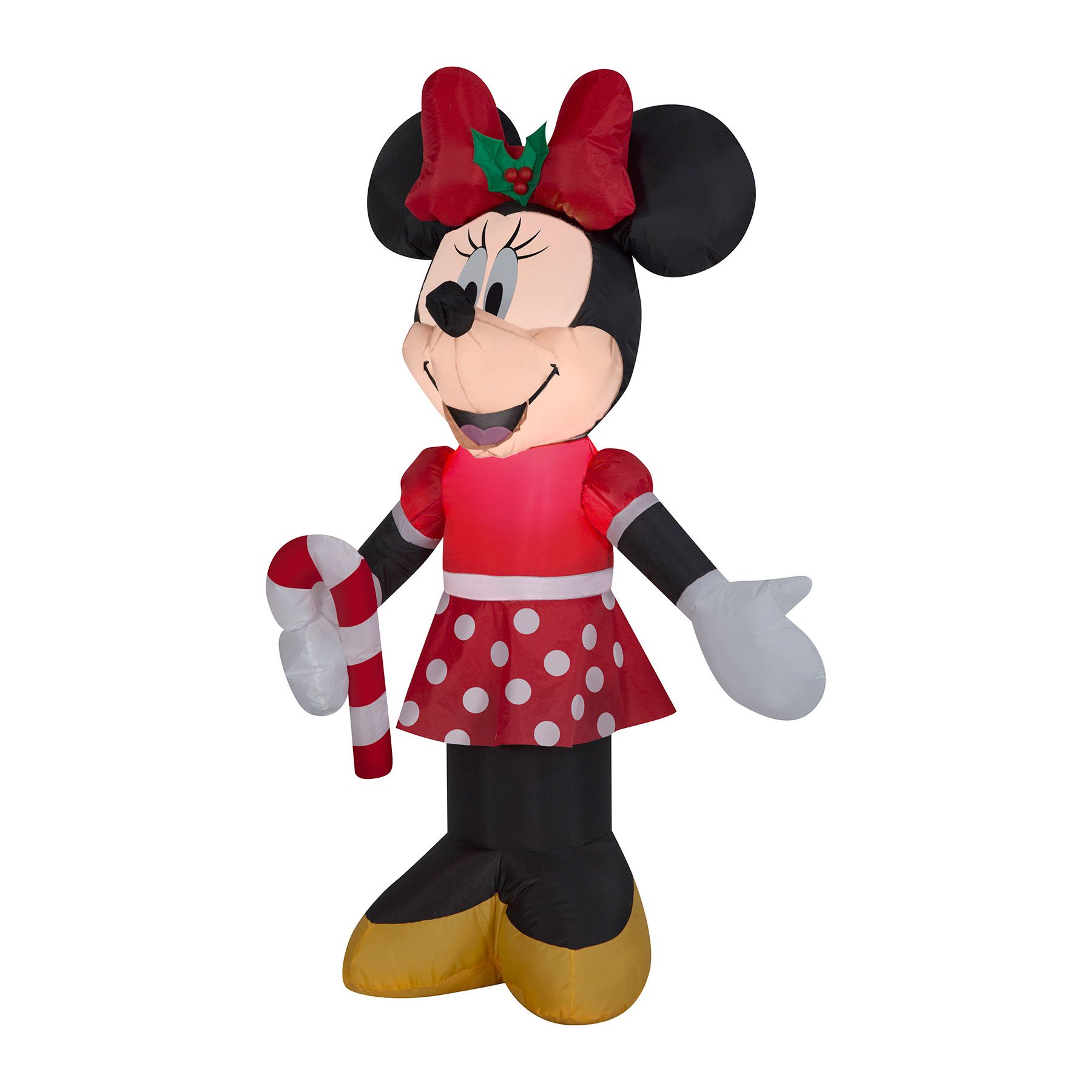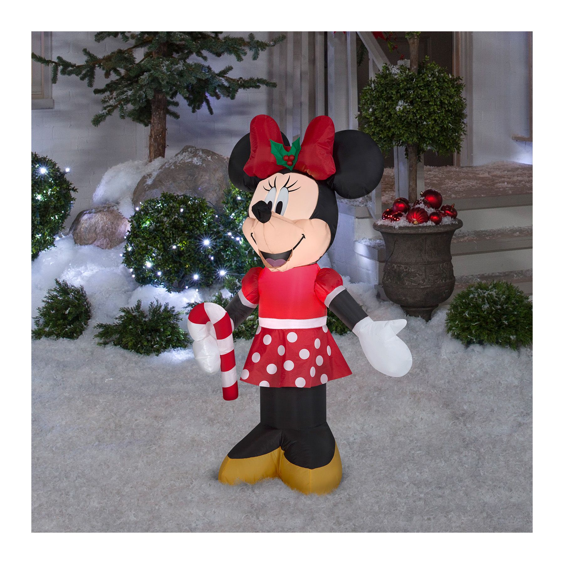 Deck the yard with an Airblown Inflatable Minnie Mouse. Dressed for the season in a polka dot holiday outfit, the Minnie Mouse inflatable holds a big candy cane and makes an eye-catching addition to your indoor or outdoor Christmas decorations. The setup is super simple. Just plug it in, stake it down, and watch the magic unfold. Display this Disney holiday decoration as a standalone or combine it with other Airblown Inflatables to create a custom scene. Includes everything needed for easy setup.