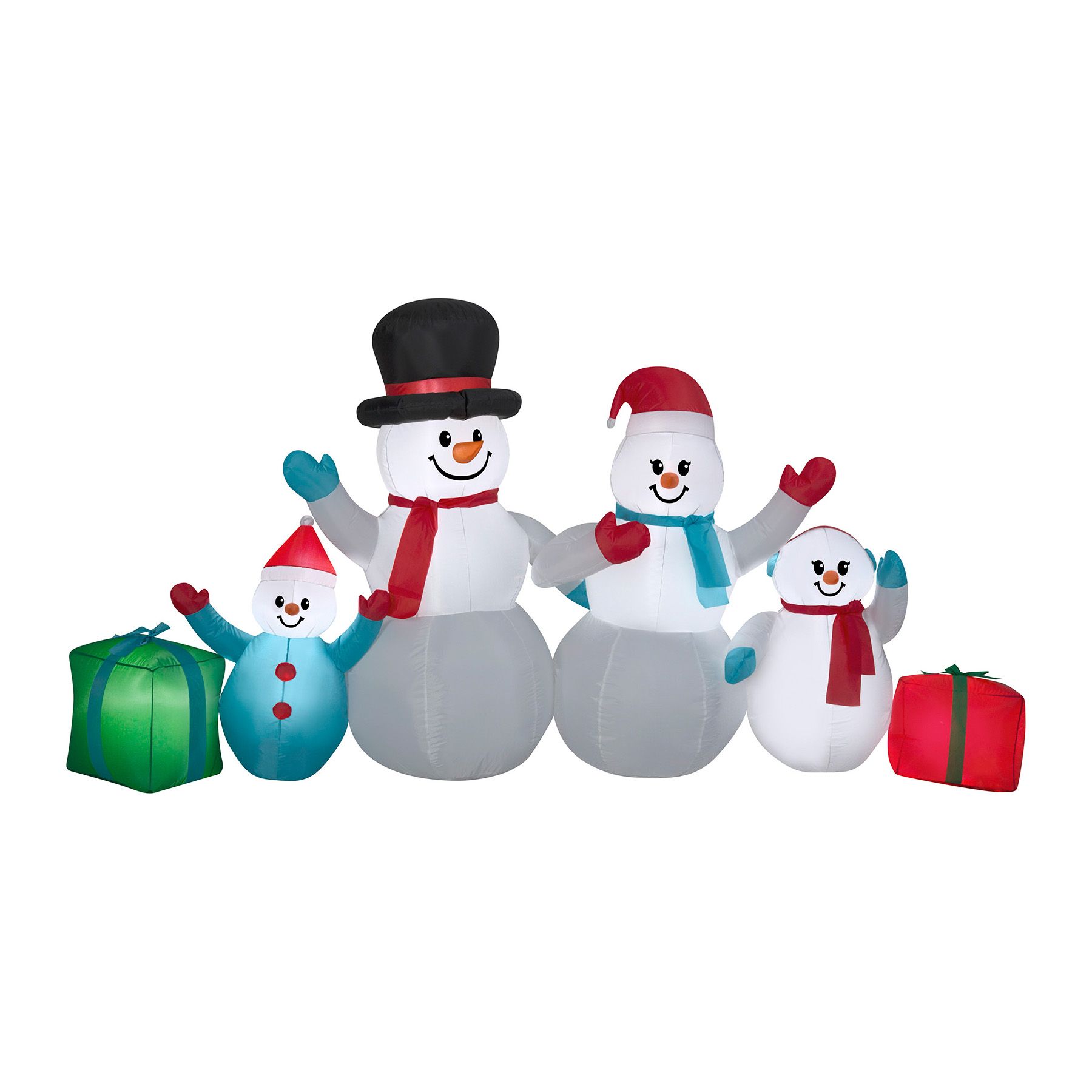 Make it a holly jolly Christmas with an Airblown Inflatable snowman family scene. Featuring four snowman figures—a mom, a dad, and two little snow kids. This charming Christmas inflatable includes two gift boxes in vibrant green and red. Perfect for indoor or outdoor Christmas decorating, this snowman inflatable makes an eye-catching addition to your outdoor Christmas decorations. Set up is in a snap for the easiest decorating ever. Just plug it in, stake it down, and watch the magic unfold. Be the talk of the block with a snowman family Christmas inflatable. Includes everything needed for easy setup.
