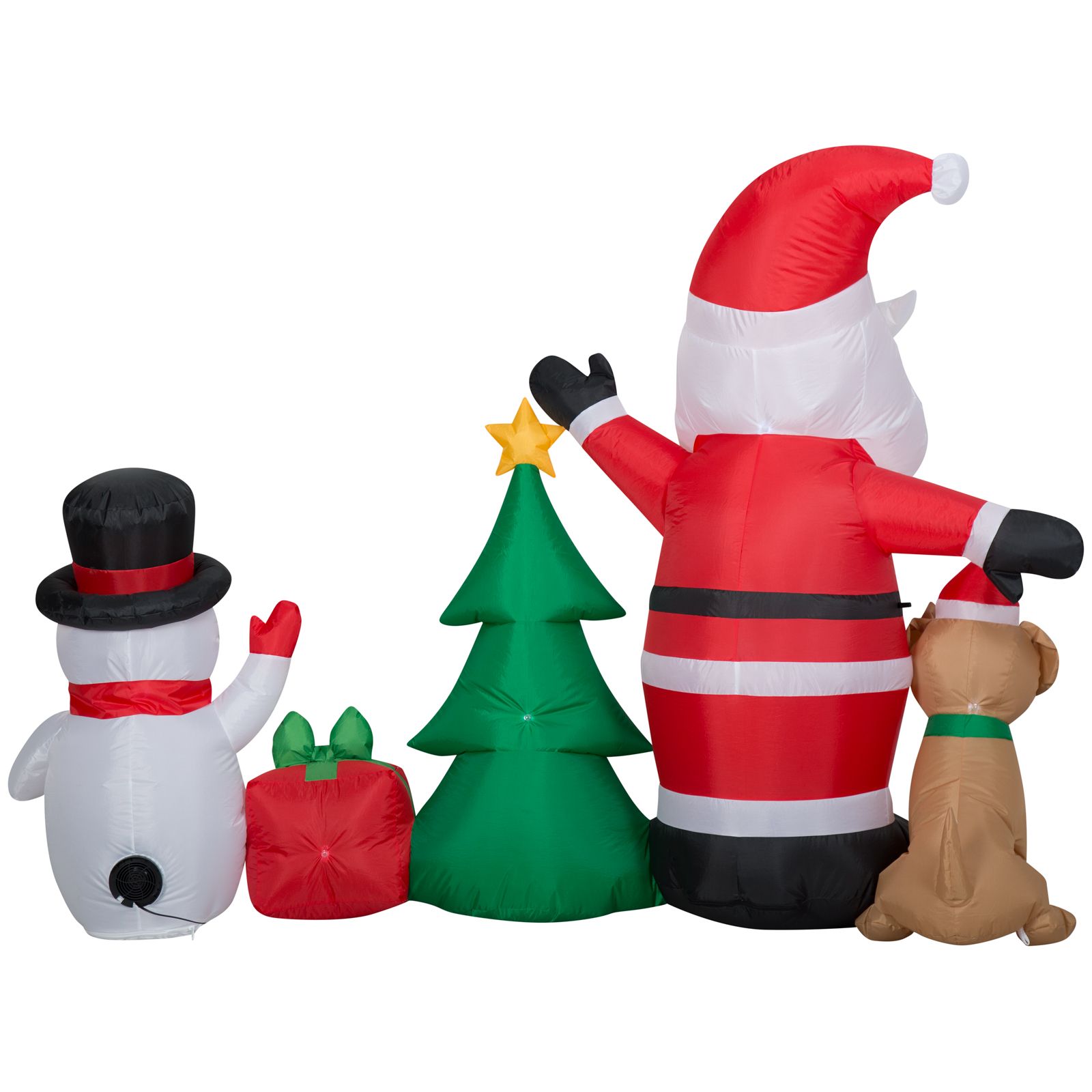 Deck the yard with an airblown inflatable Santa scene! This Santa is joined by a puppy, snowman, Christmas tree and gift box. It makes an eye-catching addition to your outdoor holiday display. The setup is super simple. Just plug it in, stake it down and watch the magic unfold. Display this Christmas inflatable as a standalone or combine it with other airblown inflatables to create a custom scene. Includes everything needed for easy outdoor setup.