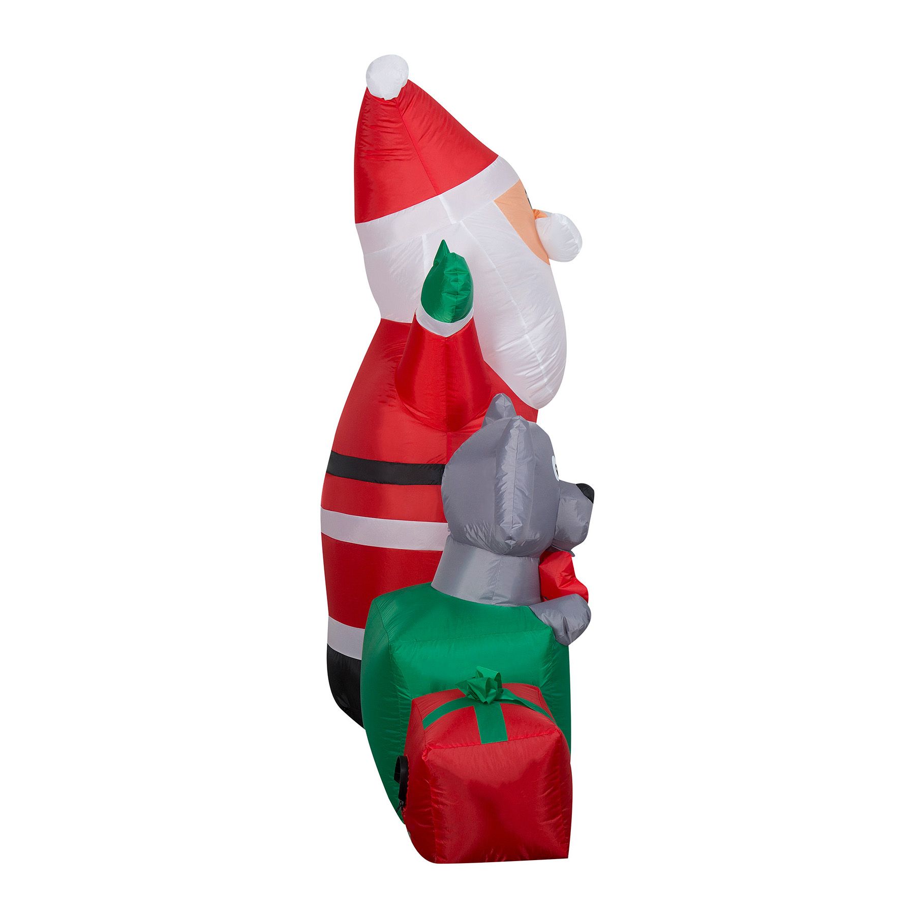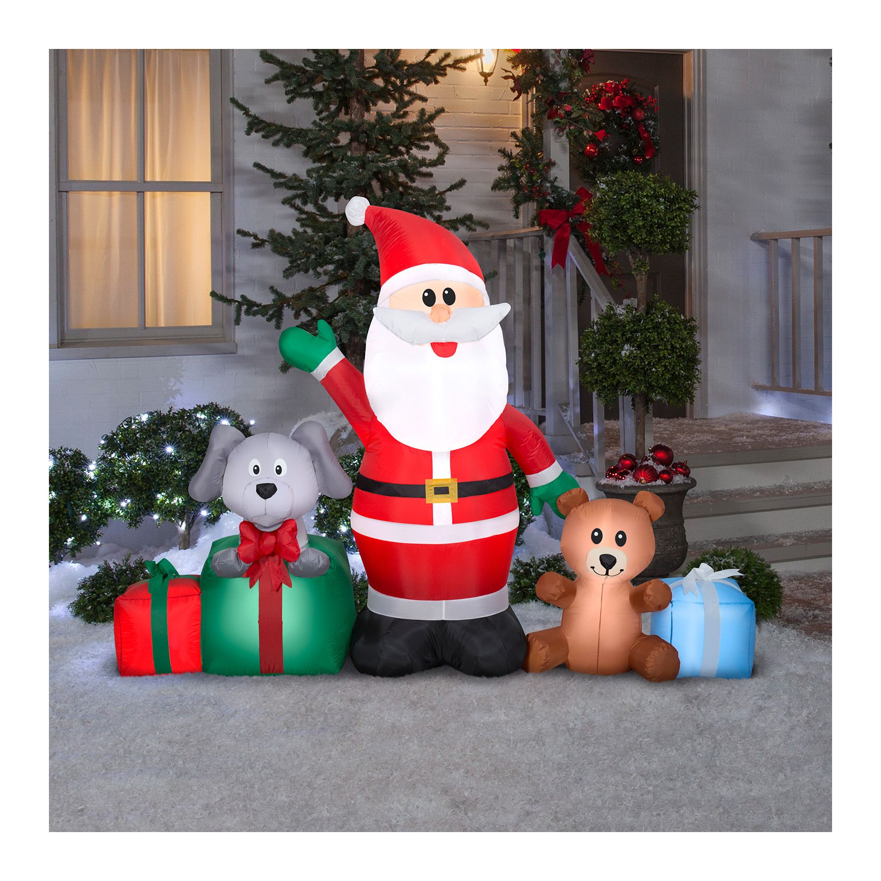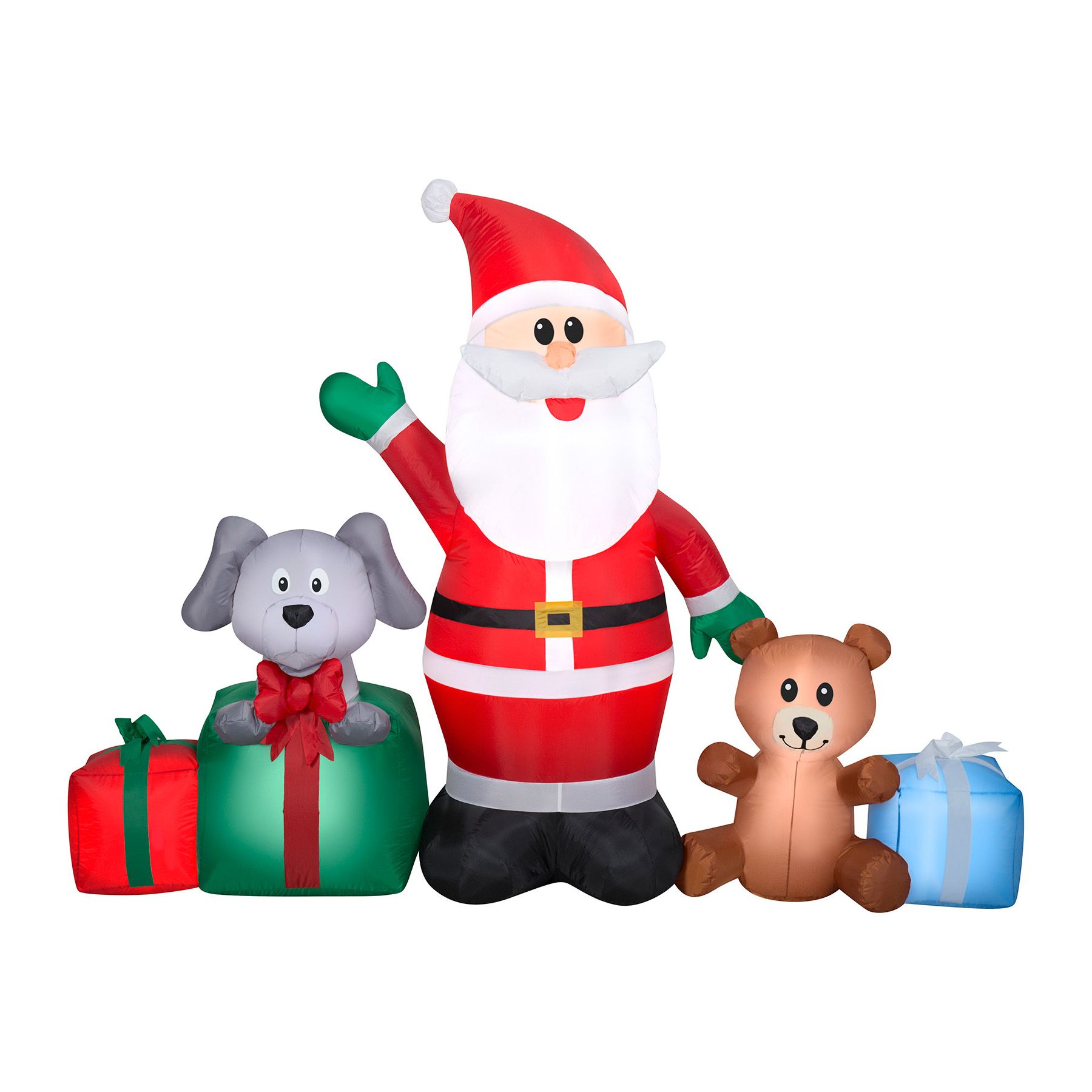 Make it a holly jolly Christmas with an Airblown Inflatable Santa scene. Santa takes center stage in this charming Christmas inflatable that includes a puppy in a green gift box, a teddy bear, and two gift boxes in vibrant red and powder blue. Perfect for indoor or outdoor Christmas decorating, this Santa inflatable makes an eye-catching addition to your outdoor Christmas decorations. Set up is in a snap for the easiest decorating ever. Just plug it in, stake it down, and watch the magic unfold. Be the talk of the block with a Santa Christmas inflatable. Includes everything needed for easy setup.