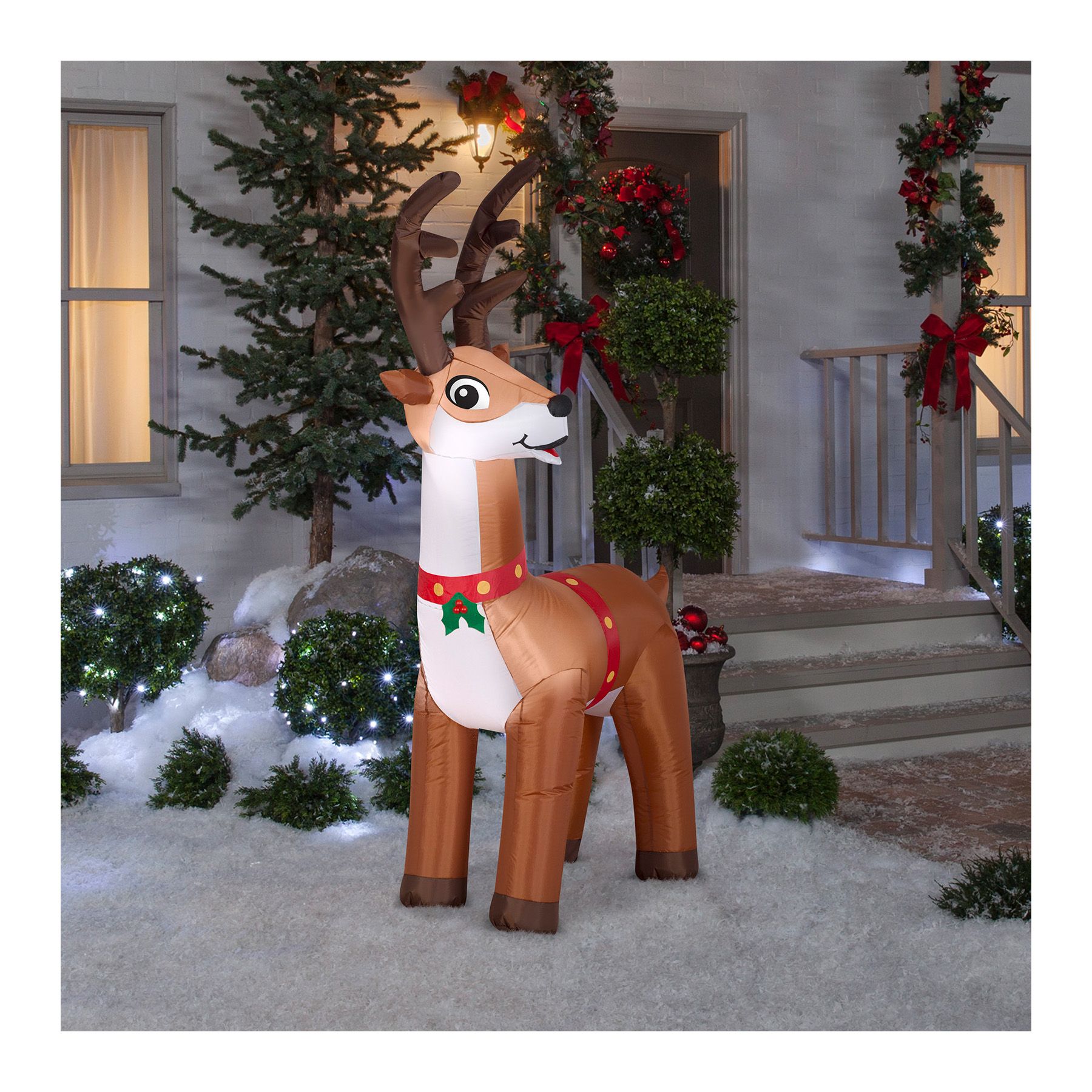 Celebrate the season with an Airblown Inflatable reindeer. This impressive reindeer wears a holly berry collar with red and gold tack. Accented with large antlers, our inflatable reindeer makes an eye-catching addition to your indoor or outdoor Christmas decorations. Set up is in a snap for the easiest decorating ever. Just plug it in, stake it down, and watch the magic unfold. Display this reindeer inflatable as a standalone or combine it with other Airblown Inflatables to create a custom scene. Includes everything needed for easy setup.