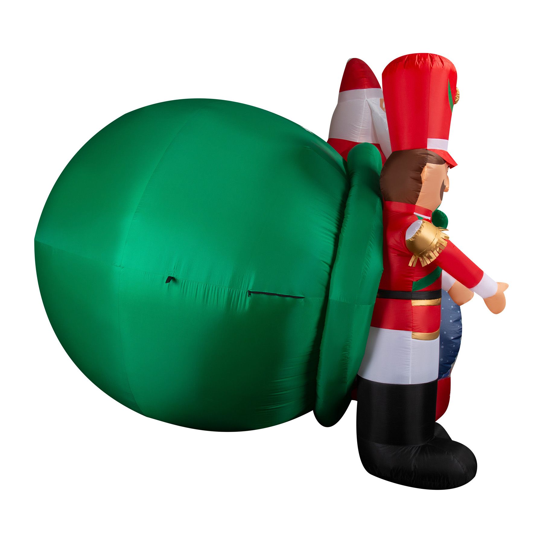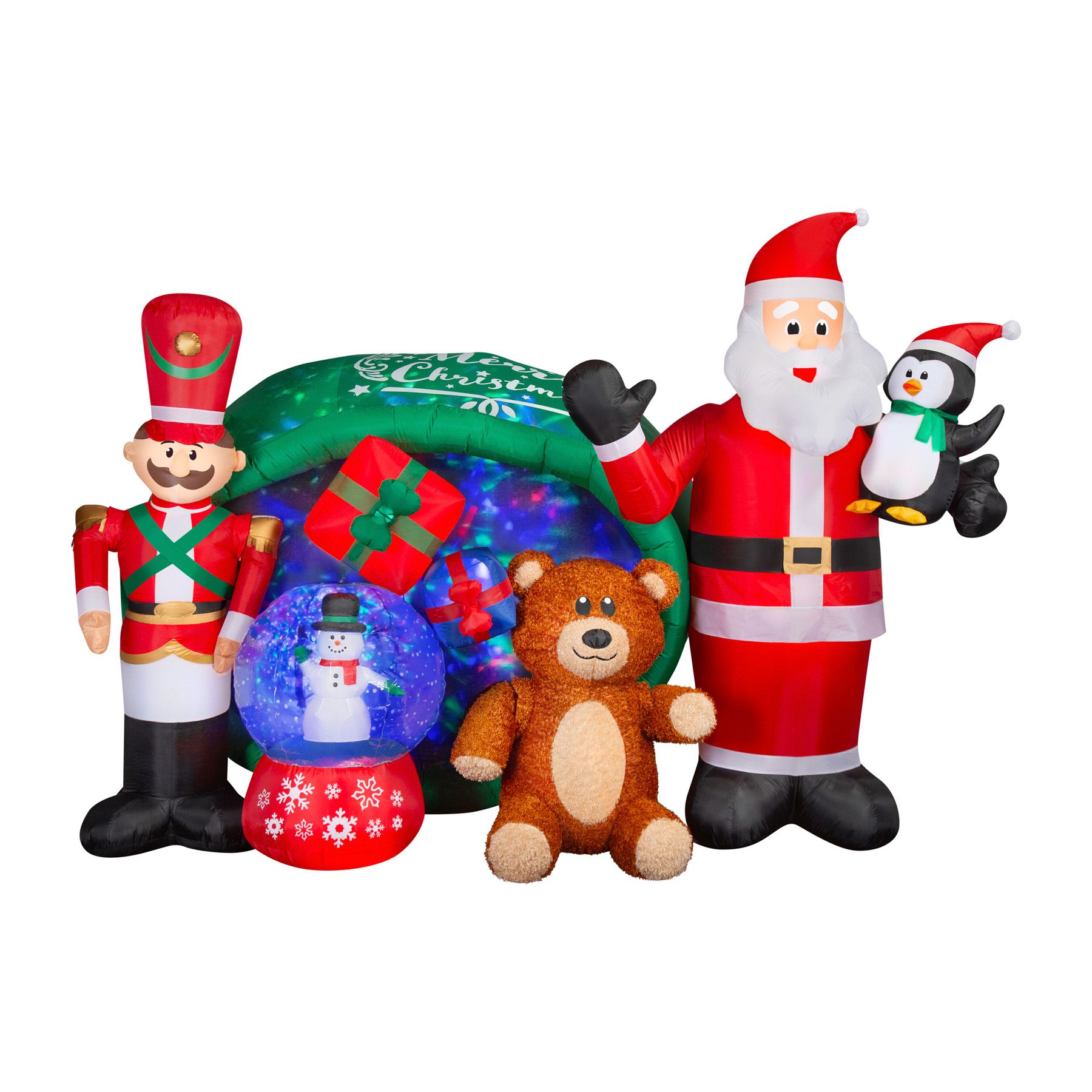Celebrate the season with an animated Airblown Inflatable Santa Gift Sack Scene. This Christmas toy inflatable features a giant gift sack with glittery, swirling kaleidoscope lights. A cast of characters stands at the ready to greet your guests, including an animated toy soldier, a snowman snow globe, an animated teddy bear, and Santa waving a cheery hello as he holds a little penguin. This charming Santa Inflatable sets up in a snap for the easiest Christmas decorating ever. Just plug it in, stake it down, and watch the magic unfold. Includes everything needed for easy setup.