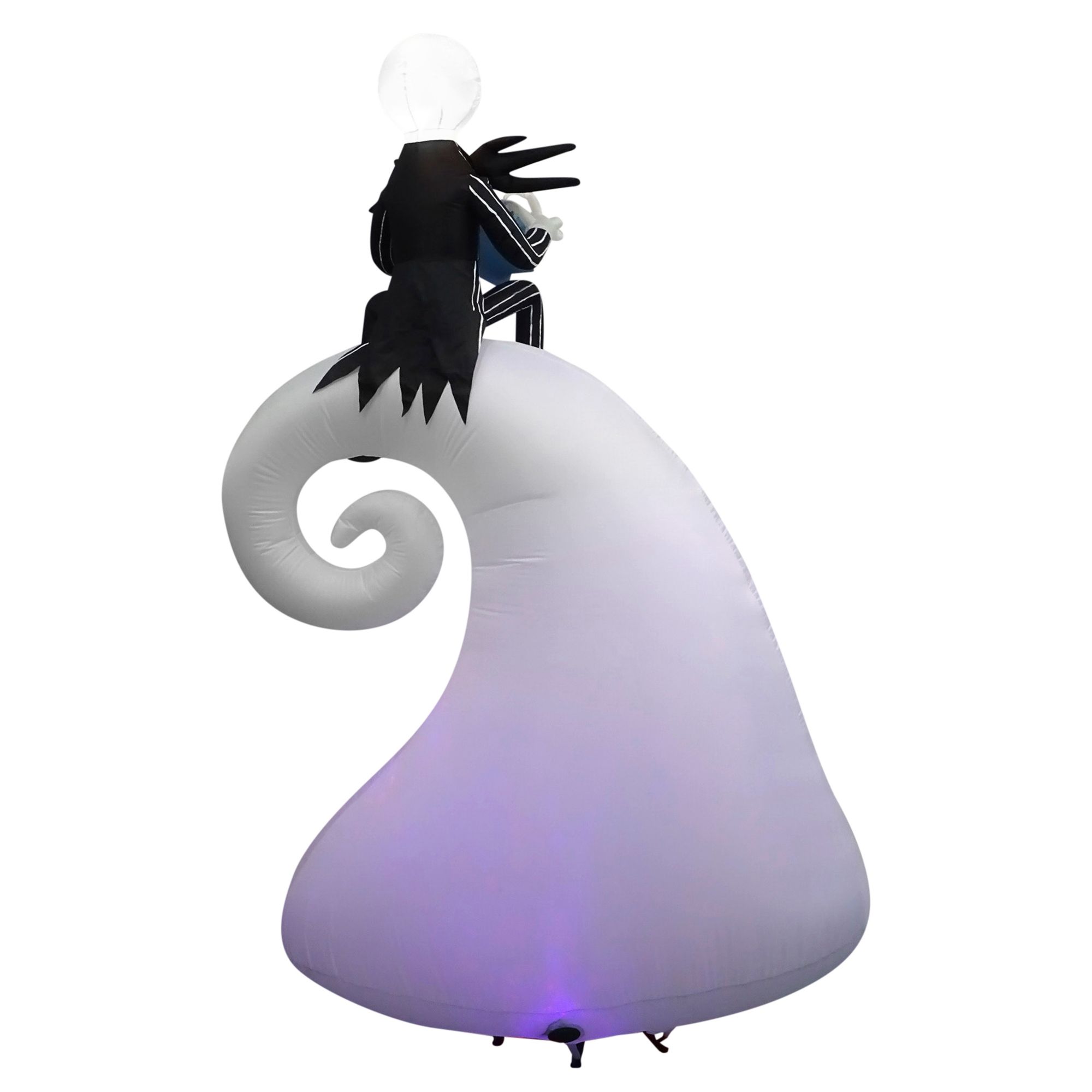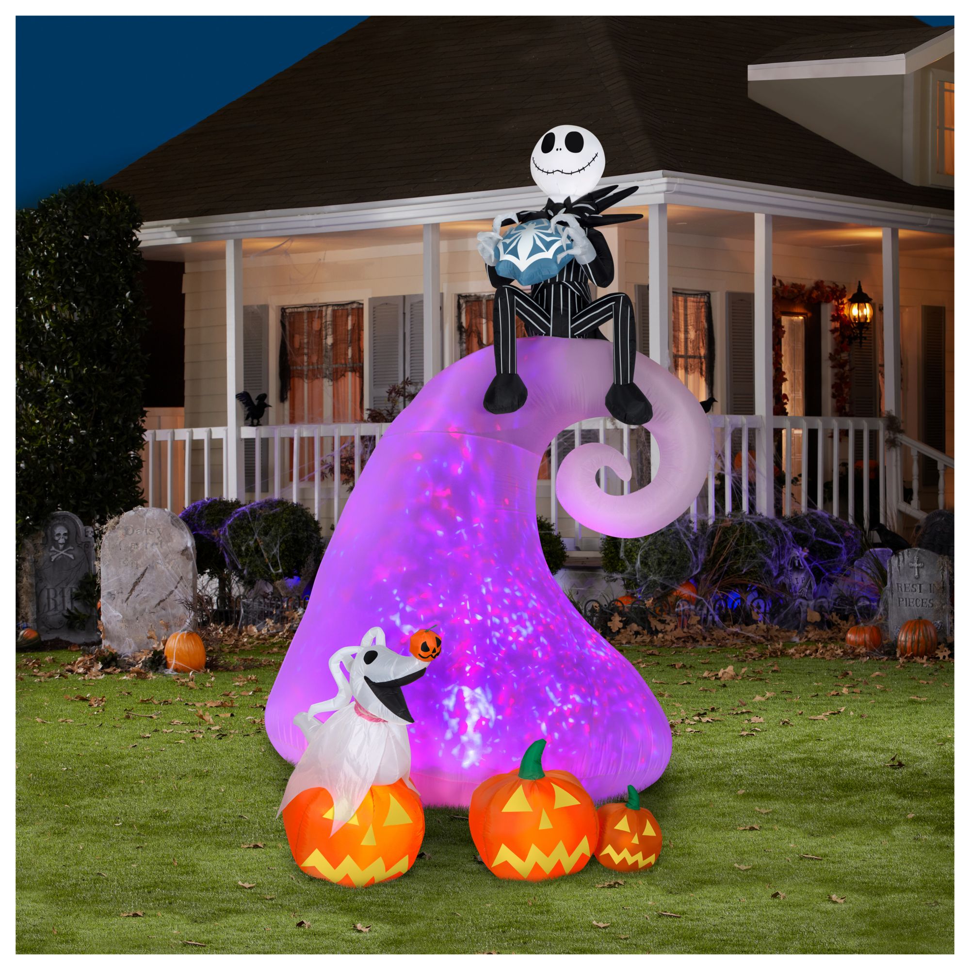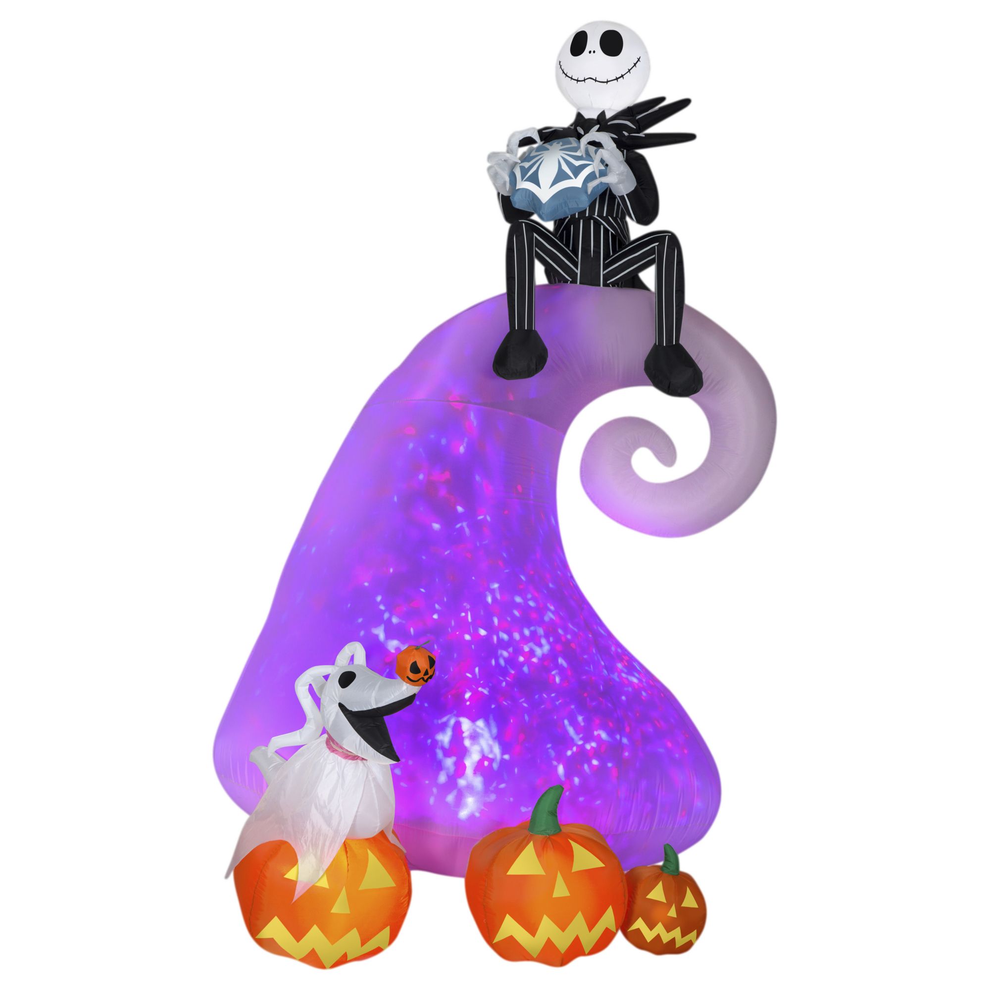 Fans of The Nightmare Before Christmas will love this giant animated Airblown Inflatable featuring Jack Skellington atop the iconic spiral hill in Halloween Town's graveyard. The spiral hill lights up with colorful, swirling Kaleidoscope technology for an eye-popping display. Accented with an animated zero and three jack-o'-lanterns, the 9' Nightmare Before Christmas inflatable makes a spooktacular addition to your Halloween decorations. The setup is super simple. Just plug it in, stake it down and watch the magic unfold. Display this Disney Halloween decoration as a standalone or combine it with other Airblown Inflatables to create a custom scene.