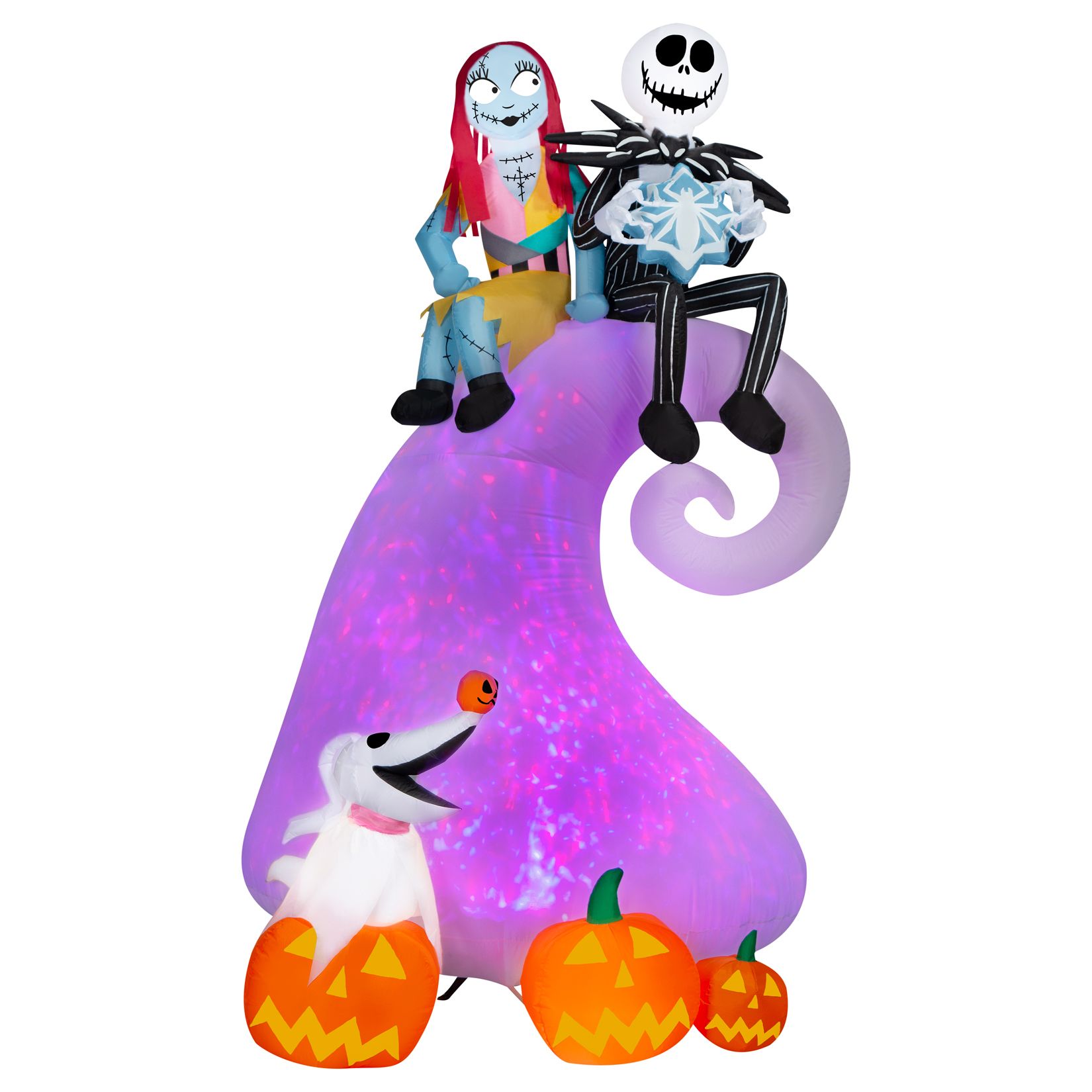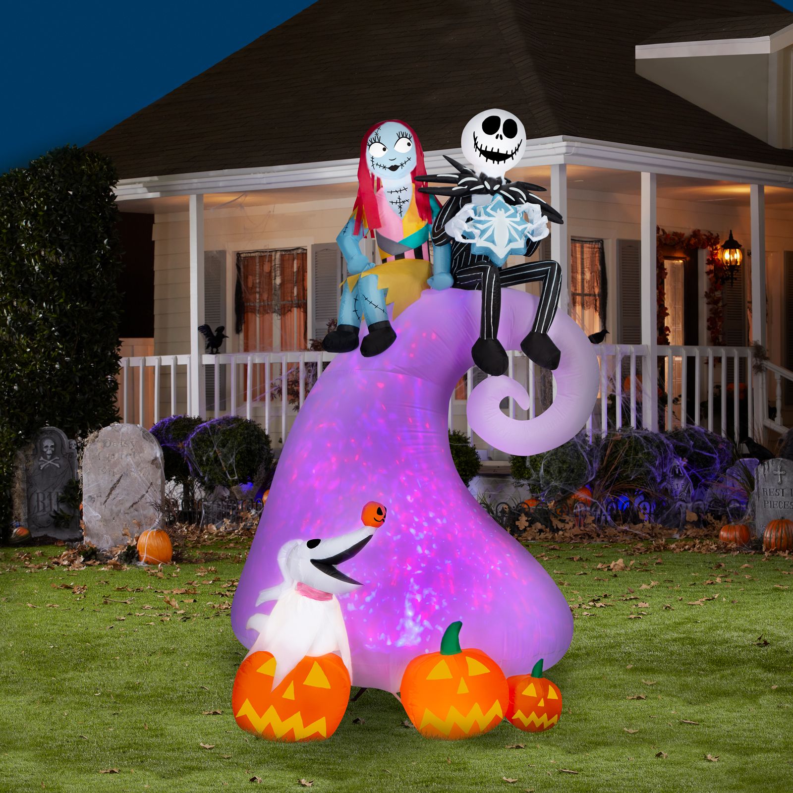 Make a spooktacular addition to your Halloween decorations with an airblown inflatable Jack Skellington and Sally. This eye-catching inflatable features Jack and Sally sitting on top of a hill that lights up with turning, swirling kaleidoscope technology. At the base of the inflatable, Zero turns his head and is joined by a trio of jack-o'-lanterns. Our inflatable sets up in a flash for the easiest Halloween decorating ever. Be the talk of the block with a Jack, Sally and Zero inflatable.