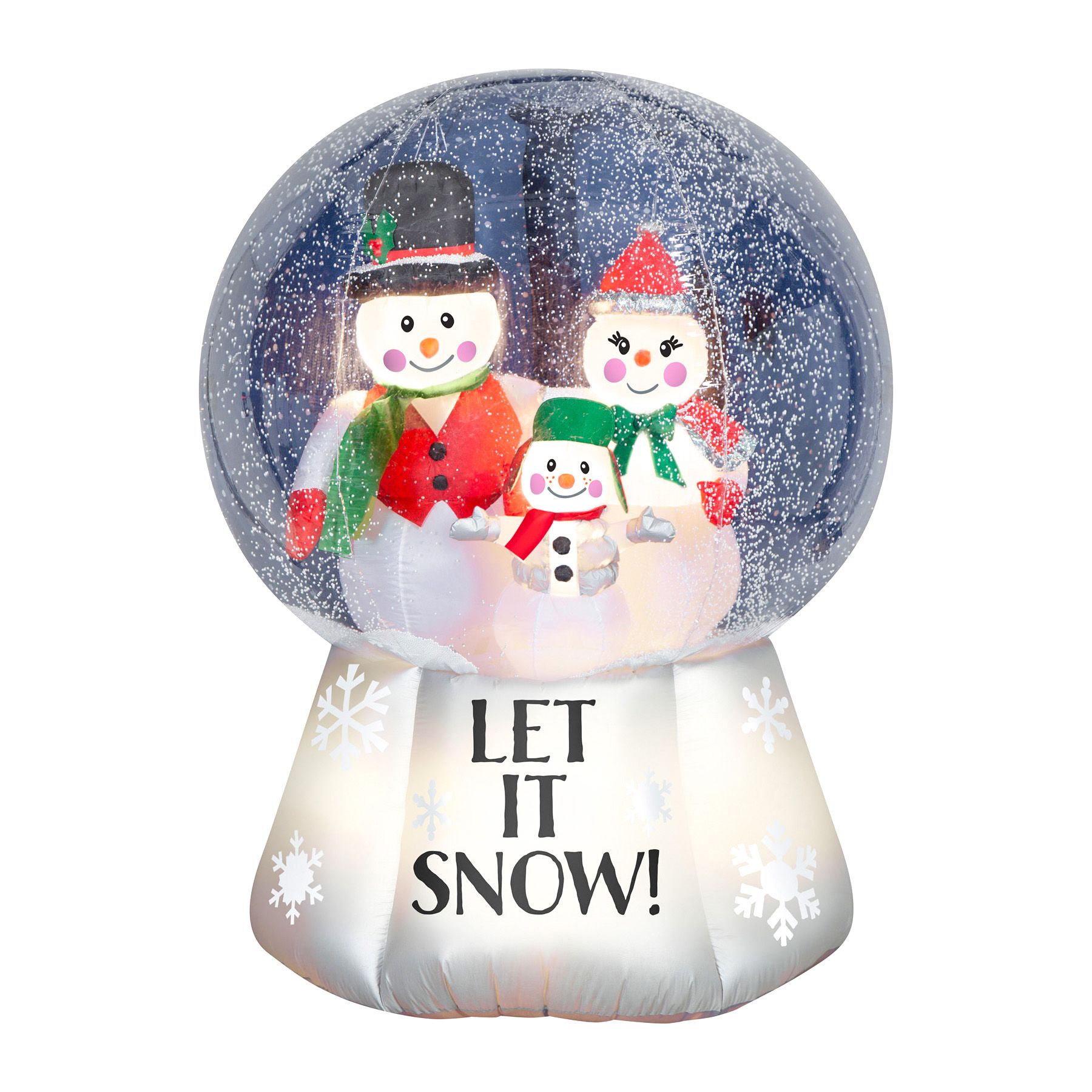 Celebrate the season with an Airblown Inflatable snow globe. An adorable snowman family takes center stage in this charming inflatable snow globe that lights up and swirls with snow. Styled with an iridescent white base, snowflake accents, and a "LET IT SNOW!" sentiment, this snowman inflatable makes an eye-catching addition to indoor or outdoor Christmas decorations. Set up is in a snap for the easiest decorating ever. Just plug it in, stake it down, and watch the magic unfold. Includes everything needed for easy setup.