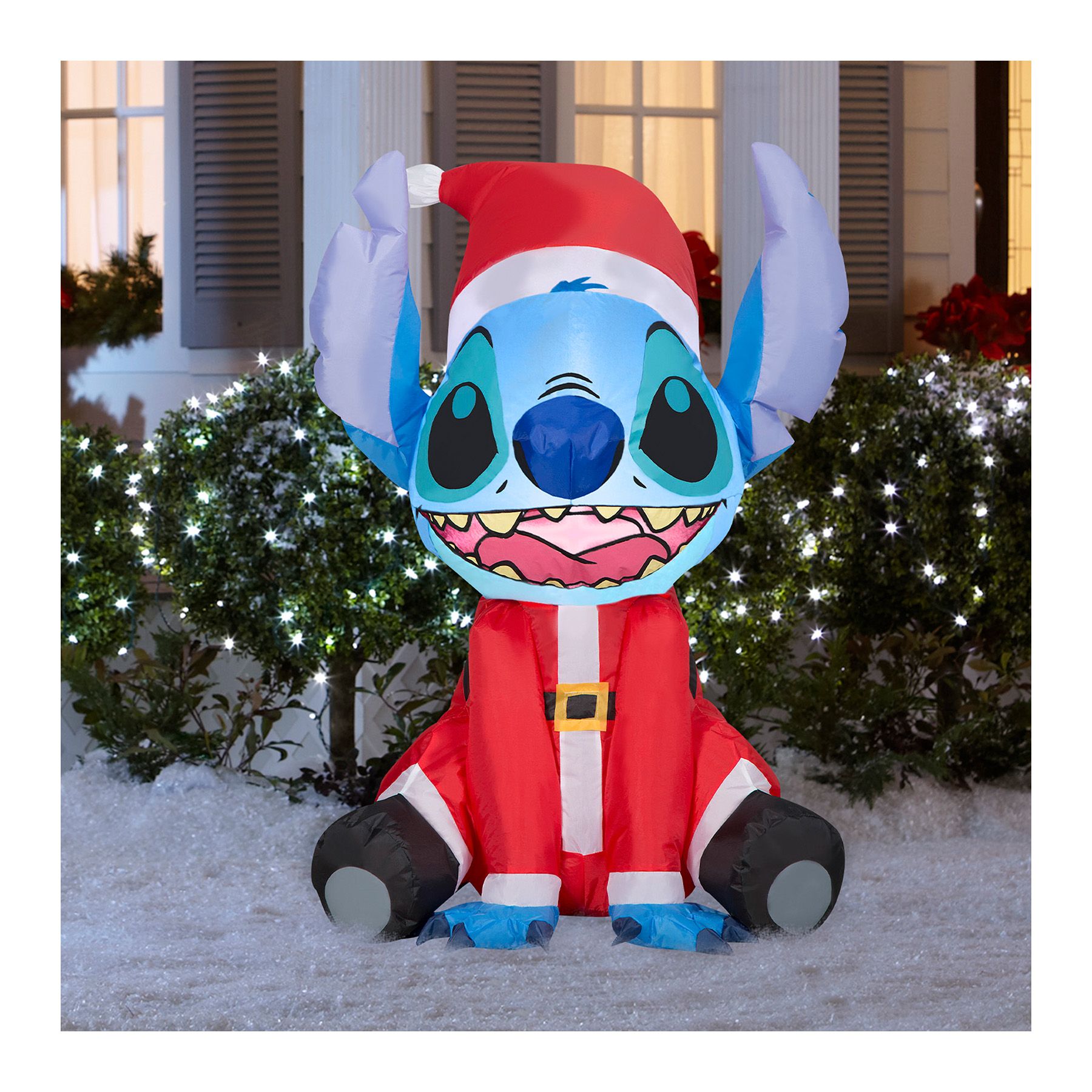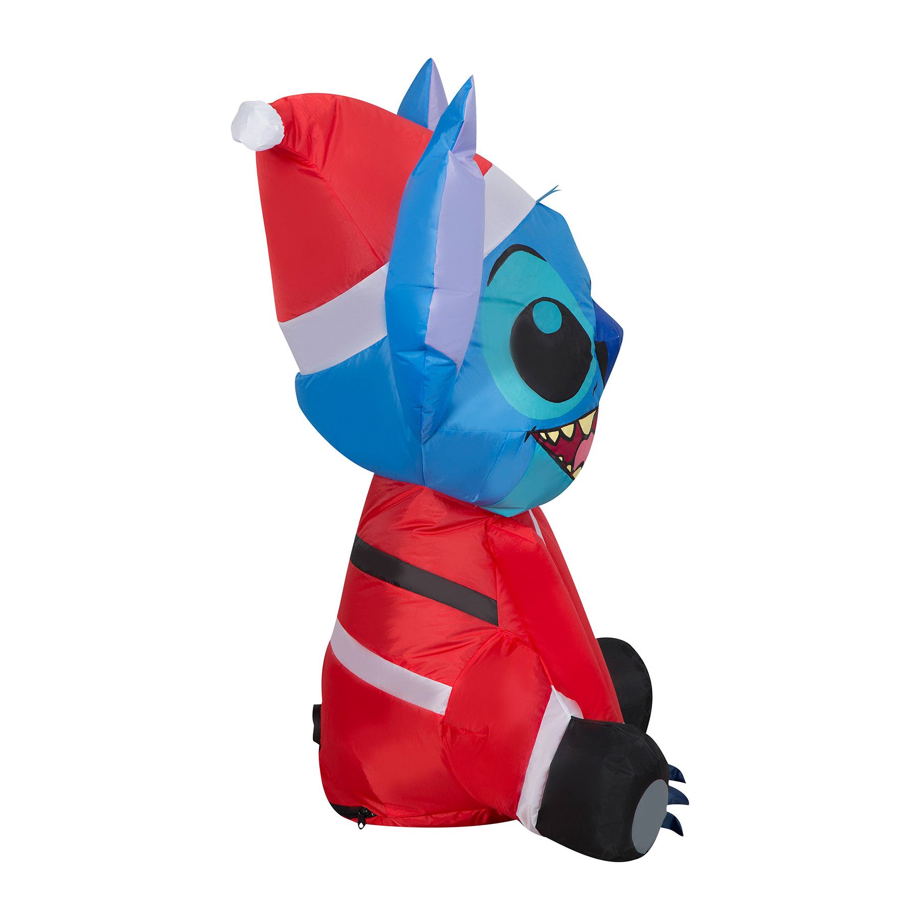 Lilo and Stitch fans will love this Airblown Inflatable Stitch wearing a Santa suit. Featuring everyone's favorite blue alien with a big toothy grin, the Stitch inflatable makes an out-of-this-world addition to your indoor or outdoor Christmas decorations. Set up is a snap for the easiest decorating ever. Just plug it in, stake it down, and watch the magic unfold. Display this Stitch Christmas inflatable as a standalone or combine it with other Airblown Inflatables to create a custom scene. Includes everything needed for easy setup.