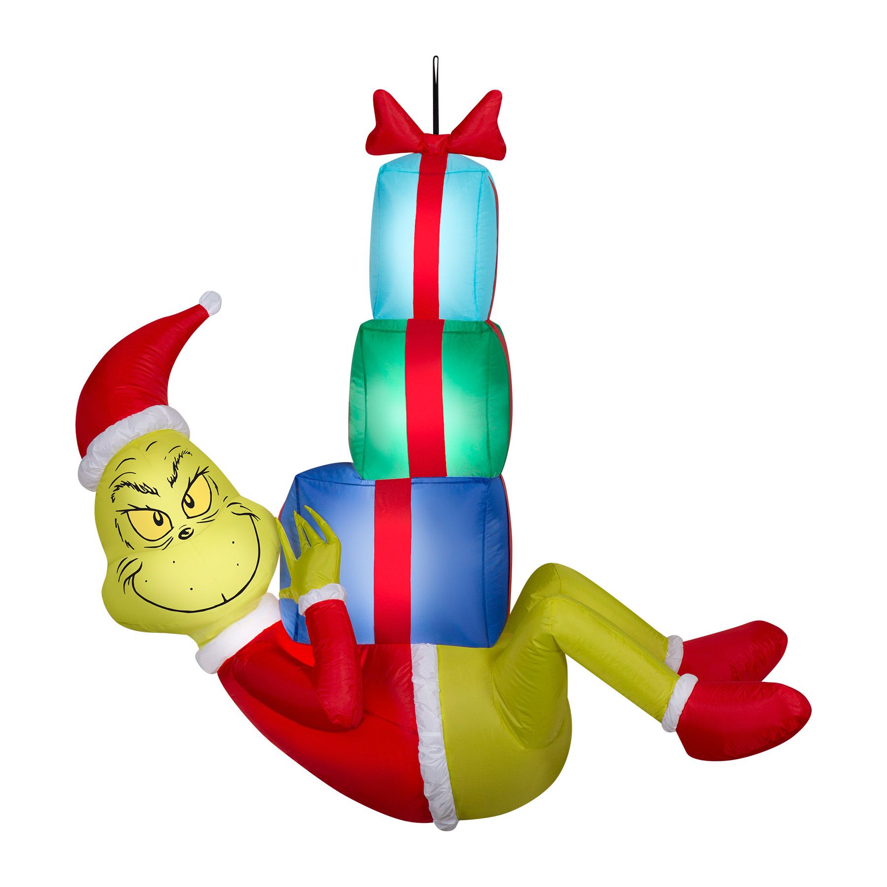 Celebrate the season with a hanging Airblown Inflatable Grinch. Dressed in his Santa suit, the sneaky Grinch holds on for dear life to a trio of colorfully wrapped presents. Perfect along rooflines or anywhere you enjoy hanging Christmas decorations, the unique Grinch inflatable makes a charming addition to your indoor or outdoor Christmas decorations. Set up is a snap for the easiest decorating ever. Just plug it in, hang it, and watch the magic unfold. Includes everything needed for easy setup.
