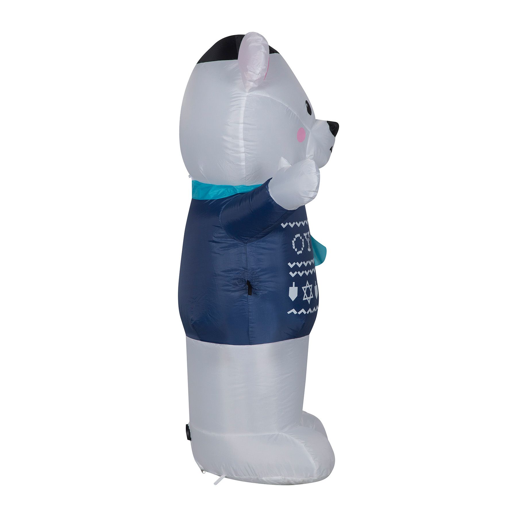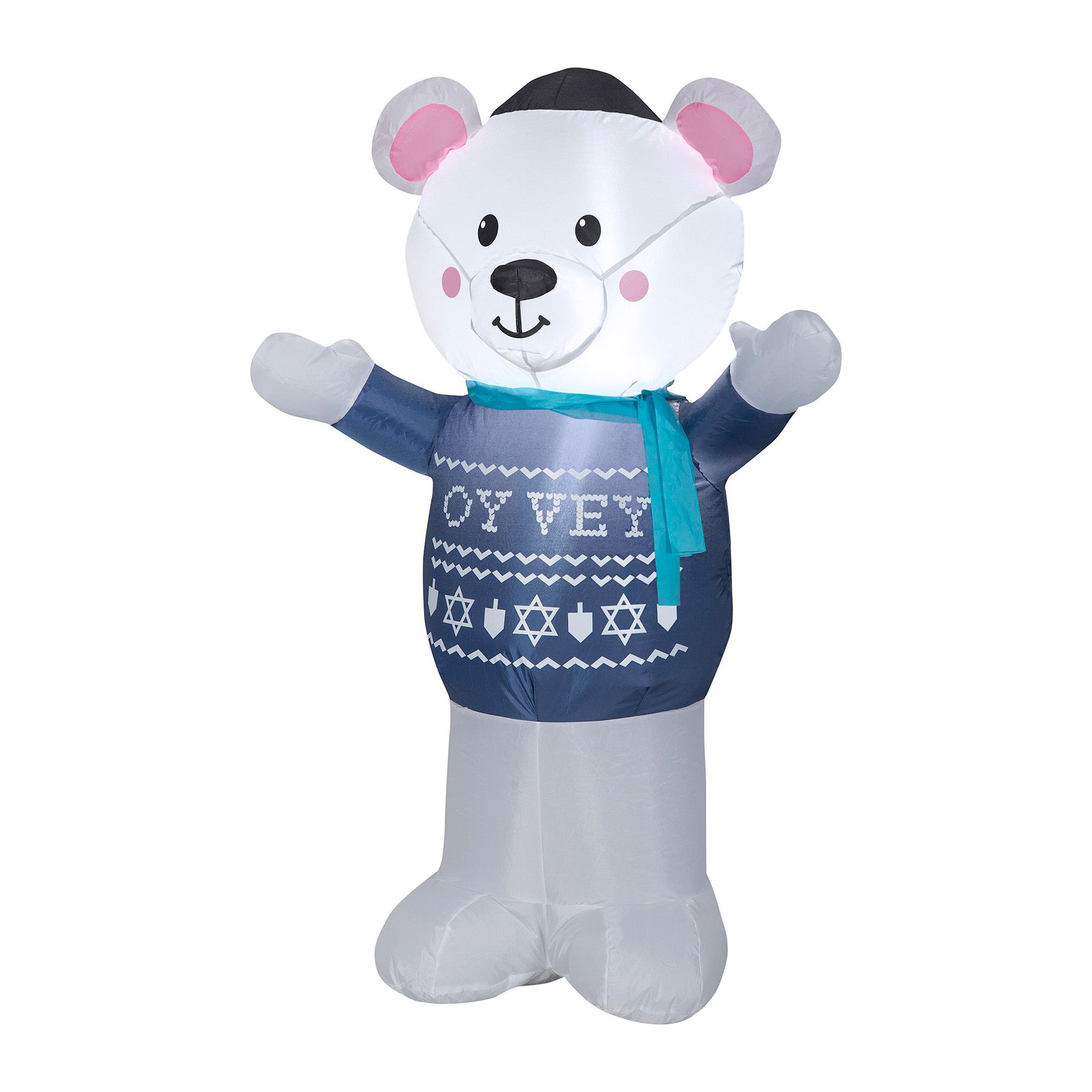 Celebrate Hanukkah with an airblown inflatable polar bear. Styled in a cheery, welcoming pose, this inflatable Hanukkah polar bear wears a yamaka, scarf, and blue fair isle sweater patterned with dreidels, stars of David, and an "Oy Vey" sentiment. This adorable polar bear inflatable makes a delightful addition to your indoor or outdoor Hanukkah decorations. Setup is a snap for the easiest holiday decorating ever. Just plug in your inflatable, stake it down, and watch the magic unfold. Display this polar bear Hanukkah inflatable as a standalone or combine it with other Airblown Inflatables to create a custom scene. Includes everything needed for easy setup.