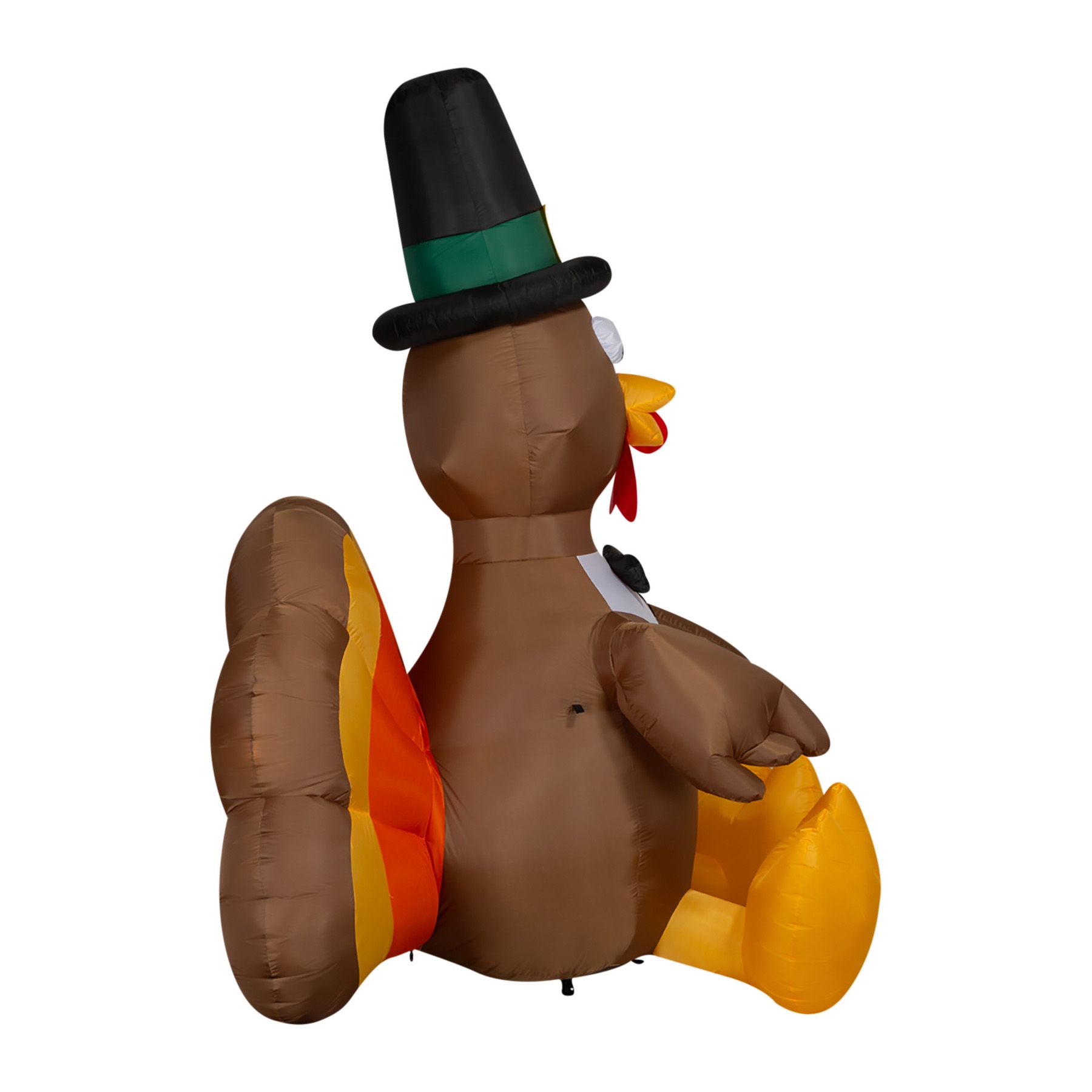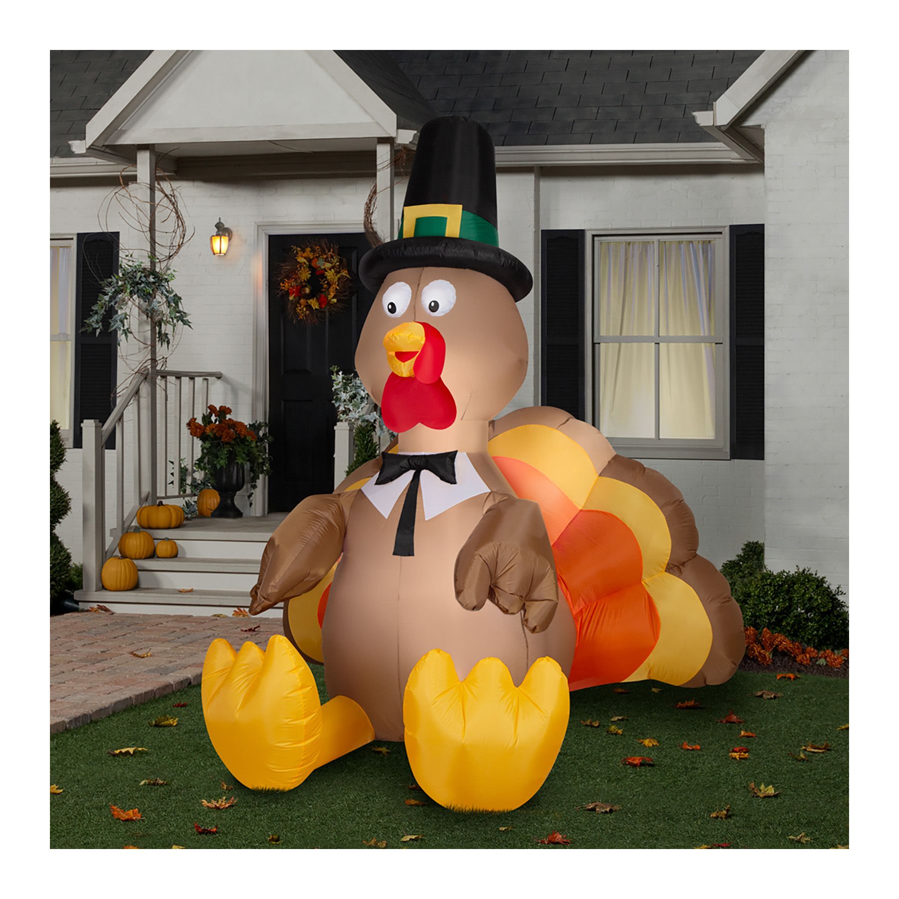 Get in the mood to celebrate this Thanksgiving with the Gemmy Inflatable Turkey. Measuring 5’D x 7’W x 8’H, you will be the envy of your neighbors this holiday season. This charming, attention-getting turkey comes trussed up in a Pilgrim hat and collar. Yellow feet and a multi-colored tail complete his stylish look. Best of all, this inflatable is so easy to set up that your yard will look festive in just minutes. Nothing says “Gobble, Gobble” like this one-of-a-kind Thanksgiving inflatable turkey.